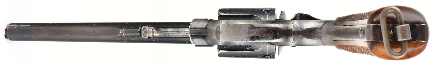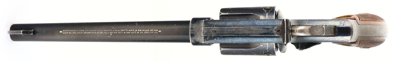 WWI, Smith & Wesson, .38 M&P Hand Ejector Model 1902 2nd Change - Canadian Military Marked, CAL: 38 S&W SPL, MFG: 1903, SN: 21877, Double Action Revolver, 6 1/2'' barrel. The original S&W logo medallion checkered wood grips are excellent. There are only minor handling marks to the finish. The medallions have an aged patina. The original metal blue finish rates 90% on the barrel & 80% on the frame. The barrel has numerous small chatter marks & holster wear. The frame has concentrated loss to the straps & surrounding areas, with areas worn to metal gray & toned to a brown patina. Bore is excellent. Adjustable rear sight & tall blade front sight. Lanyard loop present. The top of the barrel has the standard two line address & patent dates & the left side of the barrel has the caliber marking. There is a faint import stamp on the bottom of the barrel. The Canadian ''C'' Broad Arrow'' marking can be seen on the left side of the frame at the knuckle. This revolver is accompanied by a 2004 S&W Factory Letter, confirming the age history of this revolver. FFL or C&R Req. - Value: 1500 to 3000