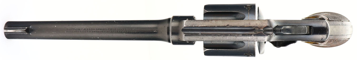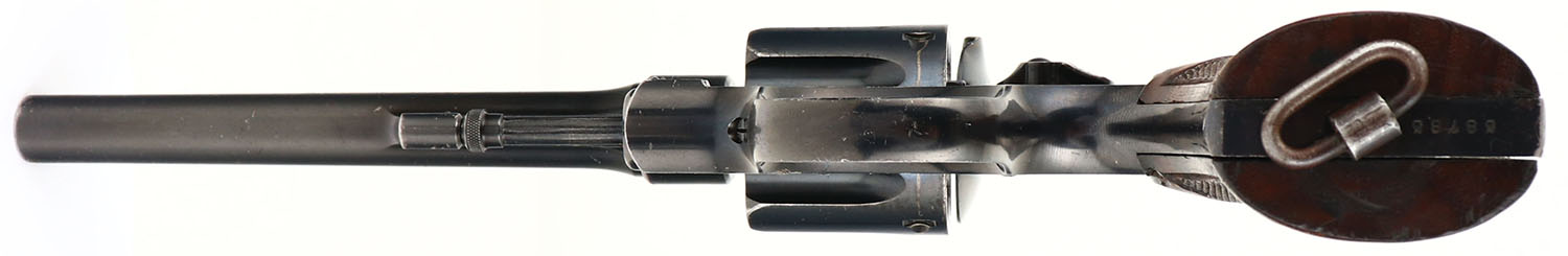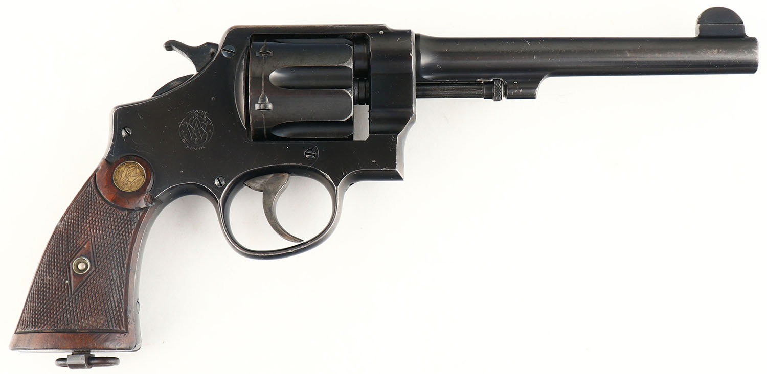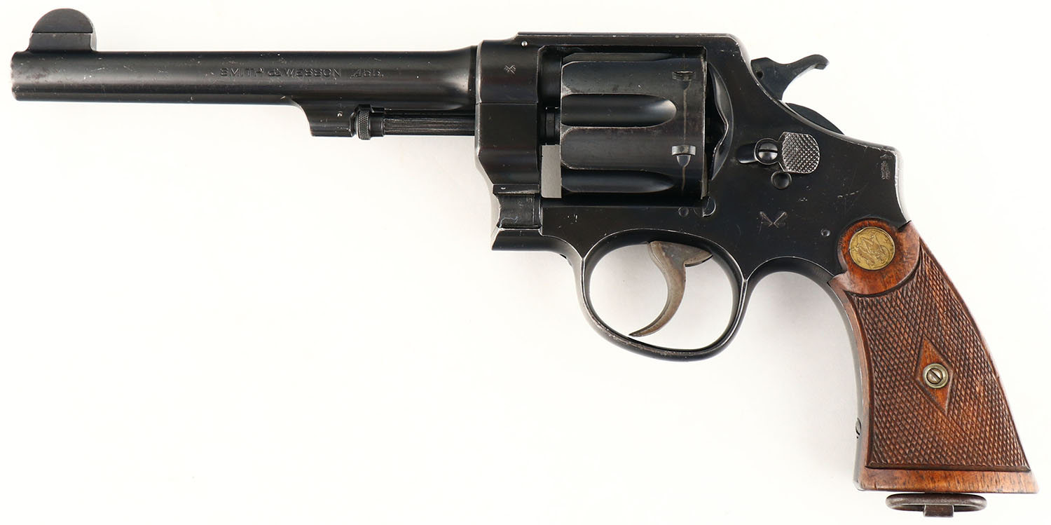 Smith & Wesson, Model MK II Hand Ejector 2nd Model, CAL: 455 Webley, MFG: 1908-15, SN: 58785, Double Action Revolver, 6 1/2'' barrel. This example was from the second batch of S&W .455 revolvers that were sent to England in 1915. There were a total of appx 55,000 pistols supplied to Britain. The first batch (Triple Lock) was the Mk I, & these HE models were designated Mk II. The revolvers carries the standard S&W address & patent date on top[ of the barrel. The left side of the barrel is marked ''SMITH & WESSON .455''. The S&W trademark logo can be seen on the right side of the frame. The left side of the frame by the knuckle is marked with British acceptance marks & the standard Mk II stamp. There are also proofs on the left side of the frame, ahead of the cylinder & below the latch is the double Broad Arrow mark that designates it was sold out of service. The S&W logo medallion checkered wood grips are very good. There is a small edge chip on the top front edge of the right grip, along with other contusions & dings. The original metal blue finish rates 90% overall. Bore is very good & bright, with intermittent roughness. U-notch groove rear sight & blade front sight. Lanyard loop present. A nice example of a WWI era British used Mk II. FFL or C&R Req. - Value: 1100 to 1500