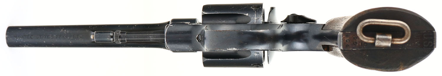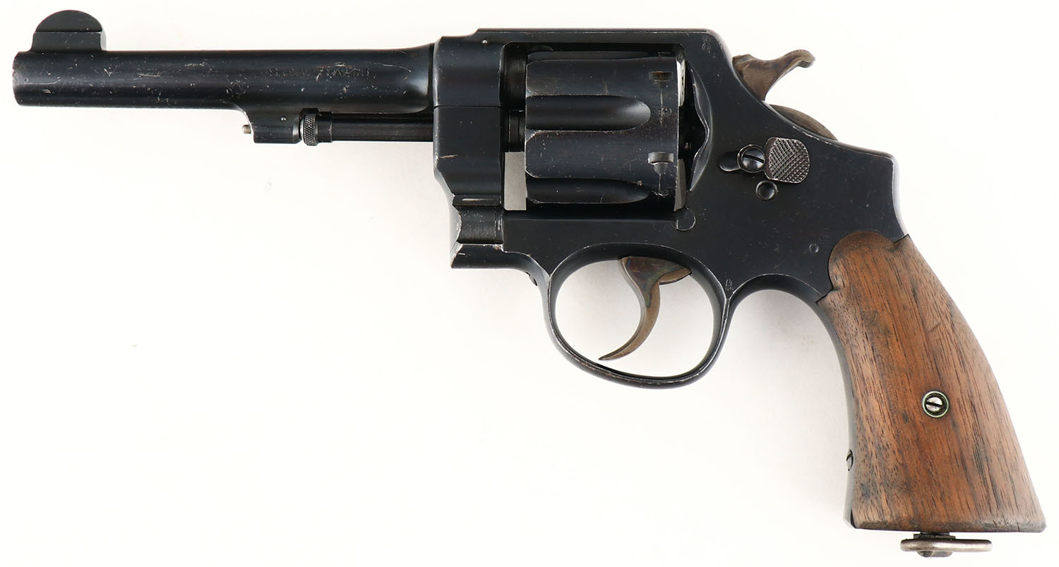 WWI, Smith & Wesson, US Army Model 1917 - England Lend Lease, CAL: 45 ACP, MFG: 1918, SN: 96804, Double Action Revolver, 5 1/2'' barrel. The original smooth wood grips are very good & solid. The top front corner of the right grip has an edge chip, along with other contusions & dings throughout. The original metal blue finish rates 95% overall, with intermittent chatter marks & light spotting, toned to a brown patina. Bore is excellent. The case-hardened trigger & hammer retain excellent case-colors. U-notch groove rear sight & tall round blade front sight. Standard S&W address & patent dates on the barrel. British proofs can be seen on the right side of the frame, barrel & on the cylinder. The right side of the frame is marked ''NOT ENGLISH MAKE''. US proofs can be seen on the left side of the frame & inside cylinder housing. The butt is marked ''US ARMY MODEL 1917 No. 96804. (Credit: Pistols of World War I by Robert J. Adamek) '' Only several thousand 1917's were sent to England during the great war and are not commonly encountered.'' FFL or C&R Req. - Value: 1200 to 1800