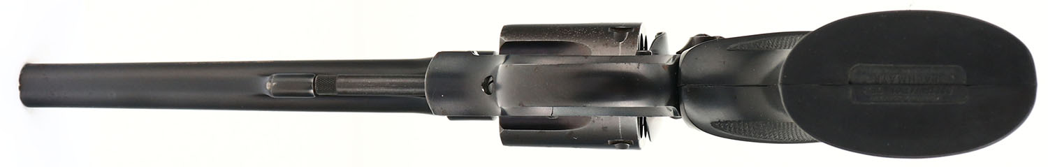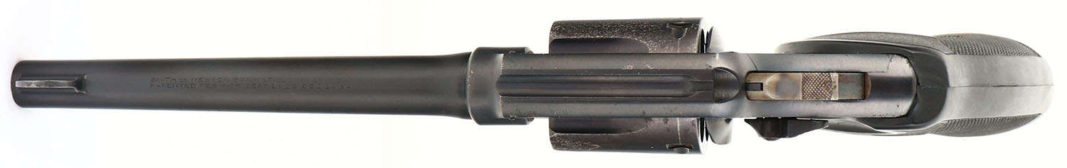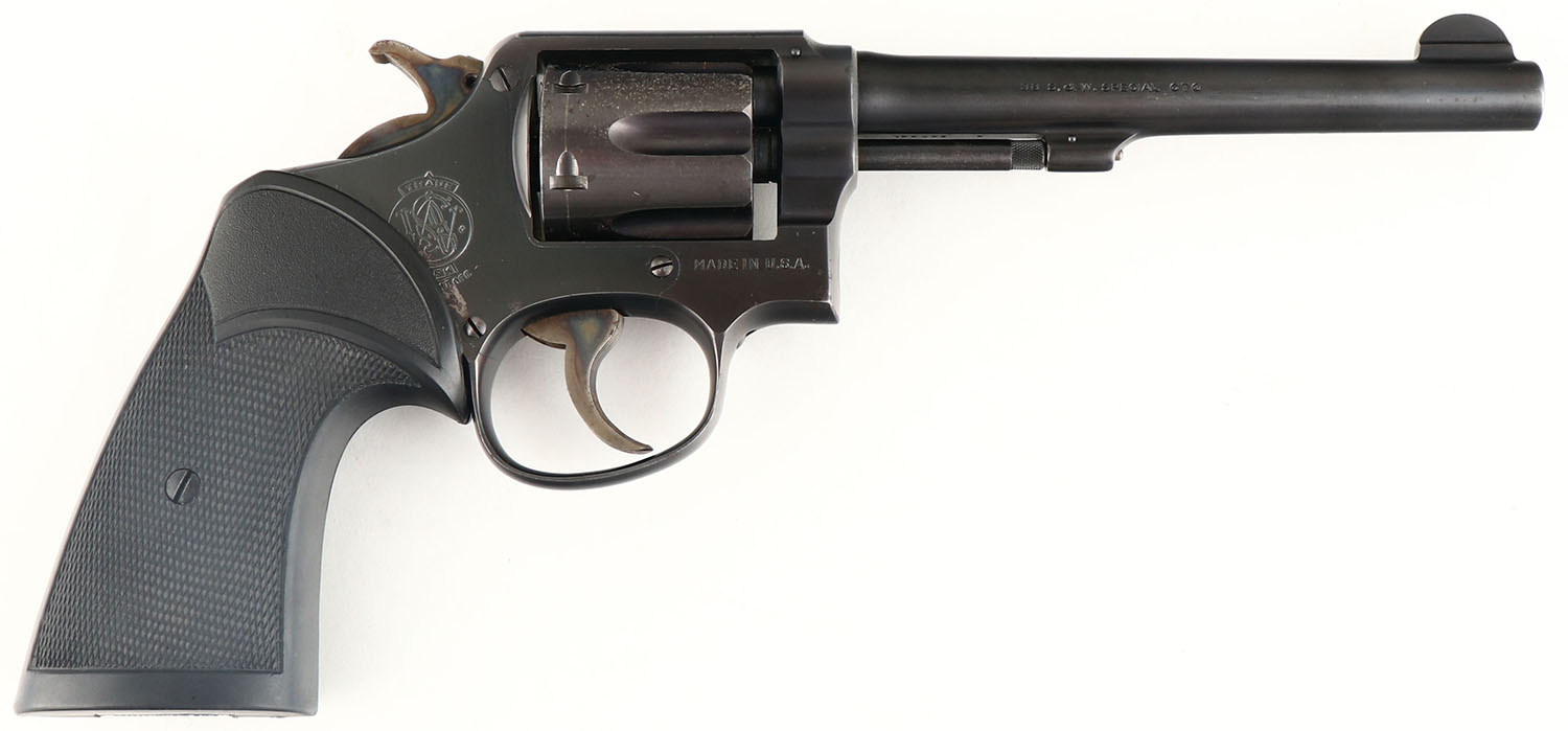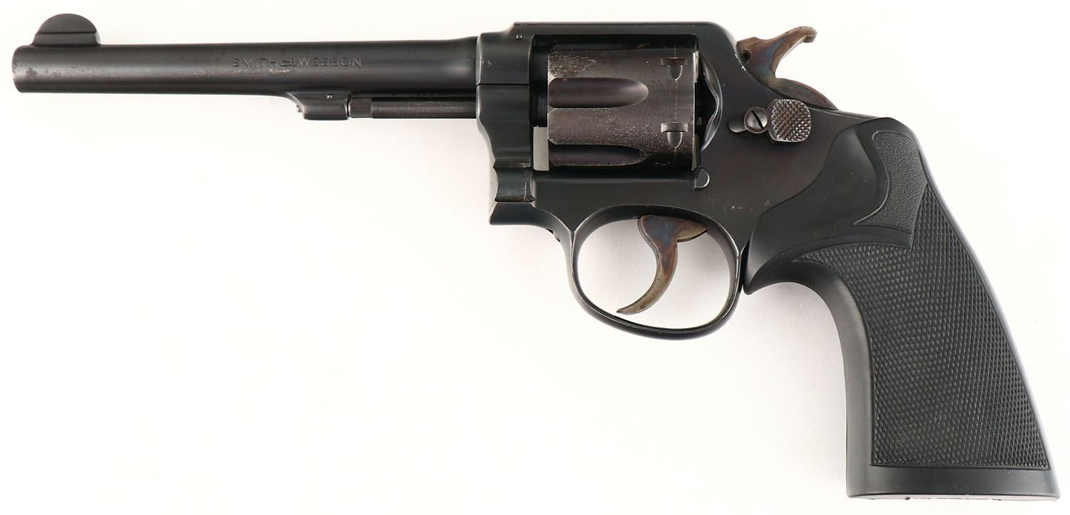 Smith & Wesson, .38 M&P (Post War) - Pre-Model 10 Transitional Model, CAL: 38 S&W SPL, MFG: 1945-47, SN: S940351, Double Action Revolver, 5'' barrel. The aftermarket Pachmayr checkered rubber grips are excellent. There are some minor handling marks from use. The original metal blue finish rates 85% on the barrel & frame. The cylinder rates 60%, with consistent spotting, toned to metal gray & thin brown patina. The case-hardened hammer & trigger retain excellent case-colors. Bore is excellent. Integral square notch rear sight & round blade front sight. FFL or C&R Req. - Value: 300 to 600