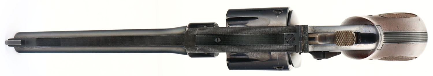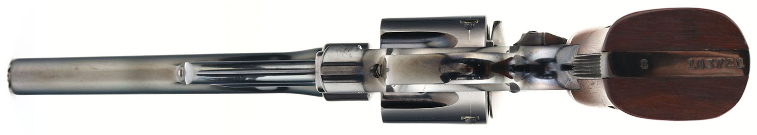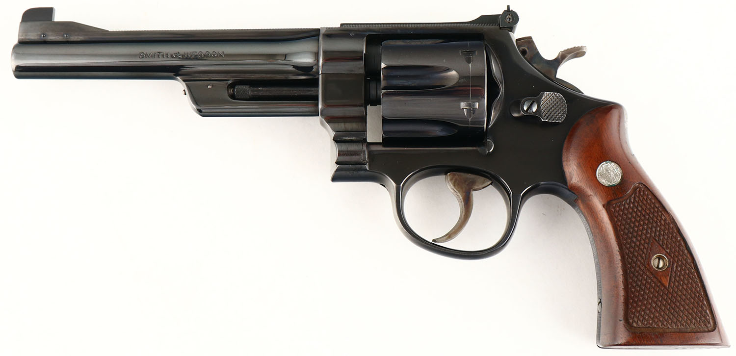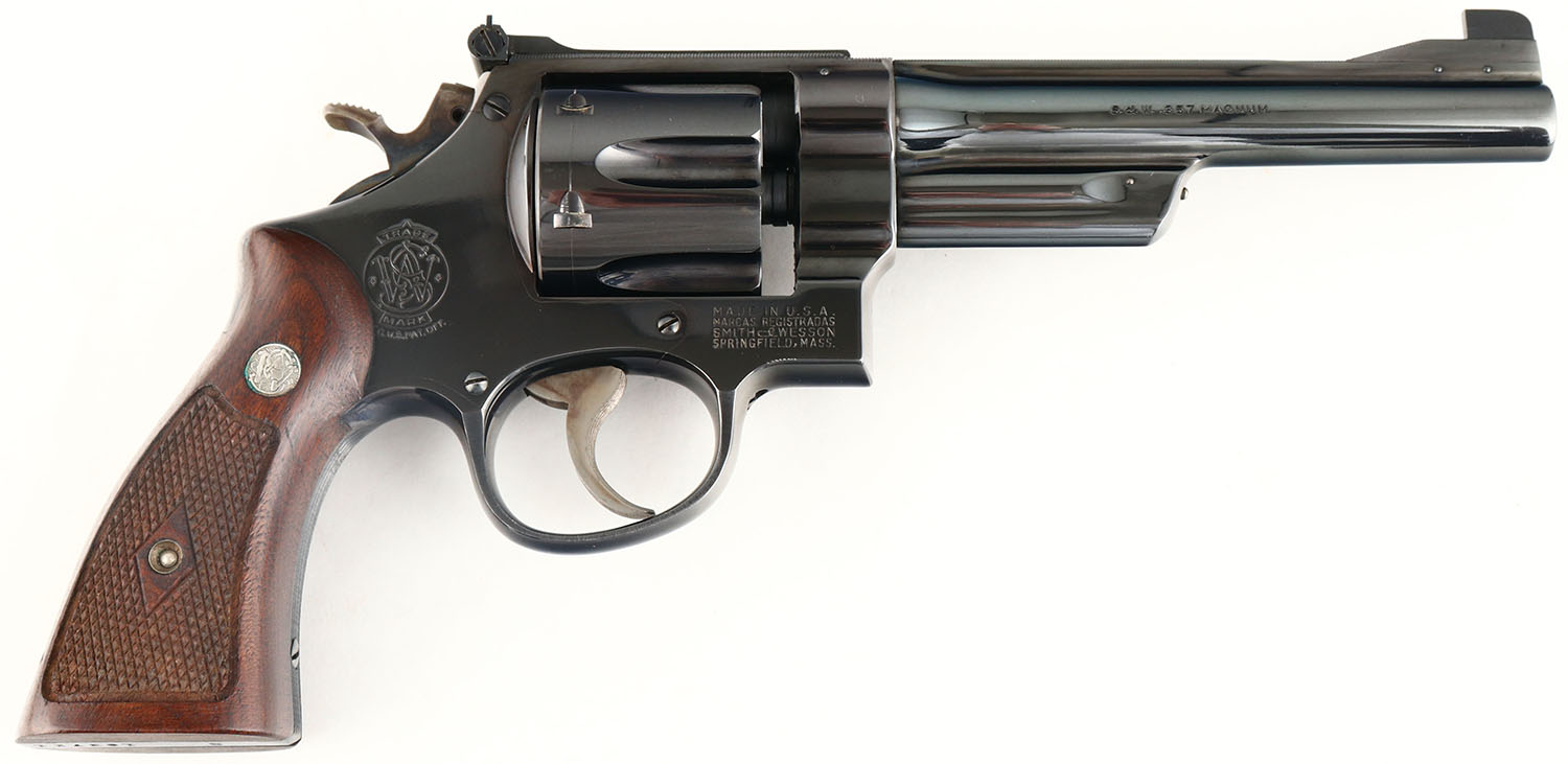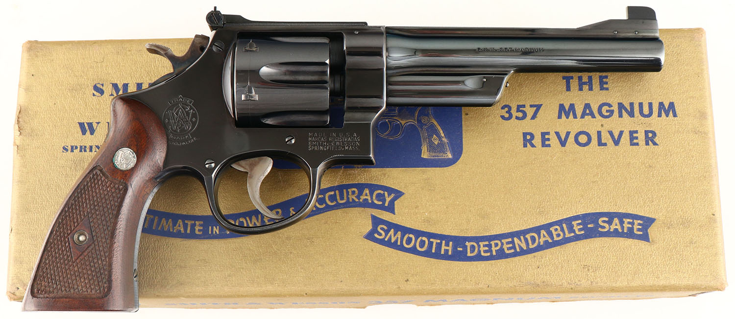 EXCEPTIONAL BOXED, Smith & Wesson, .357 Magnum ''Pre-Model 27'', CAL: .357 MAG, MFG: 1952-53, SN: S103721, Double Action Revolver, 6'' barrel. The original S&W logo medallion checkered wood grips are near mint. The original metal blue finish on the barrel rates 98%, the frame rates 99%, & the cylinder has a faint drag line. The case-hardened trigger & hammer retain excellent case-colors. Bore is excellent. Adjustable rear sight & ramp elevated blade front sight. Matted rib. Comes in factory SN matching box, with owners manual, tool & cleaning brush. The matching SN is written on the bottom of the box. A pistol that is hard to improve & desirable for S&W collectors. FFL or C&R Req. - Value: 1700 to 2500