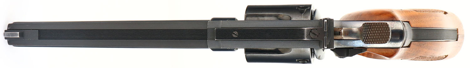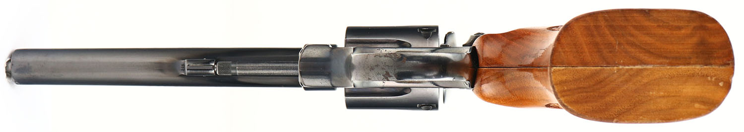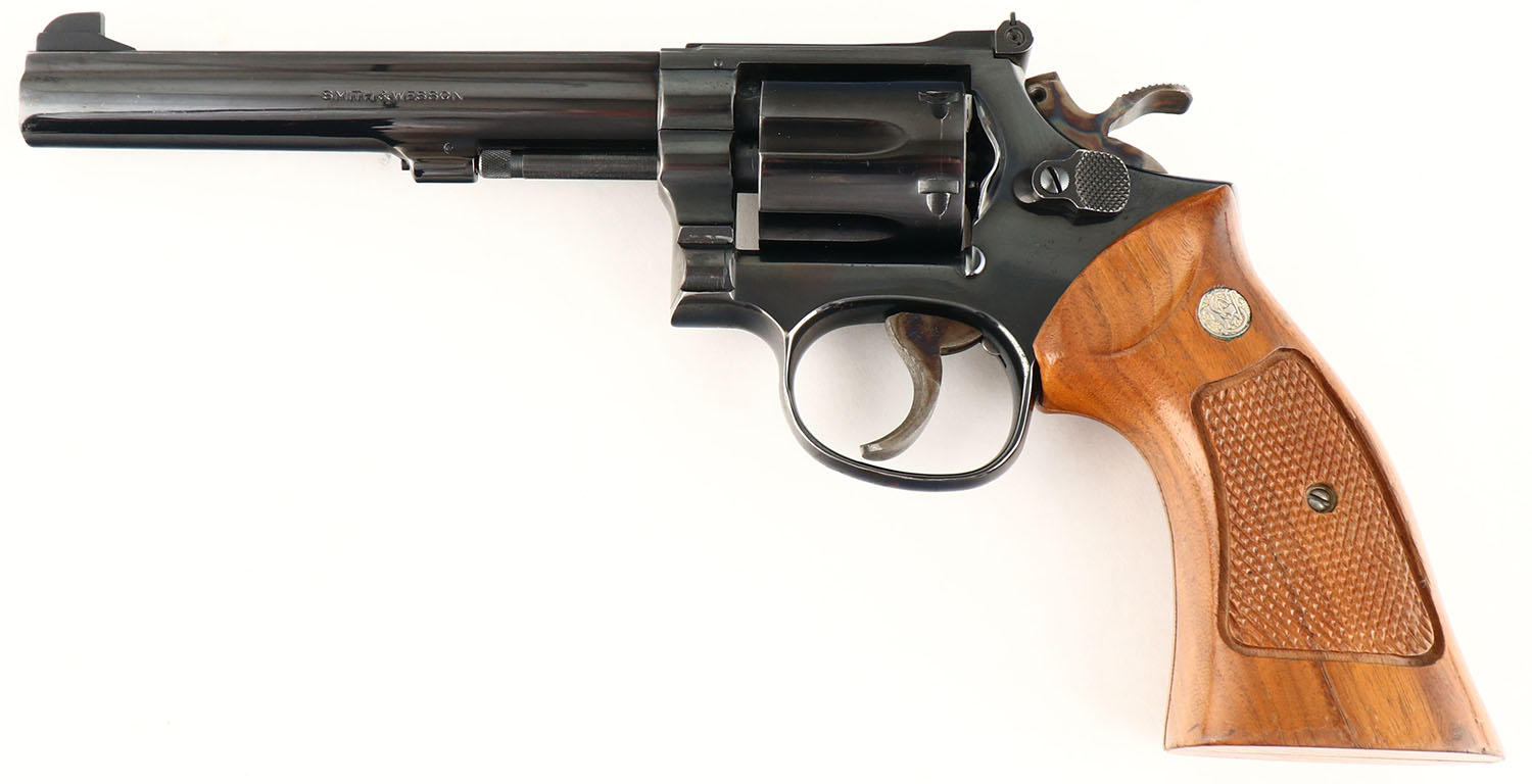 Smith & Wesson, Model 14-3, CAL: 38 S&W SPL, MFG: 1977, SN: 16K3100, Double Action Revolver, 6'' barrel. The S&W logo medallion checkered wood grips are very good. There are contusions, dings & areas of the high gloss finish are beginning to dull. The original metal blue finish rates 90% overall, with concentrated wear to the muzzle & intermittent speckling on the frame, toned to a brown patina. Case-hardened trigger & hammer. Bore is excellent. Adjustable rear sight & ramp elevated blade front sight. FFL Req. - Value: 400 to 600