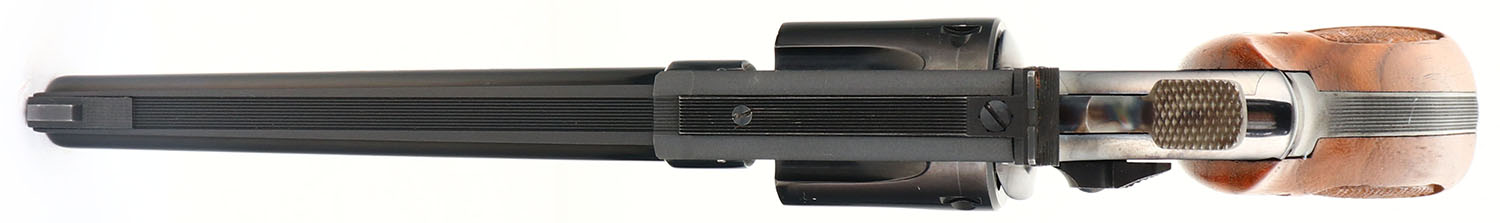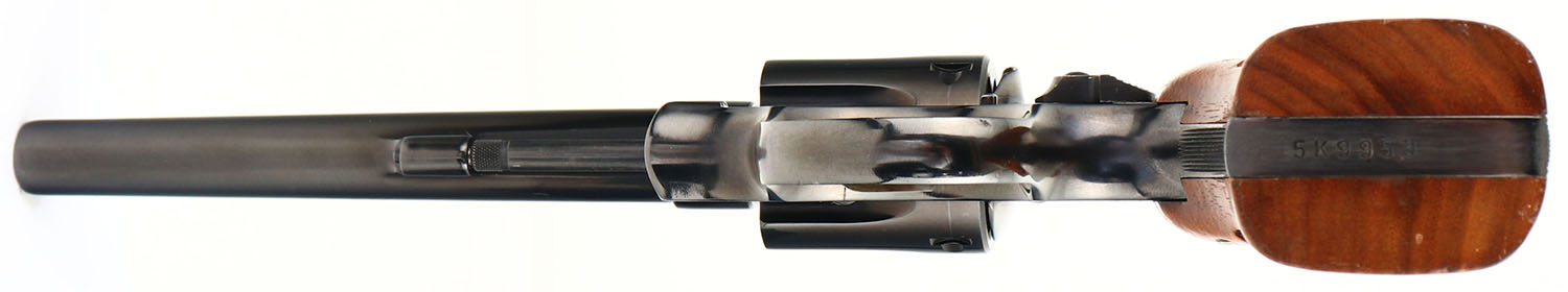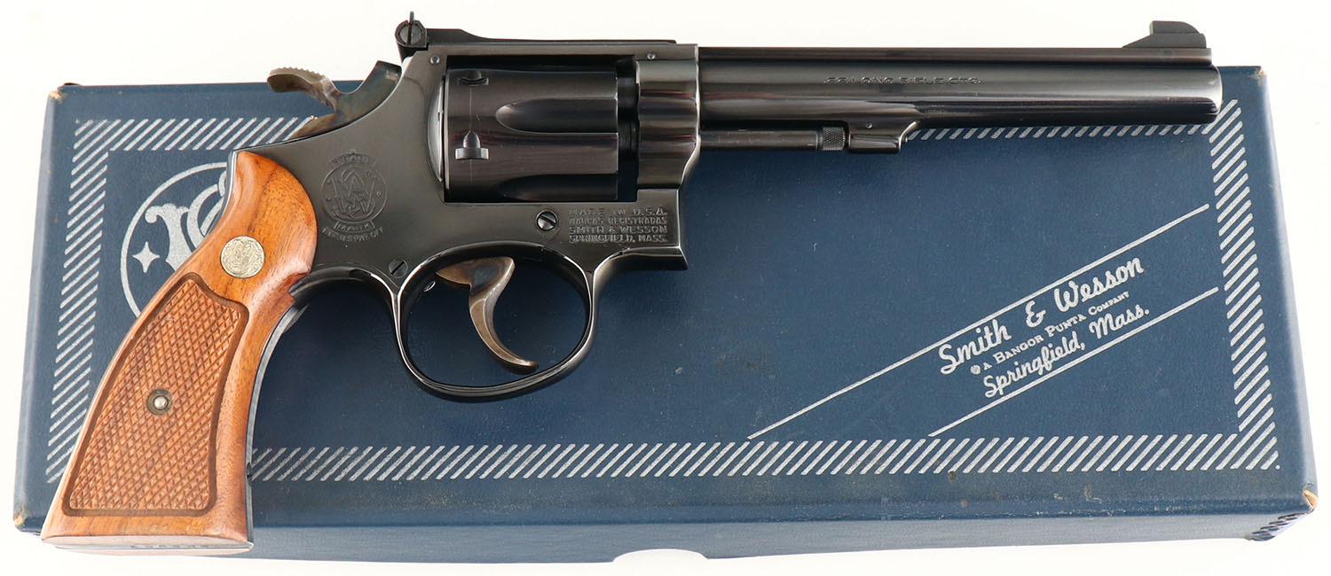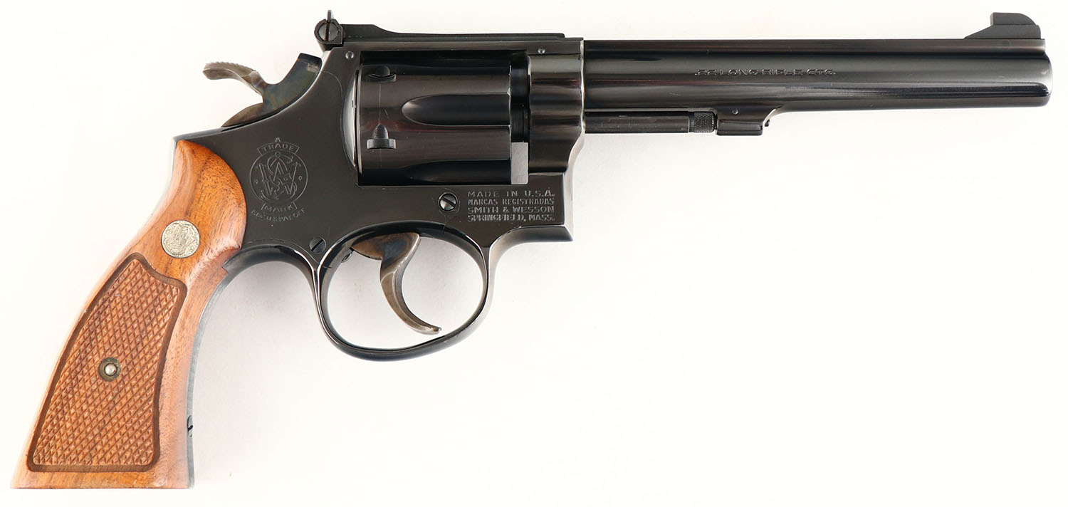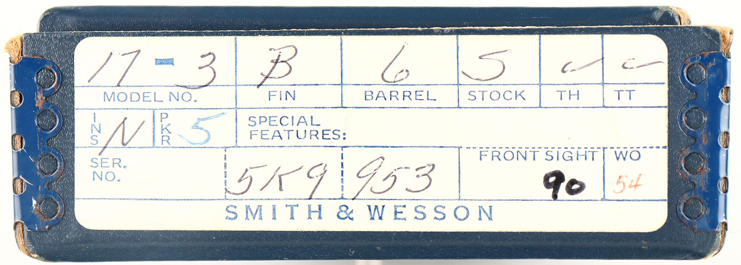 BOXED, Smith & Wesson, Model 17-3, CAL: 22LR, MFG: 1973, SN: 5K9953, Double Action Revolver, 6'' barrel. The S&W logo medallion checkered wood grips are excellent, near mint. The original metal blue finish rates 99%+ overall. The case-hardened hammer & trigger retain vivid case-colors. Bore is excellent. Adjustable rear sight & ramp elevated partridge front sight. Comes in original box, with related paperwork, cleaning rod/tips & wax paper.* FFL or C&R Req. - Value: 900 to 1300