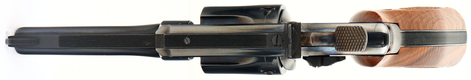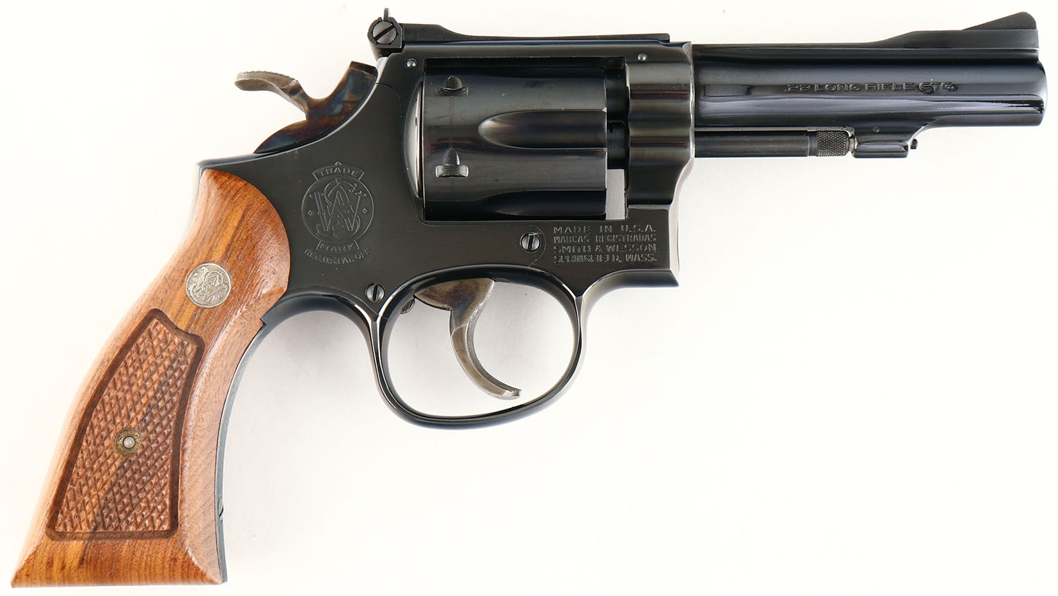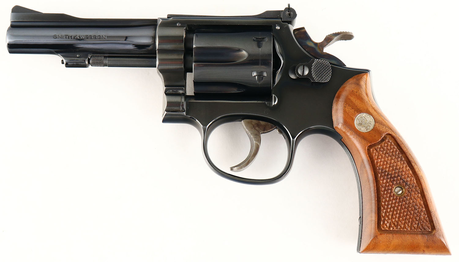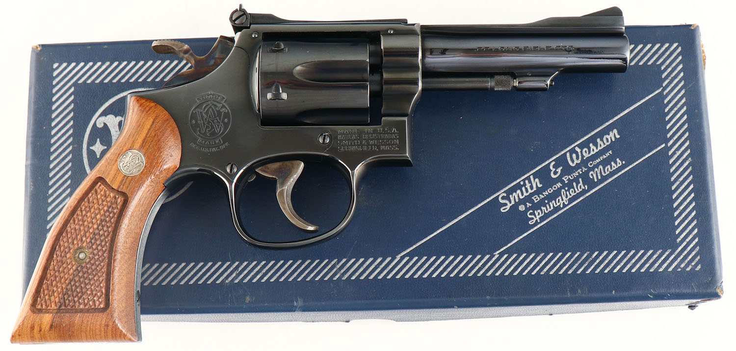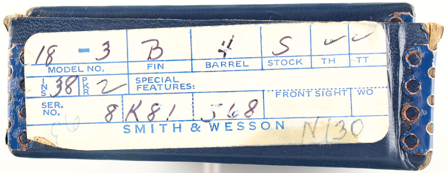 BOXED, Smith & Wesson, Model 18-3, CAL: 22LR, MFG: 1975, SN: 8K81568, Double Action Revolver, 4'' barrel. The S&W logo medallion checkered wood grips are excellent, near mint. The original metal blue finish rates 99%+ overall. The case-hardened hammer & trigger retain vivid case-colors. Bore is excellent. Adjustable rear sight & ramp elevated serrated blade front sight. Comes in original box, with related paperwork, cleaning rod/tips & wax paper.* FFL or C&R Req. - Value: 900 to 1300