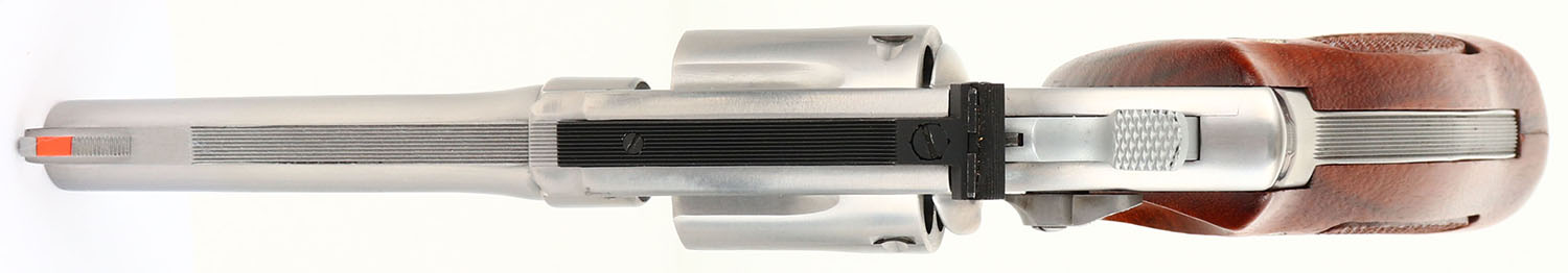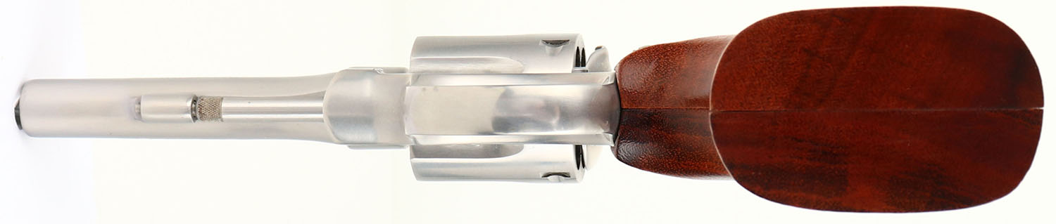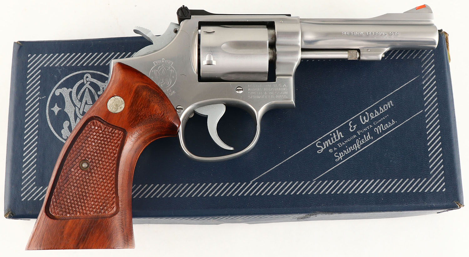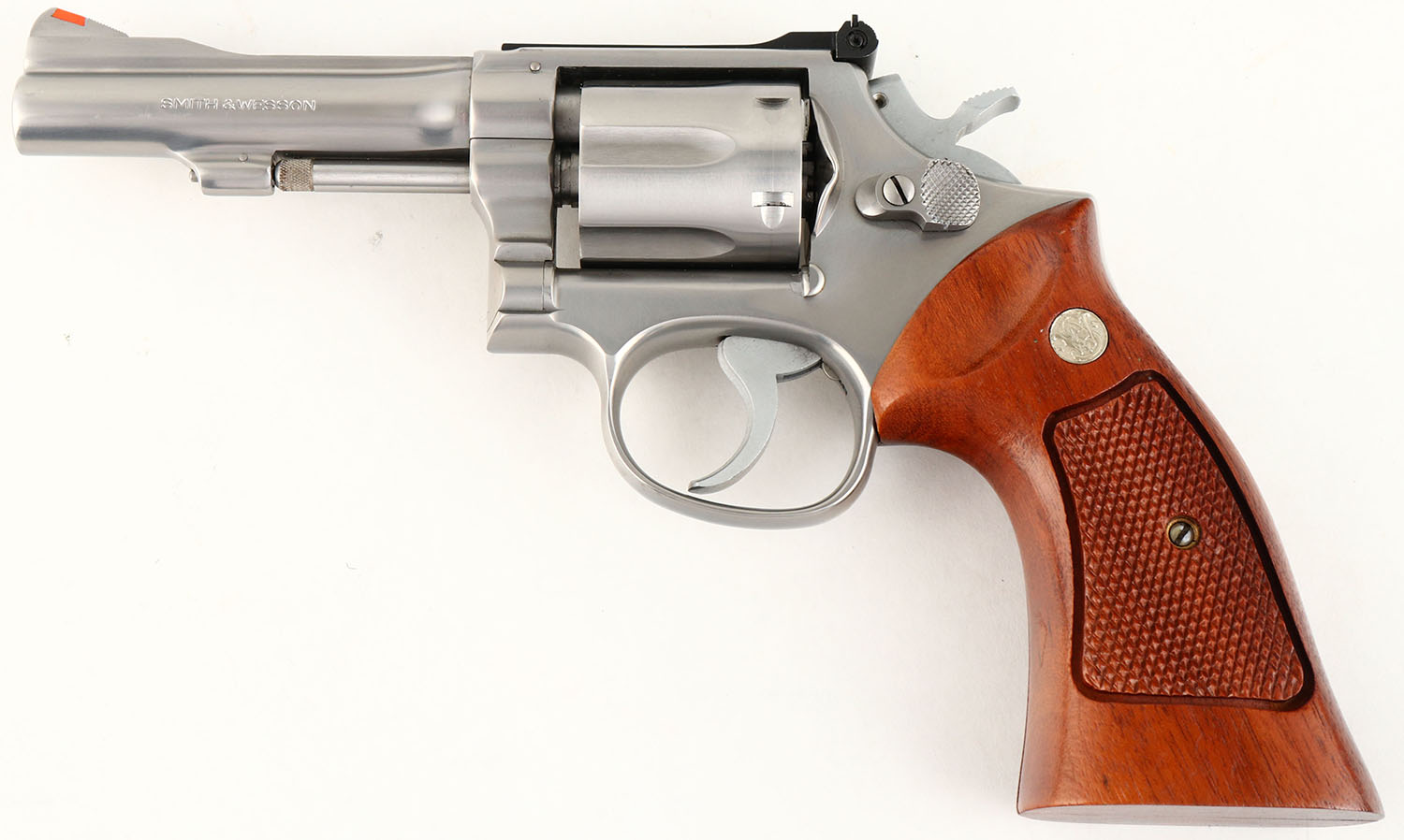 BOXED, Smith & Wesson, Model 67, CAL: 38 S&W SPL, MFG: 1977, SN: 18K3033, Double Action Revolver, 4'' barrel. The S&W logo medallion checkered wood grips are near mint. The brushed stainless steel finish is excellent overall, having been cleaned & buffed. Some of the markings on the right side of the frame are thin. Bore is excellent. Adjustable rear sight & ramp elevated serrated blade front sight, with orange insert. Comes in original box with related paperwork, cleaning rod/tips & wax paper. FFL Req. - Value: 500 to 700