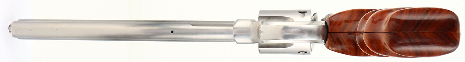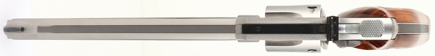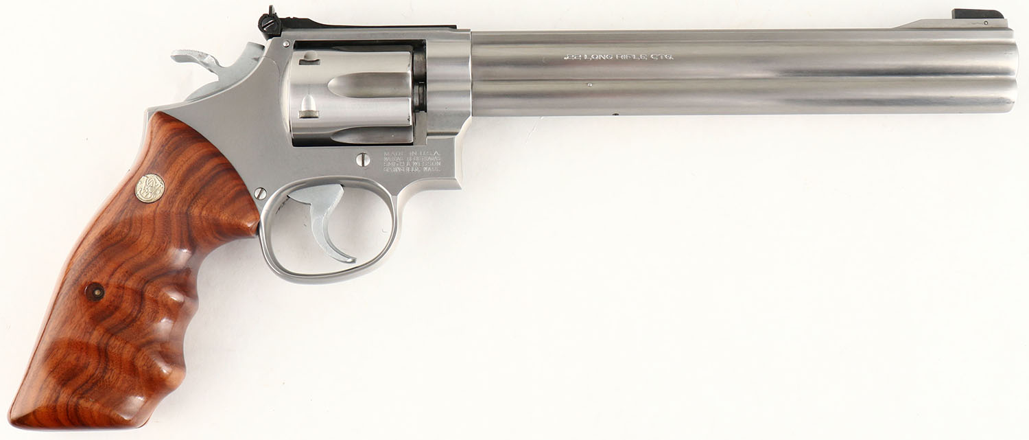 BOXED, Smith & Wesson, Model 617 (No Dash), CAL: 22LR, MFG: 1989-92, SN: BHN6660, Double Action Revolver. 8 1/4'' barrel. The S&W logo medallion ergonomic wood grips are excellent. There are only minor handling marks to the high gloss finish. The stainless steel finish is excellent, with visible thin brush lines; consistent amongst stainless steel finishes. Bore is excellent. Adjustable rear sight & ramp elevated blade front sight. Comes in factory box. FFL Req. - Value: 700 to 1200