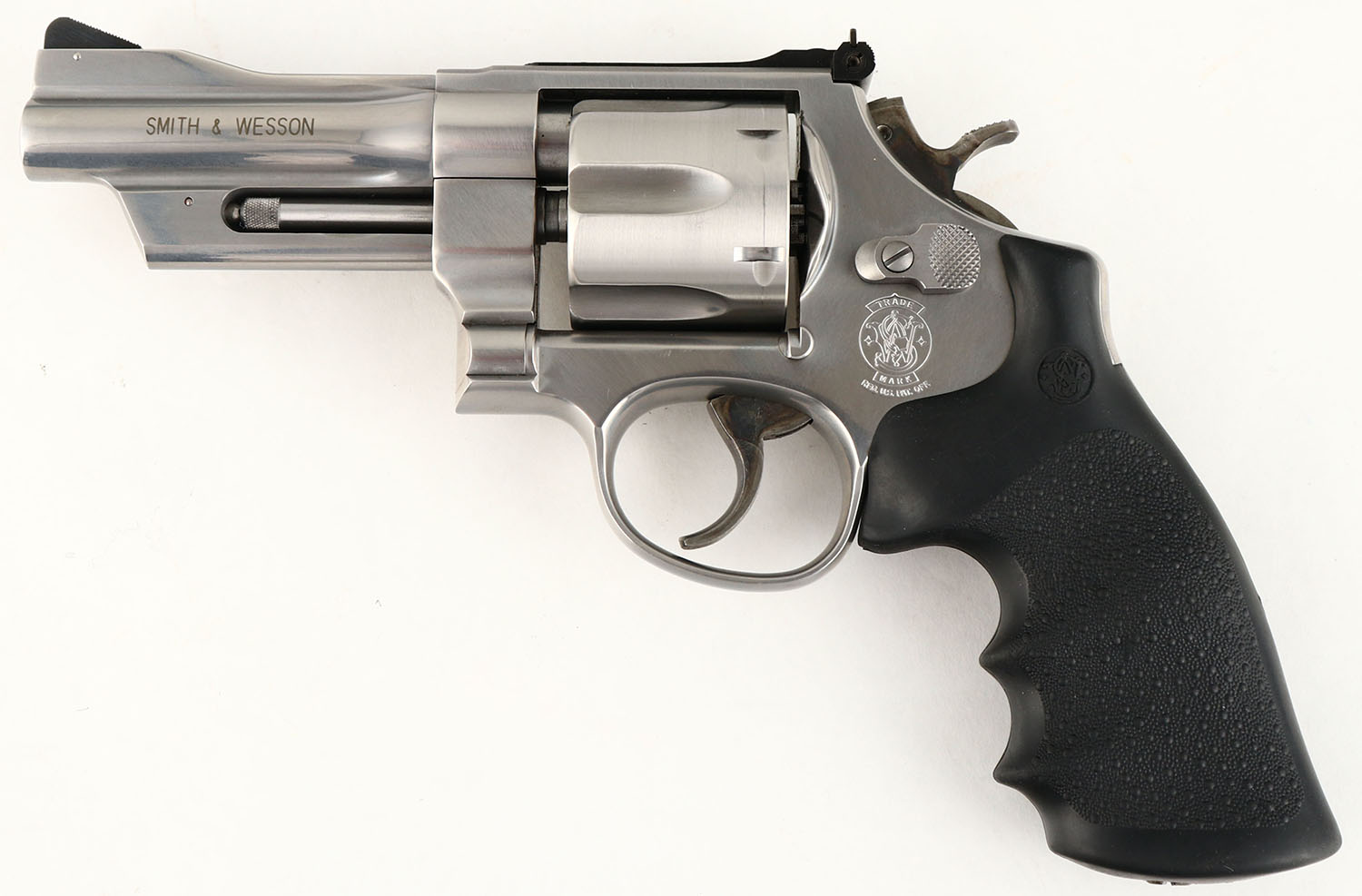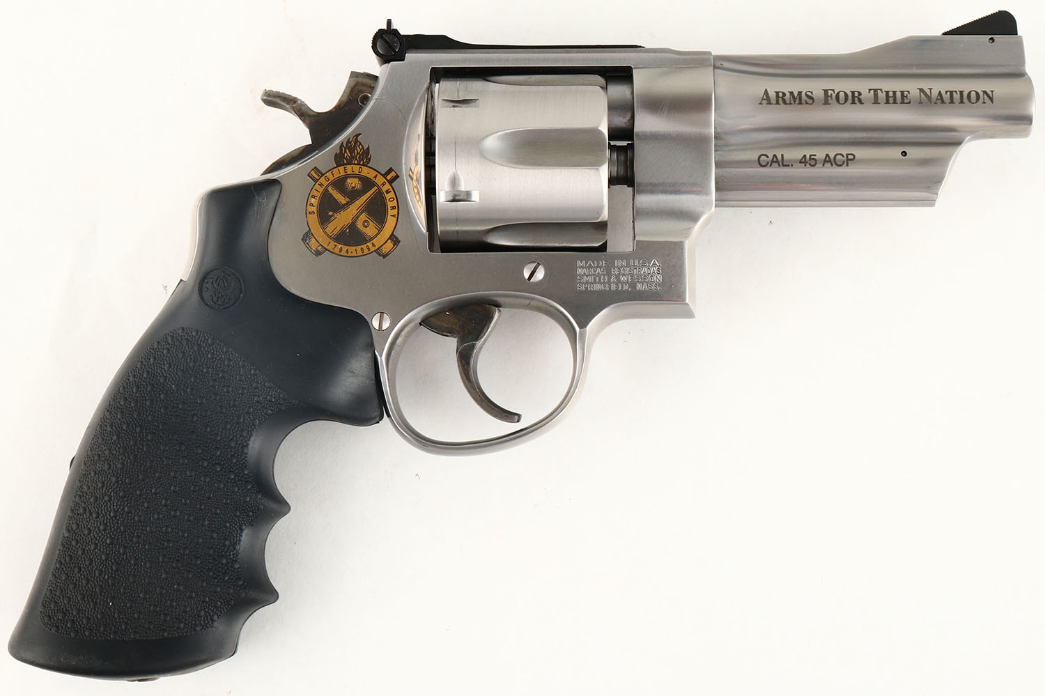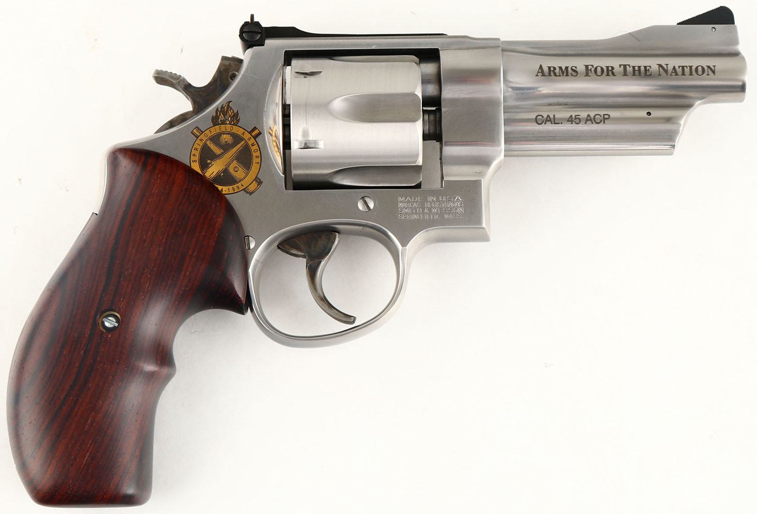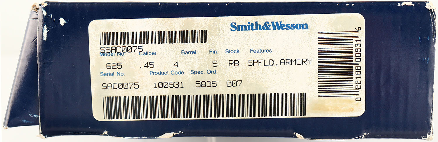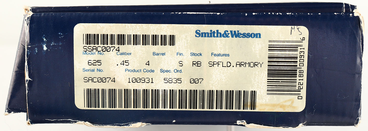 SEQUENTIAL PAIR: 1) BOXED, Smith & Wesson, Model 625-4 - Arms for the Nation: 200th Anniversary of Springfield Armory. CAL: 45 ACP, MFG: 1994, SN: SAC0074, Double Action Revolver, 4'' barrel. The S&W monogram stippled rubber grips are excellent. There is some light handling wear. The stainless steel finish is excellent. The right side of the frame has a gold S.A cross cannons & flaming cannonball emblem that reads ''SPRINGFIELD ARMORY 1794-1994''. The right side of the barrel is marked '' ARMS FOR THE NATION'' over, ''CAL.45 ACP''. The right side of the frame has the S&W trademark logo. The case-hardened trigger & hammer retain slightly faded, but visible case-colors. Bore is excellent. Adjustable rear sight & ramp elevated serrated blade front sight. Comes in SN matching box, with a good amount of moon clips & the original wax paper. This is one of two consecutive lots. Please reference the next lot for the second gun of a sequential serial number set. FFL Req.