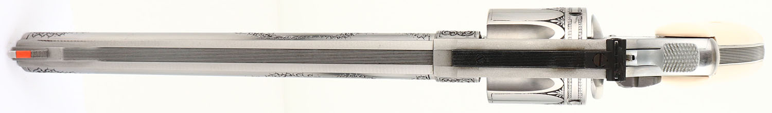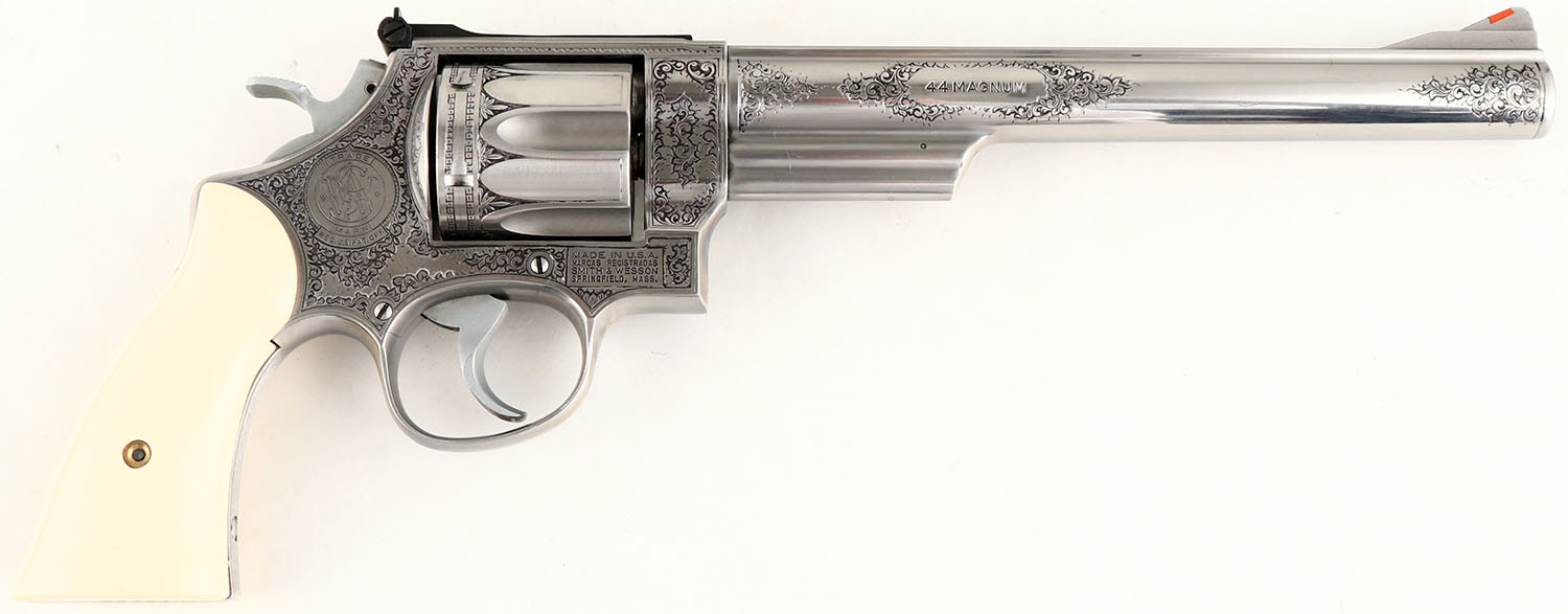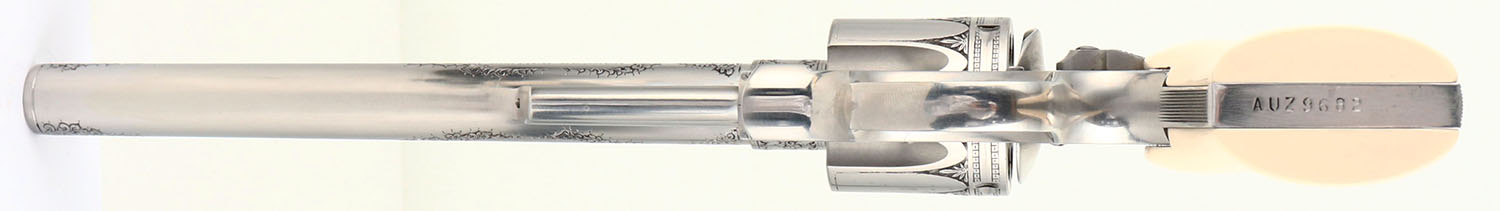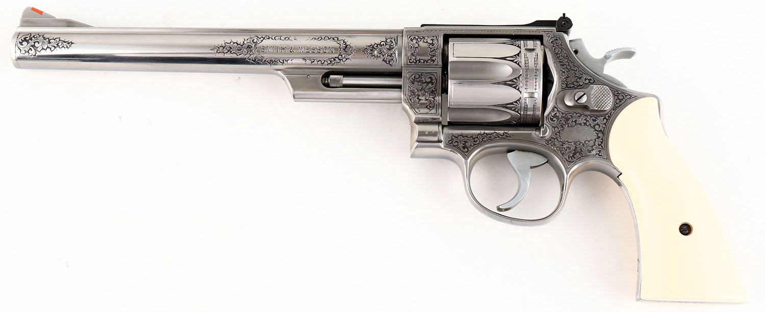 CASED, Smith & Wesson, Model 629-1, CAL: 44 MAG, MFG: 1982, SN: AUZ9682, Double Action Revolver, 8 1/2'' barrel. This revolver has been tastefully & intricately engraved in a floral & scroll pattern by John M. Morgan of Arco, ID. The simulated ivory grips are excellent. The polished stainless steel finish is excellent, with visible thin brush lines. Bore is excellent & bright with crisp rifling. Adjustable rear sight & ramp elevated blade front sight with orange insert. Comes in a hand crafted oak case, with blue cloth interior & the S&W logo on the lid. Included in the case are cleaning tools & (28) fired brass shells in a wood ammo block. An excellent example of an engraved S&W revolver. FFL Req. - Value: 2000 to 4000