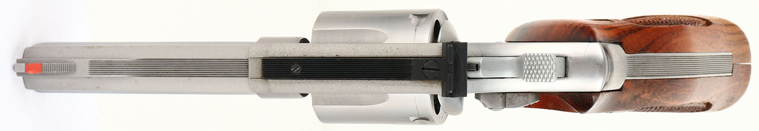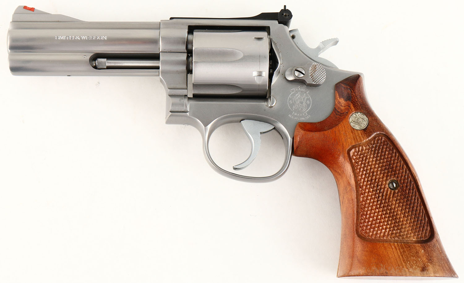 Smith & Wesson, Model 686, CAL: 357 MAG, MFG: Modern, SN: AEJ0811, Double Action Revolver, 4 1/8'' barrel. The S&W logo medallion checkered wood grips are excellent. There are minor handling marks & areas of finish thinning dull. The stainless steel finish is excellent overall, with minor handling marks. Bore is excellent. Adjustable rear sight & elevated blade front sight with orange insert. FFL Req. - Value: 500 to 700