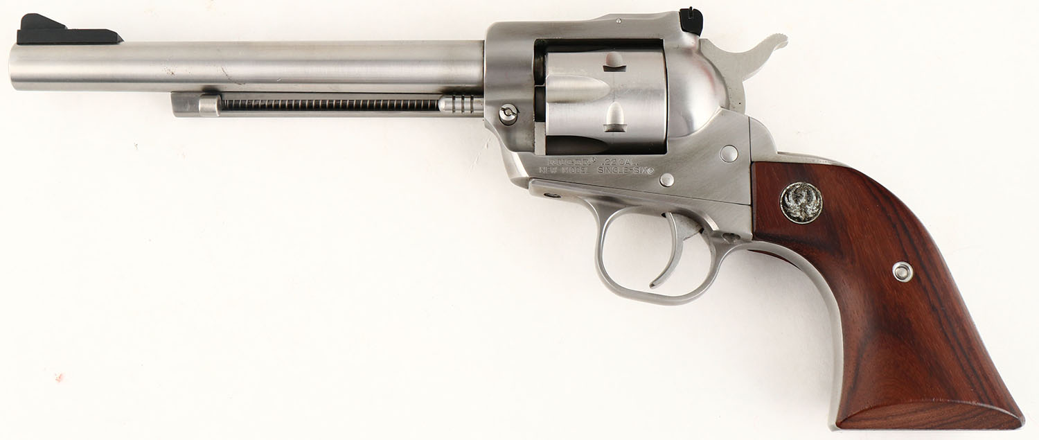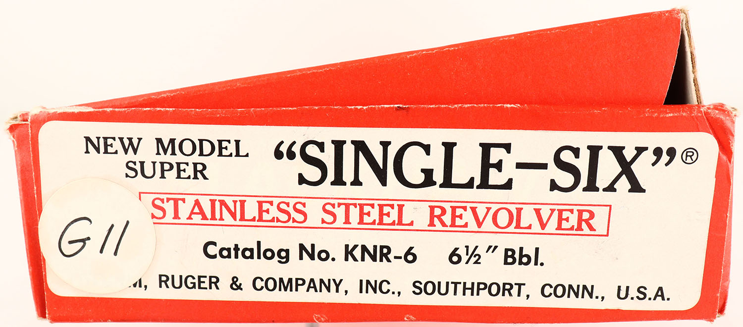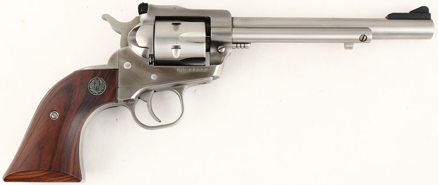 BOXED, Ruger, New Model Super Single Six Convertible, CAL: 22LR/22MAG, MFG: 1974, SN: 62-71513, Single Action Revolver, 6 1/2'' barrel. The Ruger logo medallion wood grips are excellent. The logo medallion has some spotting & light corrosion. The stainless steel finish is excellent overall. Bore is excellent. Adjustable rear sight & elevated serrated blade front sight. Comes in original box, with related paperwork, wax paper & .22 MAG cylinder in original pouch. FFL or C&R Req. - Value: 400 to 600