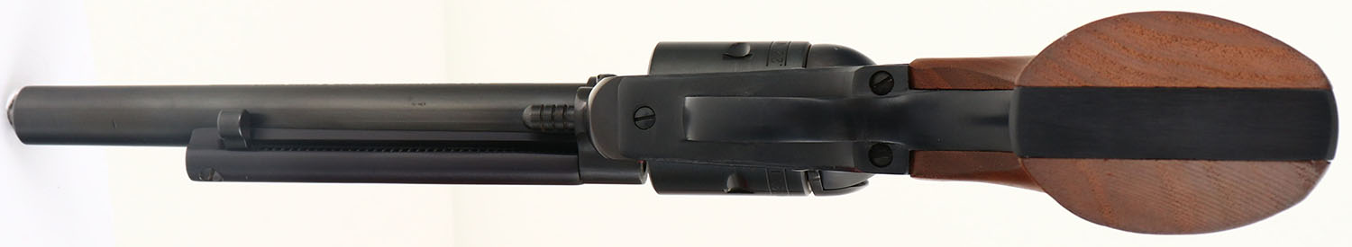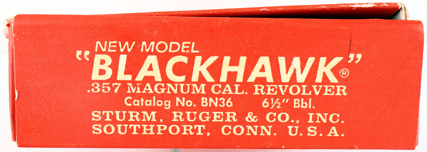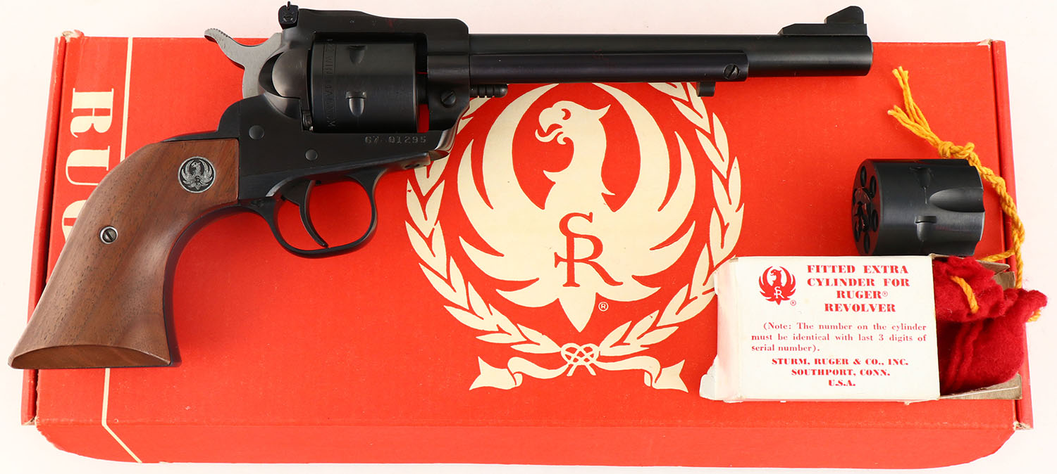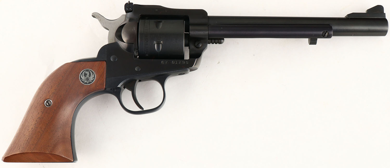 Ruger, New Model Single Six Convertible, CAL: 22LR/22 MAG, MFG: 1979, SN: 67-01295, Double Action Revolver, 6 1/2'' barrel. The Ruger logo medallion wood grips are excellent. The original metal blue finish rates 99%. Bore is excellent. Adjustable rear sight & elevated serrated blade front sight. Comes in a period correct box, with incorrect Blackhawk label printed on the box, no label & outer cardboard sleeve. Box has related paperwork, wax paper & .22 LR cylinder in factory pouch. FFL or C&R Req. - Value: 450 to 650