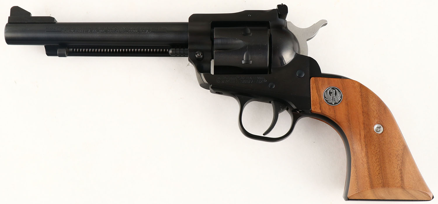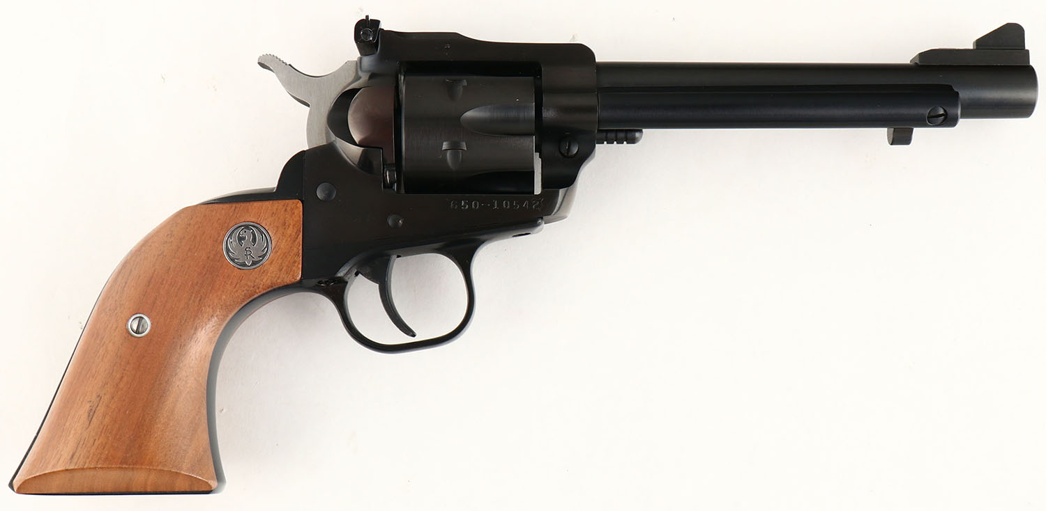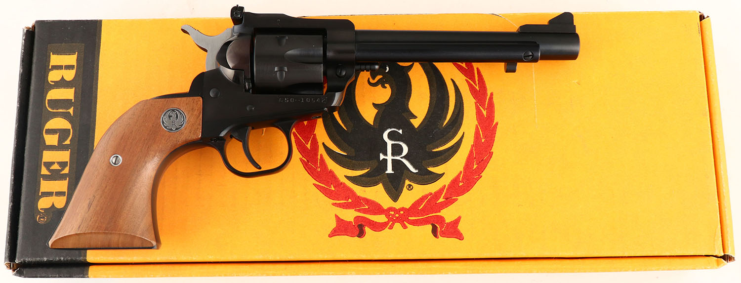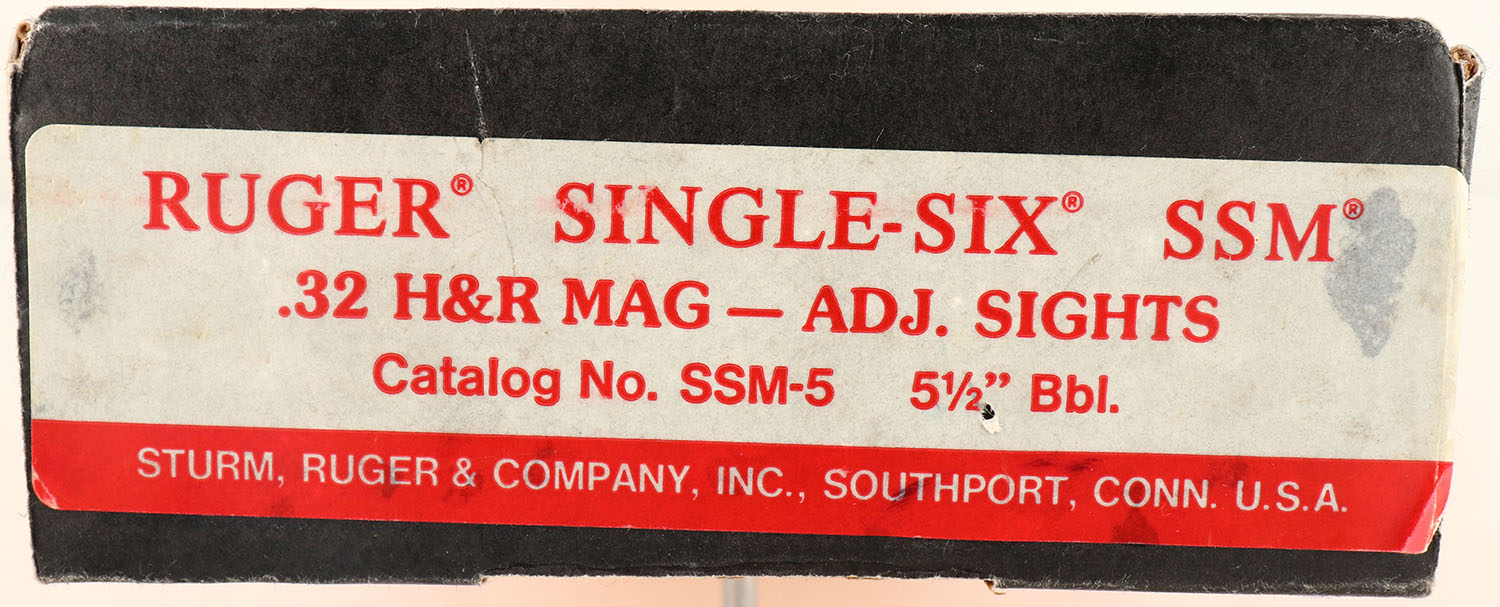 BOXED, Ruger, New Model Single Six - SSM (Single Six Magnum), CAL: 32 H&R MAG, MFG: 1985, SN: 650-10542, Double Action Revolver, 5 1/2'' barrel. The Ruger logo medallion wood grips are excellent. The metal blue finish rates 99% overall. Bore is excellent. Adjustable rear sight & elevated blade front sight. Comes in period correct box, with matching end label. FFL Req. - Value: 400 to 600