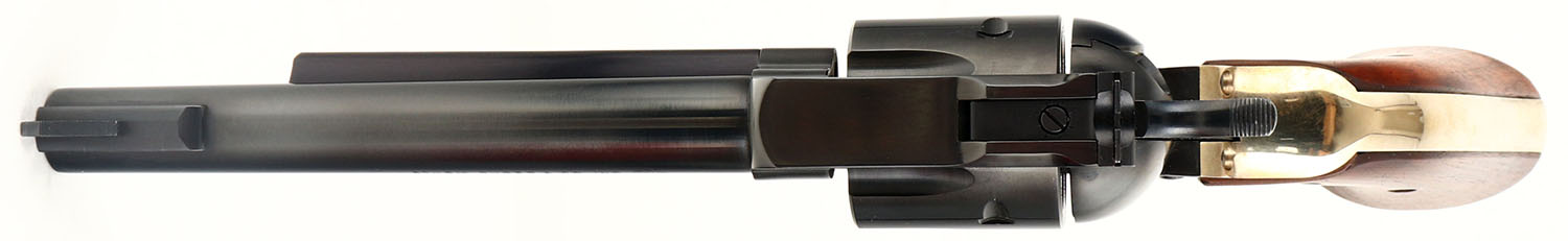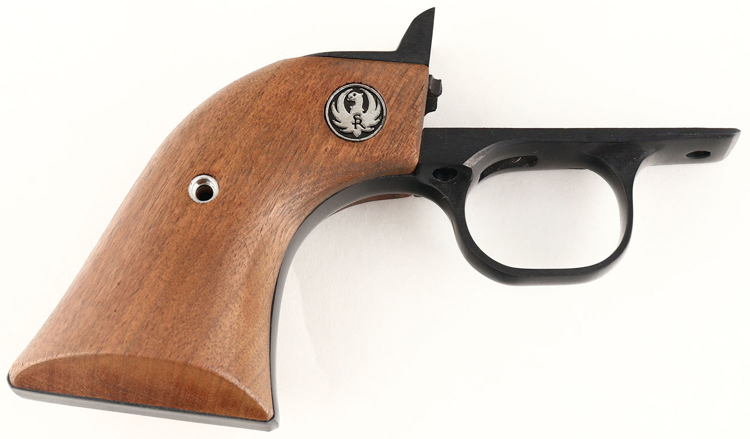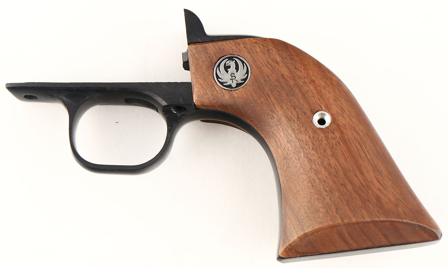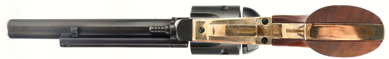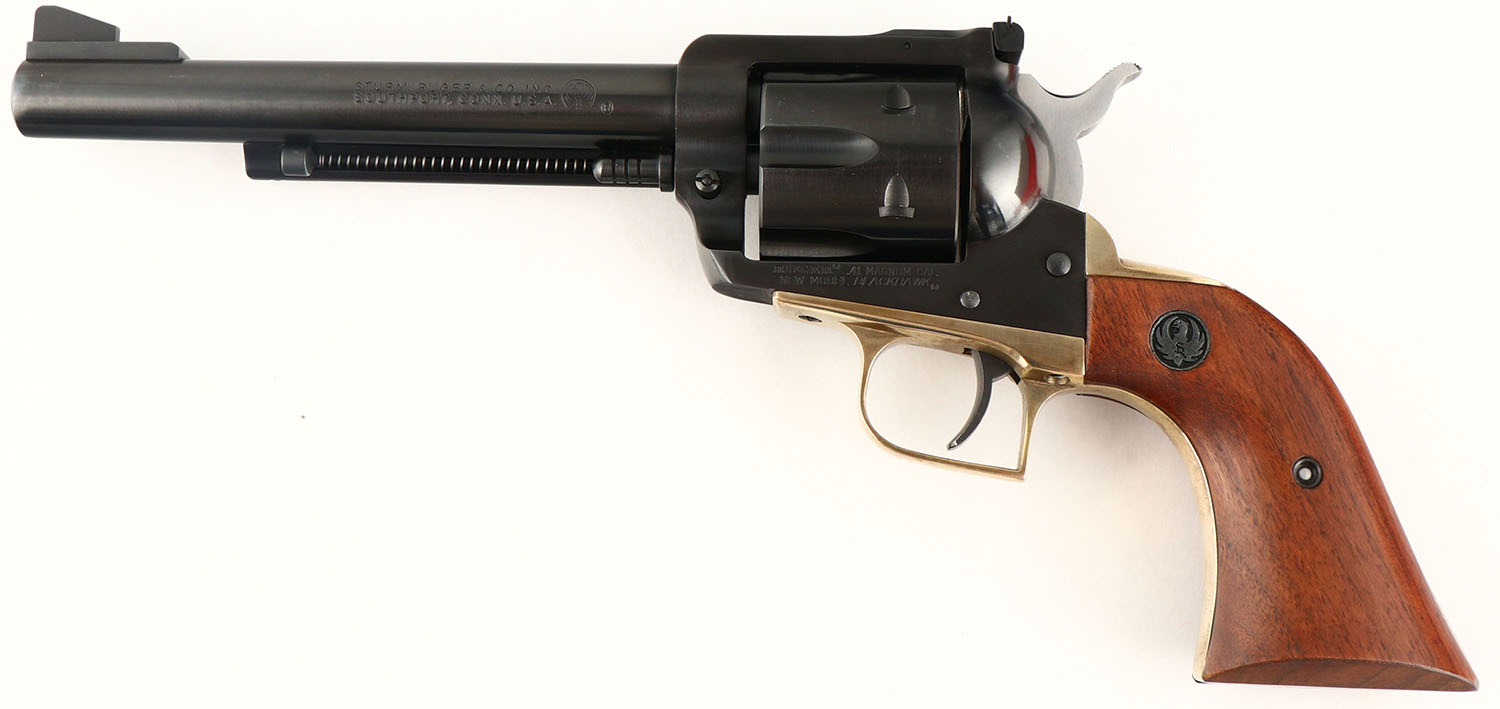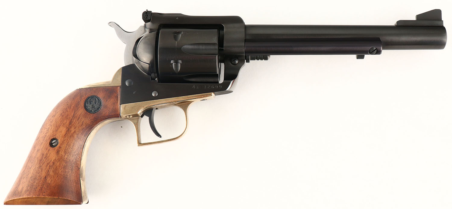 BOXED, Ruger, New Model Blackhawk, CAL: 41 MAGNUM, MFG: 1977, SN: 41-12699, Single Action Revolver, 6 1/2'' barrel. The Ruger logo medallion wood grips are excellent. The original metal blue finish rates 99% overall. The Ruger NMBH brass frame is very good, with some light staining throughout. Bore is excellent. Adjustable rear sight & block elevated serrated blade front sight. The Ruger brass frame & grips that are currently on the revolver were put on by a gunsmith in 1977, with the original sales receipt included. The brass frame does not carry the original ''MR-3DB'' cast marking. The factory grip frame & grips are also included. Comes in original box, with related paperwork, wax paper & outer cardboard sleeve. FFL Req - Value: 900 to 1400