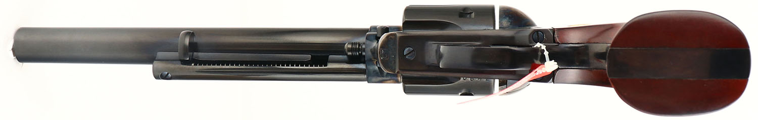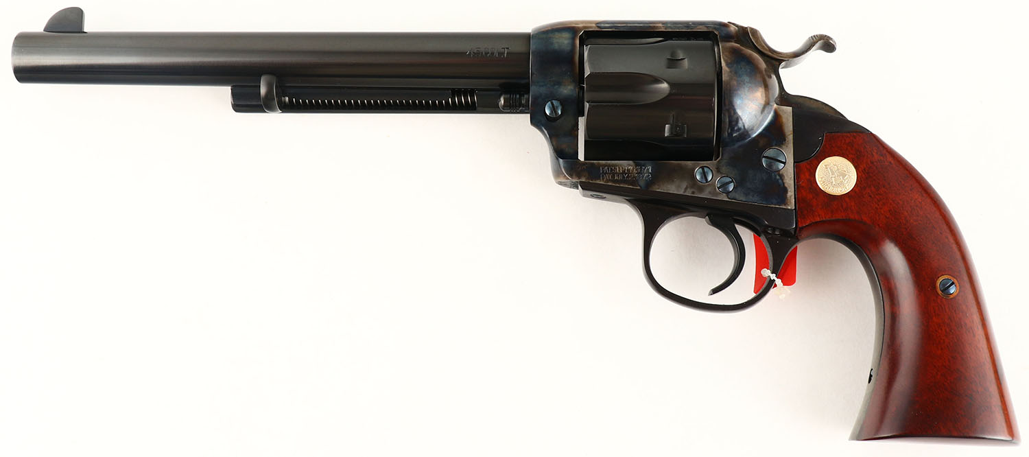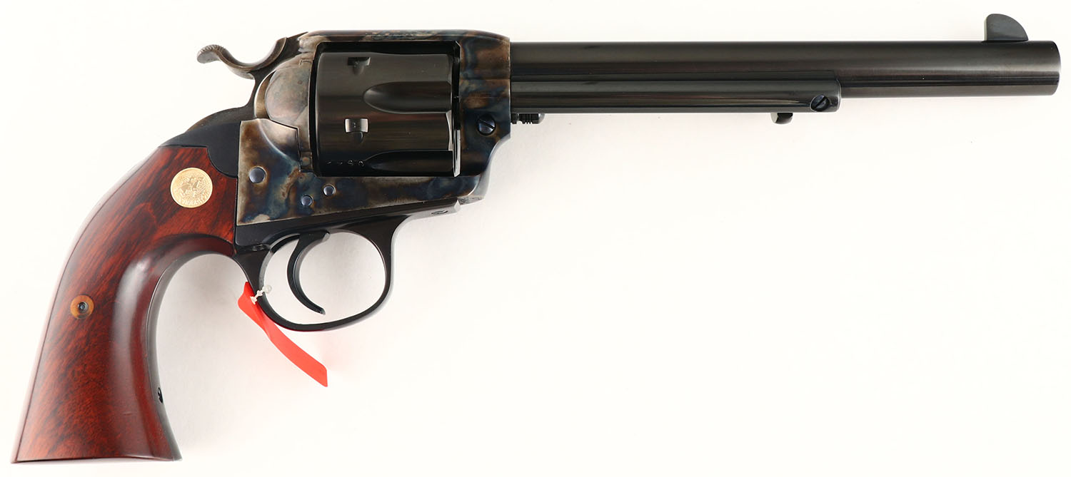 NEW BOXED, Cimarron Firearms (A.Uberti), Bisley Model, CAL: 45 COLT, MFG: Modern, SN: P50642, Single Action Revolver, 7 1/2'' barrel. The logo medallion wood grips are excellent. The metal blue finish on the barrel, cylinder & trigger guard rate 99%+. The case-hardened frame displays vivid case colors. Bore is mint. Integral square notch rear sight & tall dorsal fin blade front sight. Factory hang tag still attached. Comes in original box, with related paperwork. FFL Req. - Value: 550 to 750