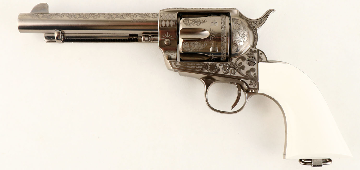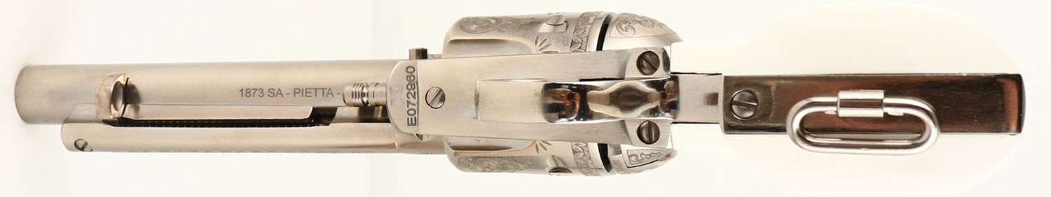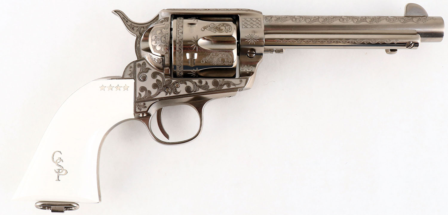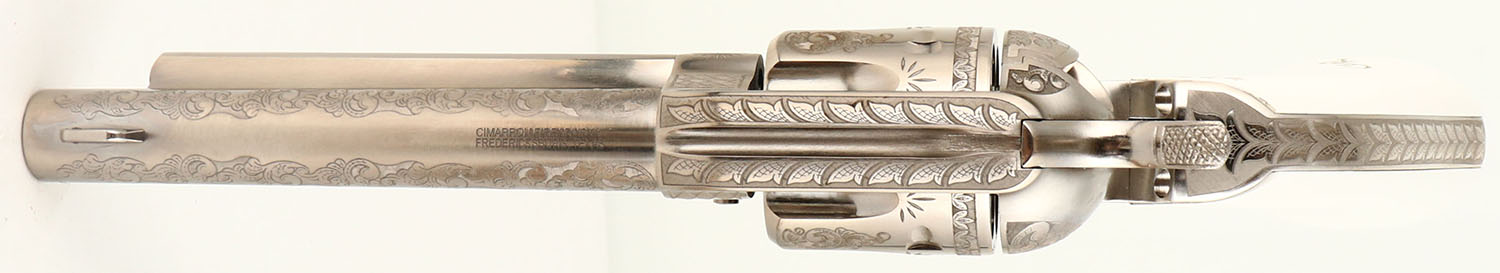 NEW BOXED, Cimarron Firearms (Pietta), 1873 SA Frontier Model Gen. George S. Patton Engraved, CAL: 45 COLT, MFG: Modern, SN: E072960, Single Action Revolver, 5 1/2'' barrel. The faux ivory grips are excellent. The top of the right grip displays (4) stars & the initials ''GSP'' are stamped below. The nickel finish is excellent overall. The entirety of the revolver displays crisp laser engravings of decorative scroll. Bore is mint. Integral square-notch rear sight & dorsal blade front sight. Sling loop present. Comes in original box, with related paperwork. FFL Req. - Value: 750 to 950