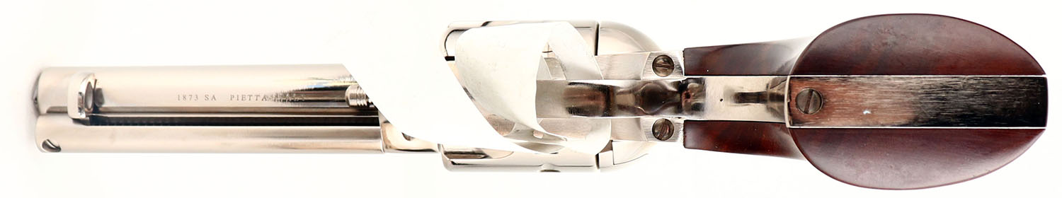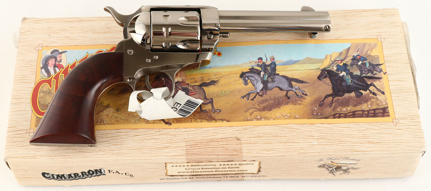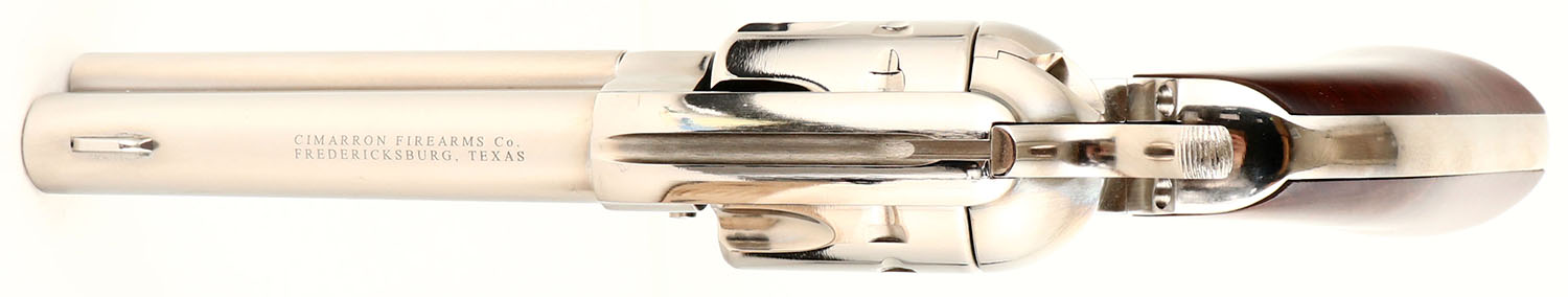 NEW BOXED, Cimarron Firearms (Pietta), 1873 SA ''Pistolero'', CAL: 22LR, MFG: Modern, SN: E075218, Single Action Revolver, 4 3/4'' barrel. The smooth wood grips are excellent. The nickel finish is excellent overall. Bore is mint. Integral square-notch rear sight & blade front sight. 10 Shot Cylinder. Original hang tag still attached. Comes in original box, with related paperwork. FFL Req. - Value: 500 to 600