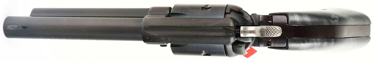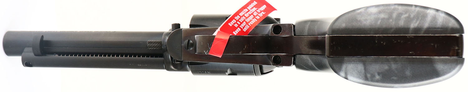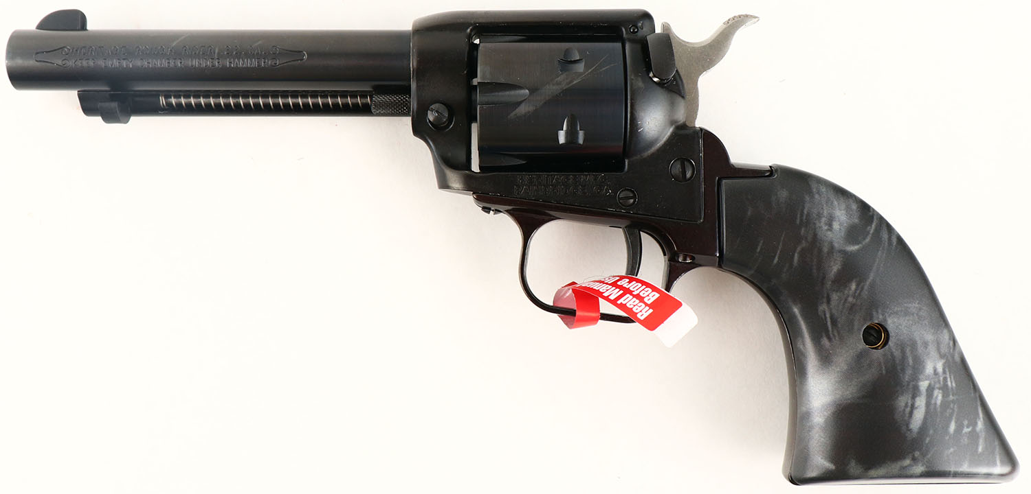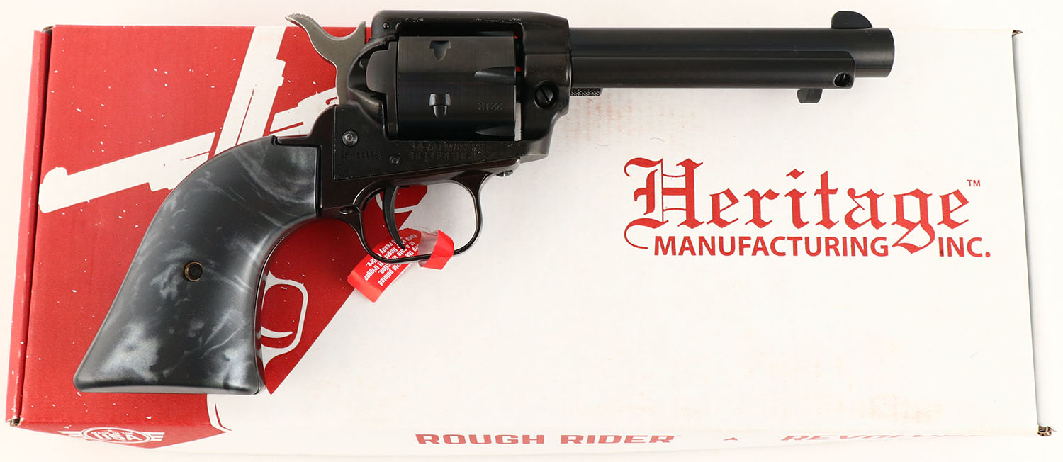 NEW BOXED, Heritage, Rough Rider - Black Pearl , CAL: 22LR, MFG: Modern, SN: 3PH144767, Single Action Revolver, 4 3/4'''' barrel. The synthetic black pearl grips are excellent. The metal blue finish on the barrel & cylinder rates 99%. Frame has factory matte black finish, with spotting underneath. These types of finishes are typical amongst most all Heritage products. Bore is excellent. Integral square notch rear sight & blade front sight. Factory hang tag still attached, hammer safety bar & plastic cylinder disc still present. Comes in original box, with related paperwork & lock. NIB. FFL Req. - Value: 120 to 170