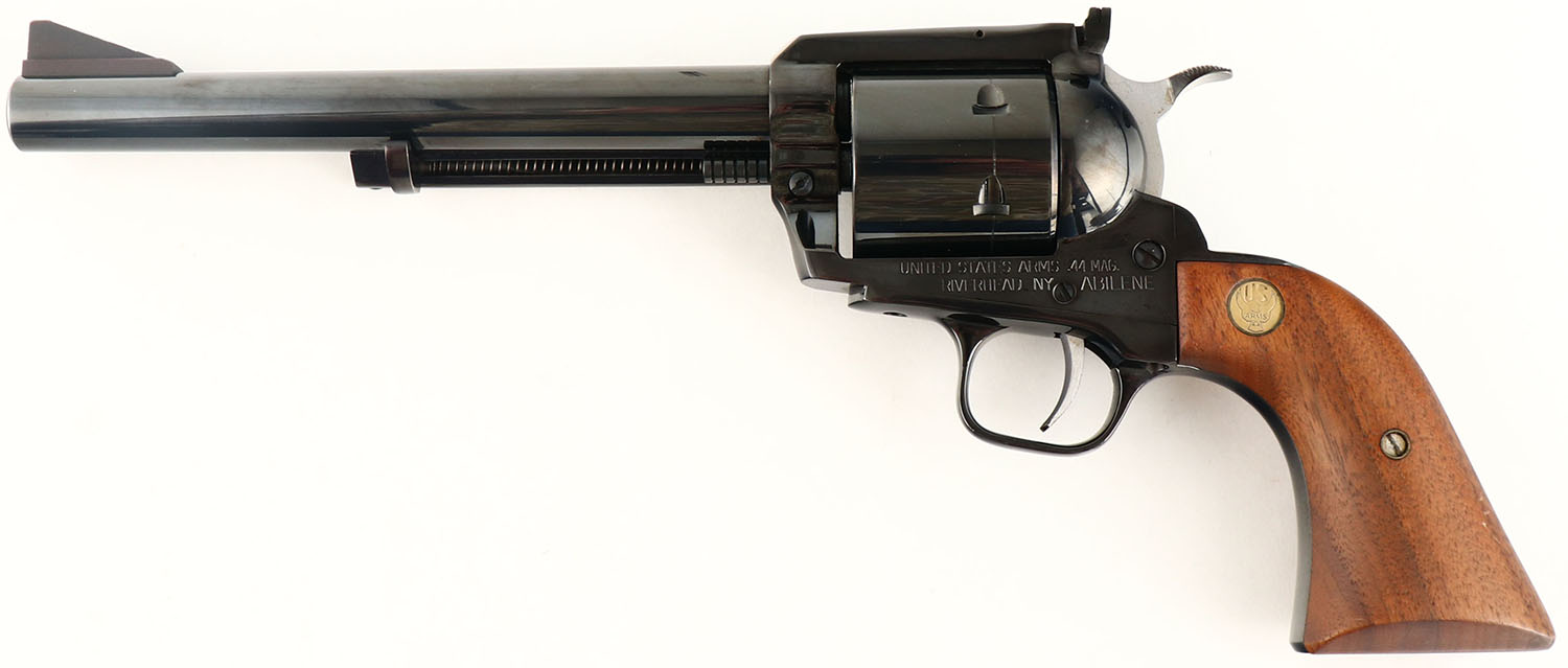 U.S Arms Co. Abilene (Model 508 AB), CAL: 44MAG, MFG: 1970's, SN: 50-002893, Single Action Revolver, 7 1/2'' barrel. The original wood grips with inlaid US brass medallions are excellent. The metal blue finish rates 98% overall. There is some discoloration to the bluing, but no loss. Bore is excellent, near mint. Adjustable rear sight & large serrated blade front sight. FFL Req. - Value: 500 to 800