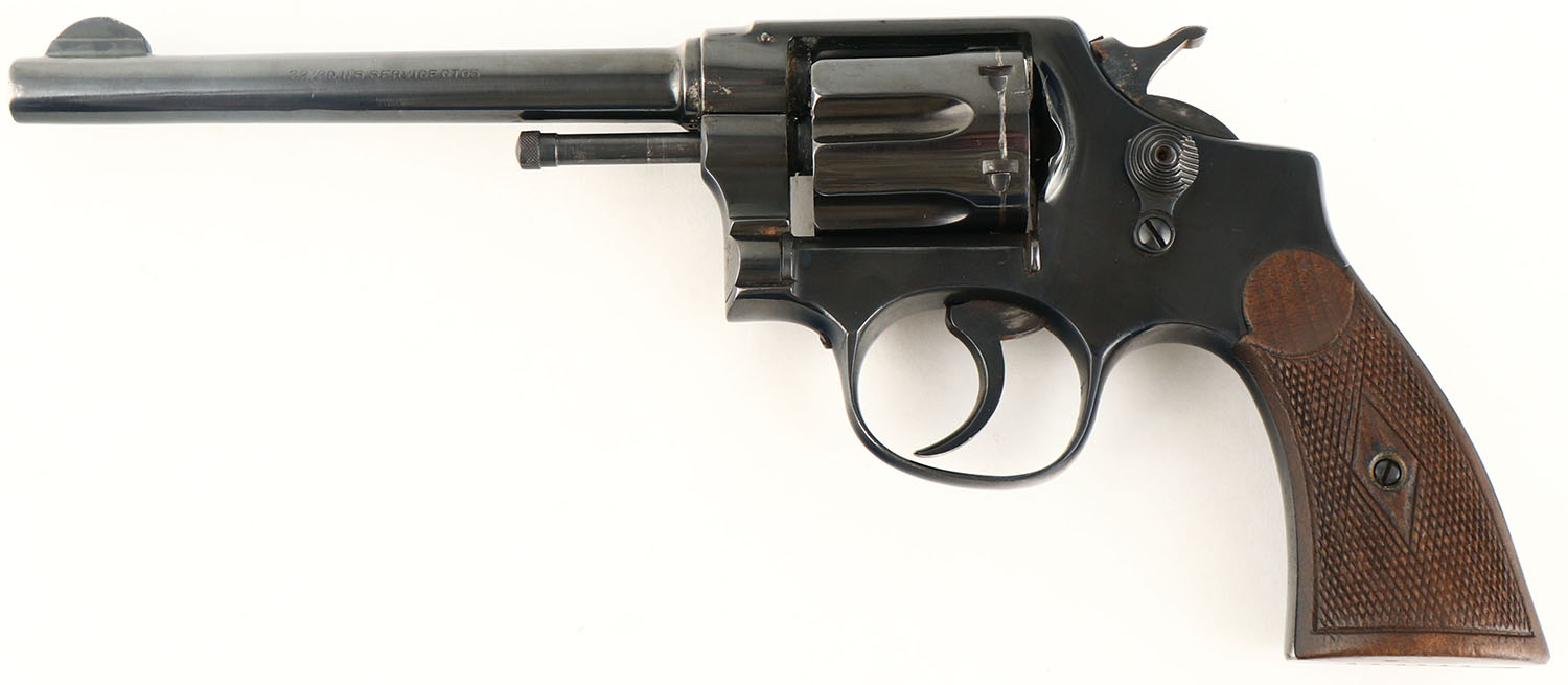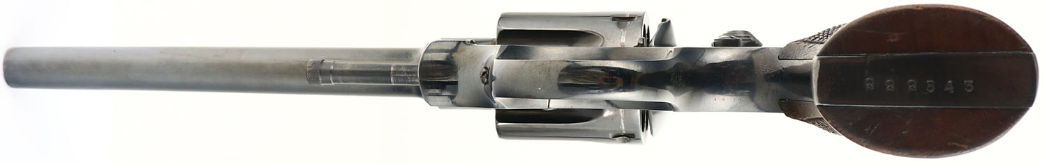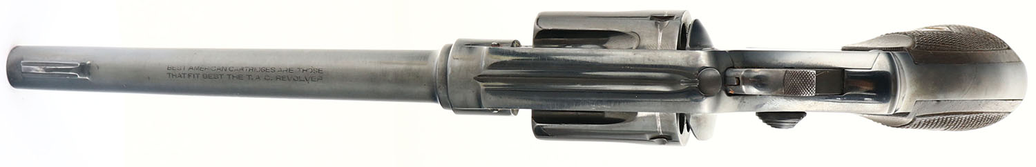 T.A.C (Spain), Revolver, CAL: 32-20, MFG: 1920-36, SN: 222543, Double Action Revolver, 6 1/8'' barrel. The original checkered wood grips are very good & solid. There are contusions, scrapes & dings to the finish. The metal blue finish rates 95% on the barrel & 97% on the frame, with visible handling marks & a couple areas of light spotting toned to a brown patina. Bore is excellent. U-notch rear sight & blade front sight. TAC was one of the better brands of S&W clones made in Spain. They imported into the U.S. in such large quantities that they almost put S&W out of business. FFL or C&R Req. - Value: 200 to 400