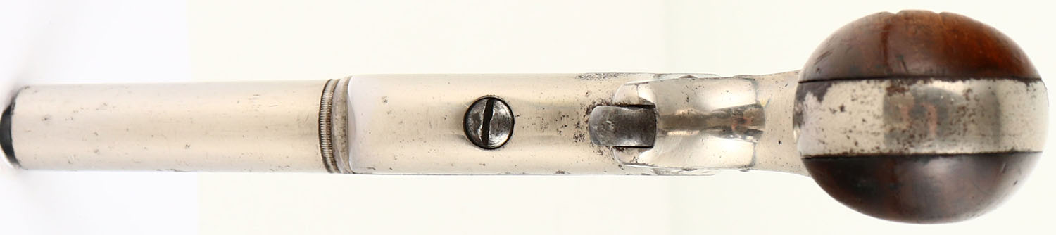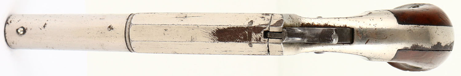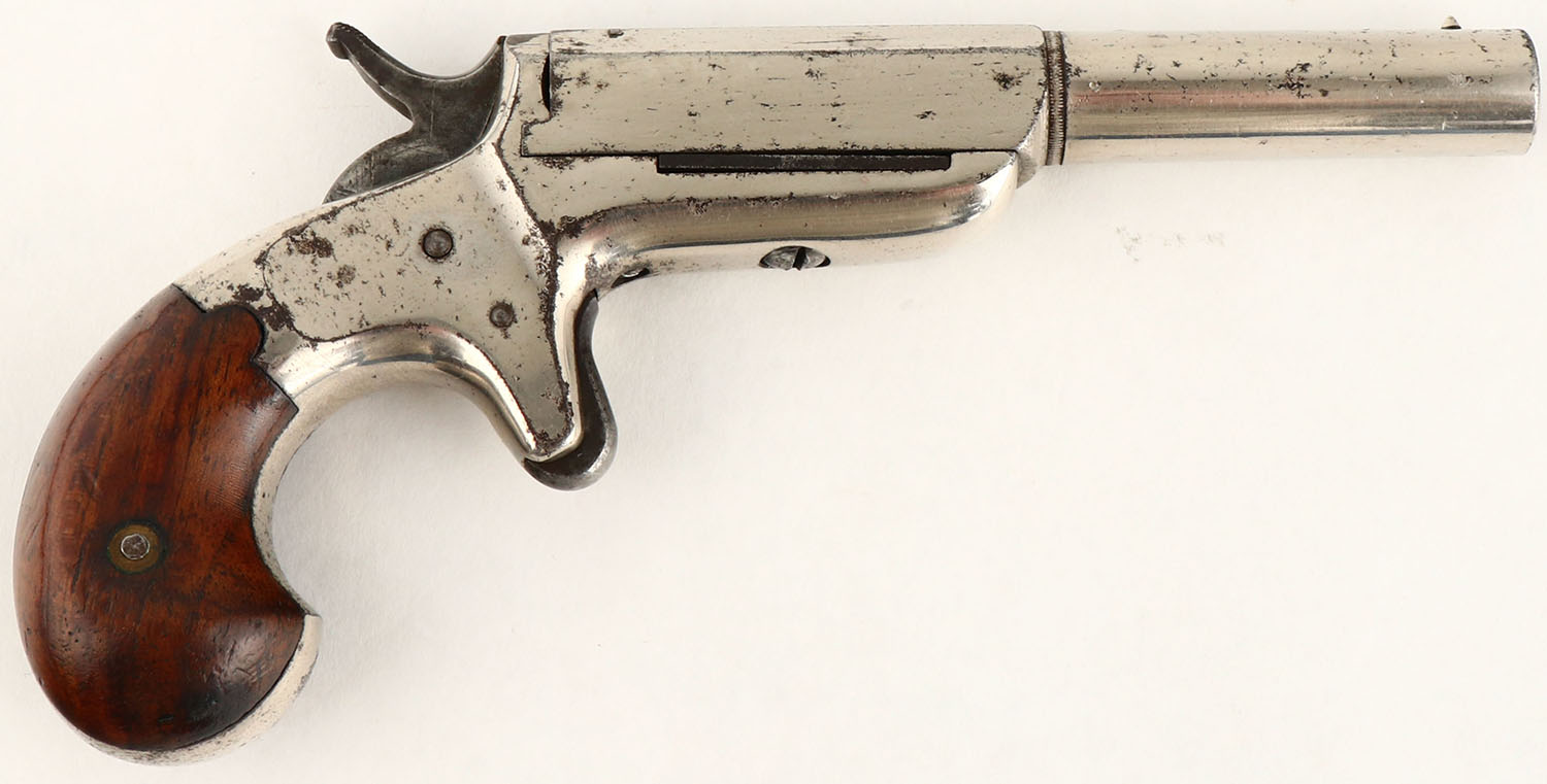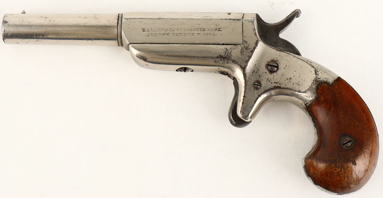 E.Allen & Co. Side Swing Pistol, CAL: 32 RF, MFG: 1865-71, SN: 1152, Single Shot Pistol, 4'' barrel. The left side of the barrel is marked ''E.ALLEN & CO WORCESTER, MASS ALLENS PAT.MCH.7.1865''. The two piece wood grips are very good & solid. There are contusions, scrapes, dings & protective oils added over time. The original nickel finish rates 90% overall with intermittent spotting toned to a brown patina. Bore is fair & rough, with pitting. Small cone front sight. Antique, No FFL Req. - Value: 200 to 400