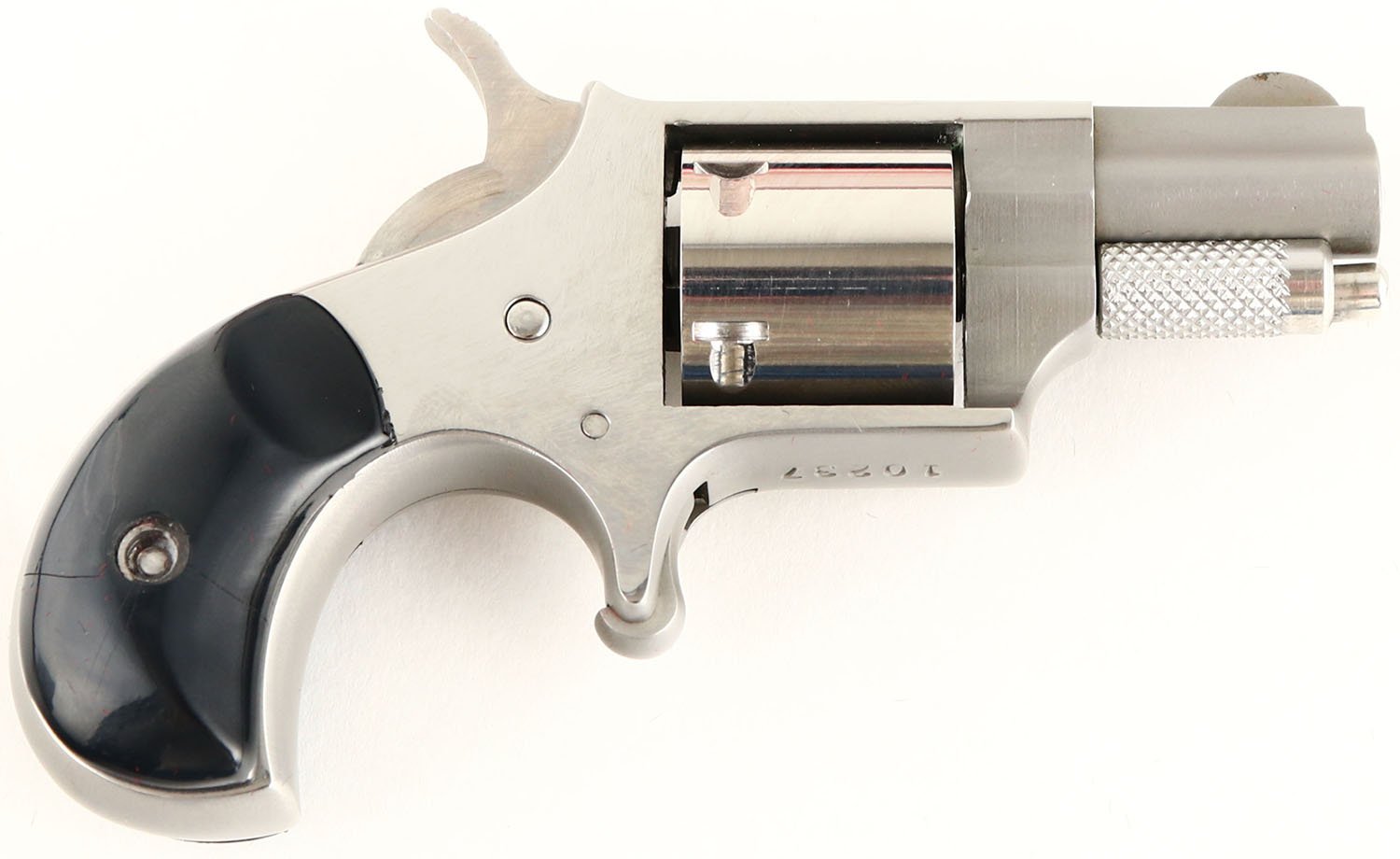 BOXED, North American Arms, Model NAA-22-S, CAL: 22 SHORT, MFG: Modern, SN: 10237, Single Action Revolver, 1 1/8'' barrel. The black plastic grips are good. Both grips have cracks going through the screw hole. The two-tone stainless steel finish is excellent overall. Bore is excellent. Small blade front sight. Comes in cloth covered hard case, with red interior & outer cardboard sleeve. FFL Req. - Value: 100 to 200