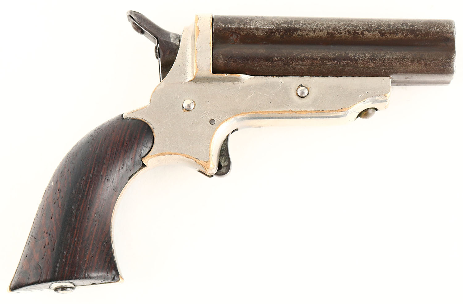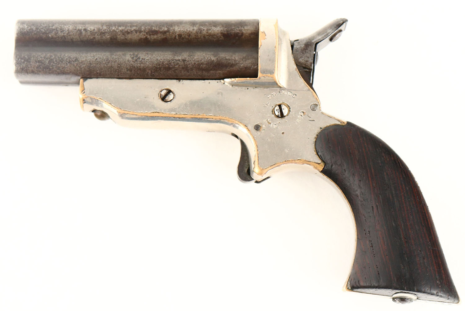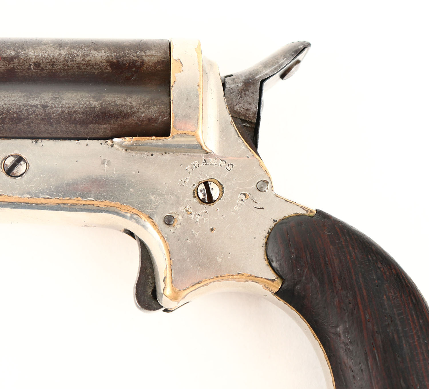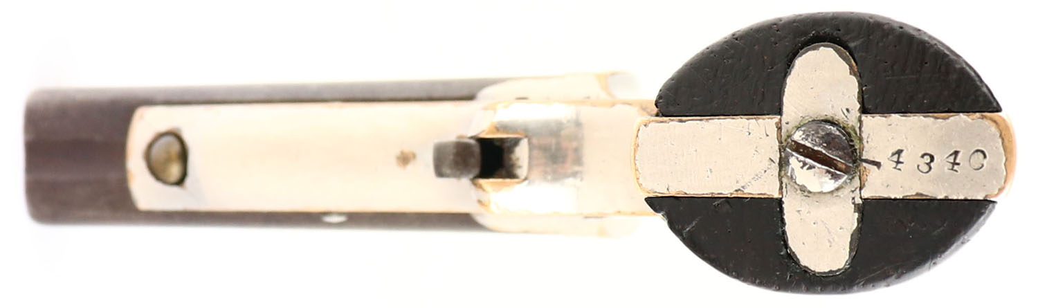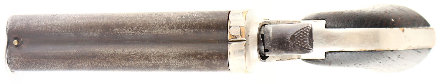 C. Sharps, Model 2: 4-Barrel Pepperbox, CAL: 30 RF, MFG: 1859-74, SN: 4340, Single Action Pistol, 3'' barrel cluster. The original wood grips are very good & solid. The bottom front corner of the left grip has a small edge chip, along with other minor handling marks. The metal blue finish on the barrel has worn to metal gray & toned to brown patina. The original silver plating on the brass frame rates 95%, with sharp edges worn to brass. The marking on either side of the frame are worn thin & are partially legible. Bores are good, with visible rifling, roughness & intermittent light pitting. Small brass bead front sight. Revolving hammer rotates to each barrel. Mechanically functional. Antique, No FFL Req. - Value: 700 to 1000