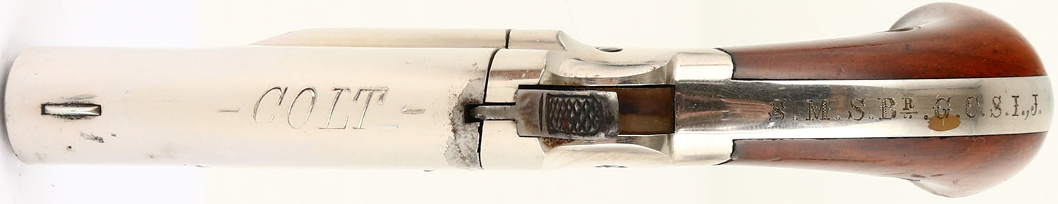 CASED, Colt, Thuer Derringer (3rd Model), CAL: .41 RF, MFG: 1870's-80's, SN: 1589, Single Shot Pistol, 2 1/2'' barrel. The bird's head wood grips are excellent. There are a few minor dings to the finish. The original nickel finish rates 98% overall, with only a couple small spots of flaking. The case-hardened hammer retains excellent case colors. Bore is good, with intermittent spotting & speckling. Blade front sight. The backstrap is engraved, although it can't be attributed to anyone due to lack of evidence from research. The backstrap is engraved with ''S.M.S.B R G.C.S.I.J''. The special order engraving is consistent with examples of Colt factory engraving. Comes in original derringer wood case, with blue interior & Colt label with London address. The case is originally for a pair of derringers, but only one is present. Included in the case is a small plaque that reads ''MAHARAJAH OF JAIPUR''. A high condition Derringer with an untold story. Antique, No FFL Req. - Value: 1000 to 1500