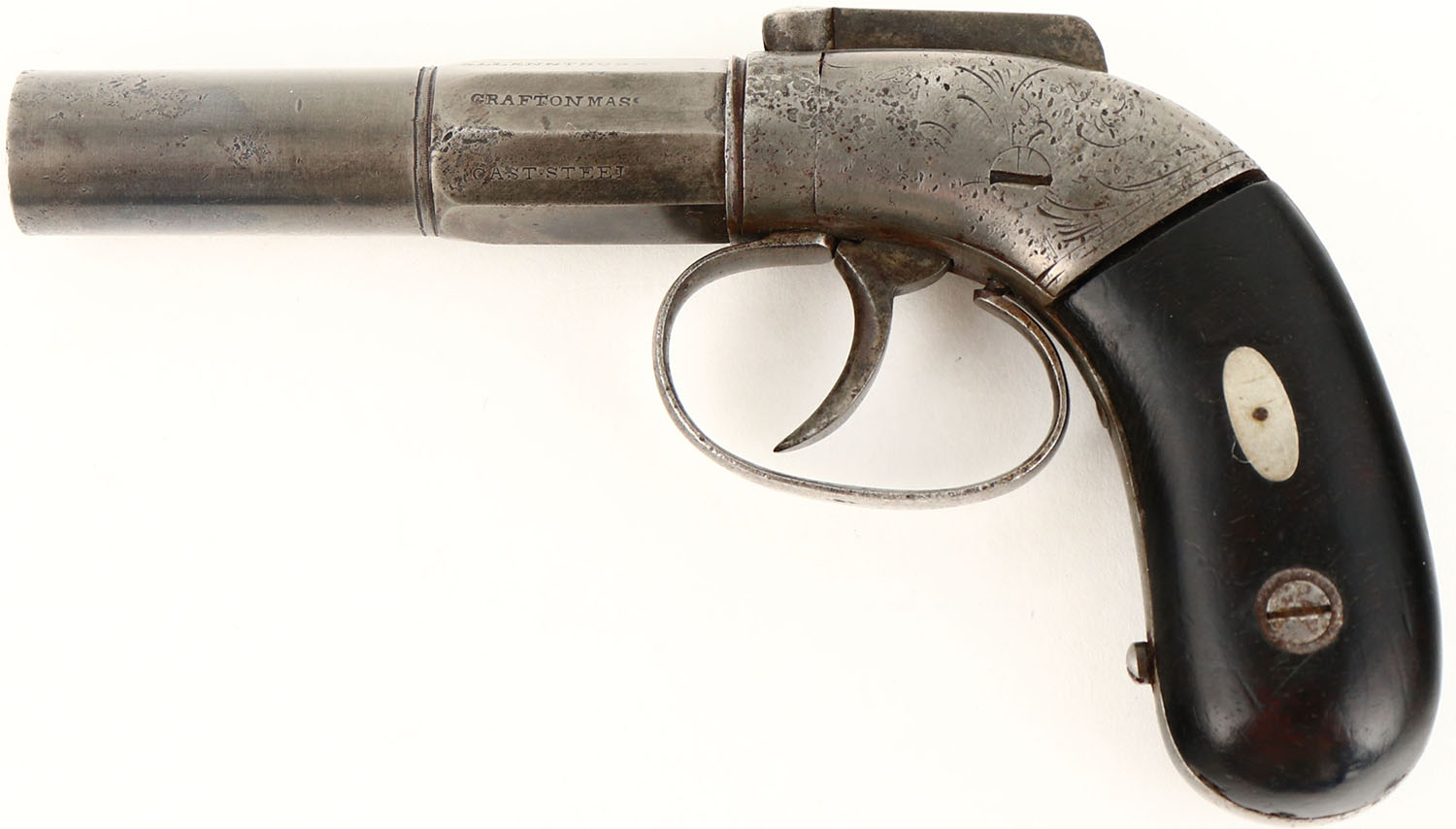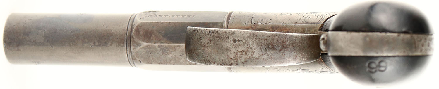 Allen & Thurber, Bar Hammer Pistol -2nd Version, CAL: 36, MFG: 1837-42, SN: 30 (barrel, frame & grips), Single Shot Percussion Revolver, 3'' half octagon half round screw-on barrel. The barrel flats are marked ''ALLEN & THURBER'', ''GRAFTON MASS'', ''CAST STEEL'', & ''30'' (full SN). The full Sn can be found on the barrel, inside frame & both grips. The pistols from the Grafton period have the typical angled ''quick drop'' grip with walnut wood & an oval silver inlay. They have the Double Action system from the 1837 patent, which can be observed from the very low positioned tension screw at the bottom of the grip. Although the production of the Bar Hammer pistol was very limited in the Grafton period, it was long enough to distinguish 2 variations. First version: The grip has a wide back strap of 1/2", just like the Tube Hammer. The wooden grips are not held in position by a pin. Second version: The back strap is narrow (1/4") and has pins to hold the wooden grips in position. This narrow back strap design remained in production on all other models without changes. (bpgcollector.com). The original wood grips with inlaid silver plates are very good & solid. There are numerous light scratches & scrapes to the finish. ''66'' is stamped into the bottom of the right grip. We are unsure as to what ''66'' represents, as ''30'' (SN) is marked on the inside of both grips. The original metal blue finish rates 10%, mostly worn to metal gray & toned to a brown patina. The frame is engraved with simple floral scroll patterns. The engraving has worn thin over time. Bore is good, with consistent roughness & light pitting. No sights. These firearms would've been intended for use as a concealable self-defense pistol in the mid-19th Century & also a favorite of miners during the gold rush. Antique, No FFL Req. - Value: 400 to 800