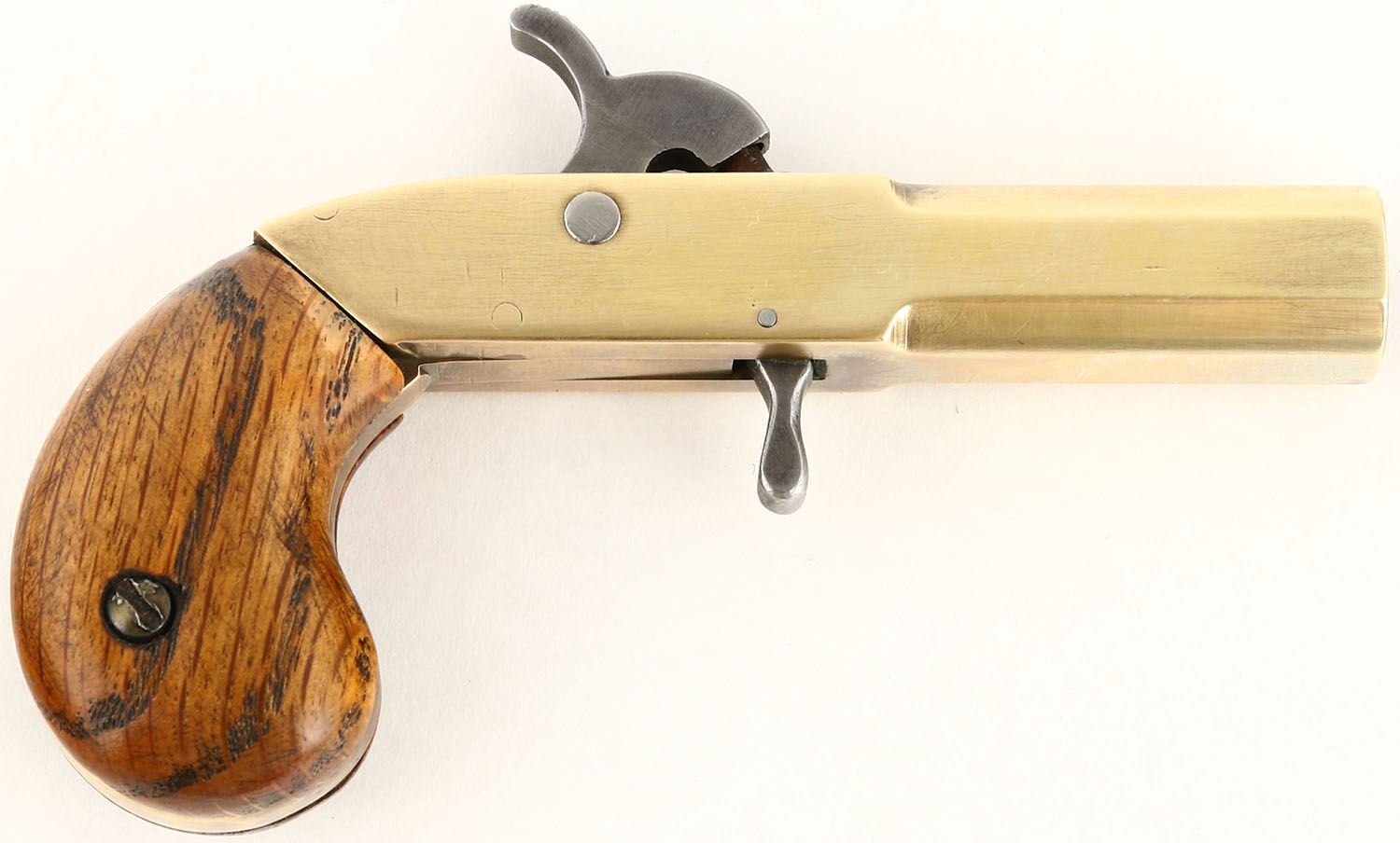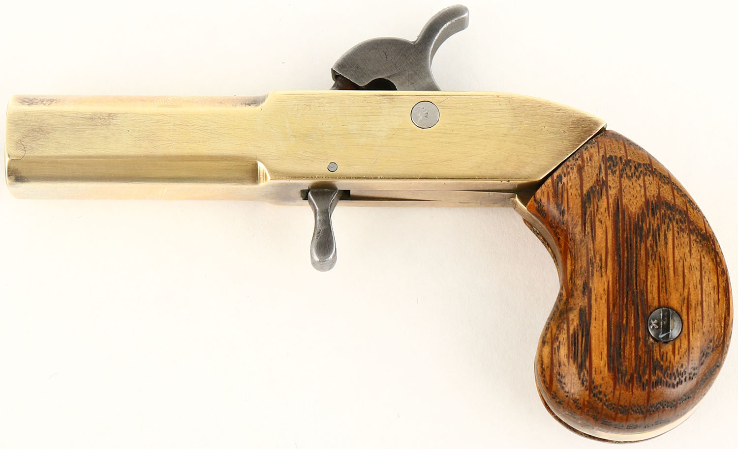 Unknown Maker, Percussion Single Shot Pistol, CAL: 44?, MFG: N/A, SN: NONE, 2'' barrel. The wood grips are very good, with scrapes & light handling wear. The one-piece brass frame is very good & bright, with some discoloration in protected areas. Bore is good, no rifling, some roughness. No sights. Black powder, No FFL Req. - Value: 50 to 100