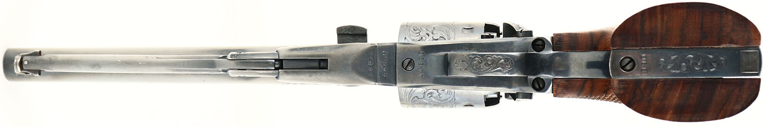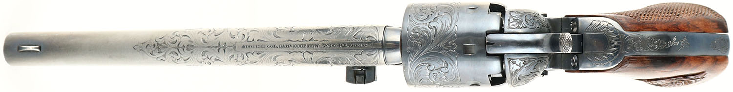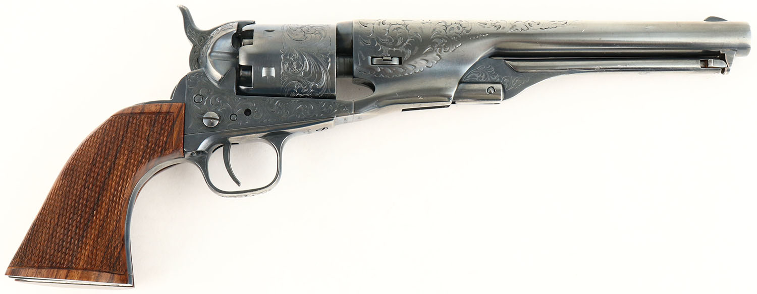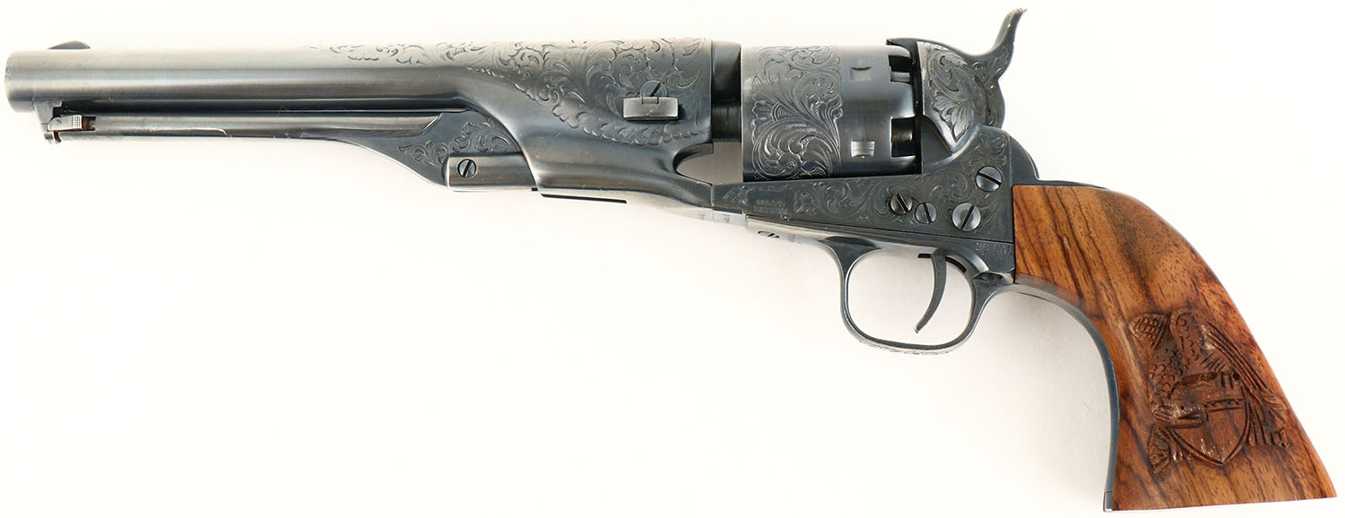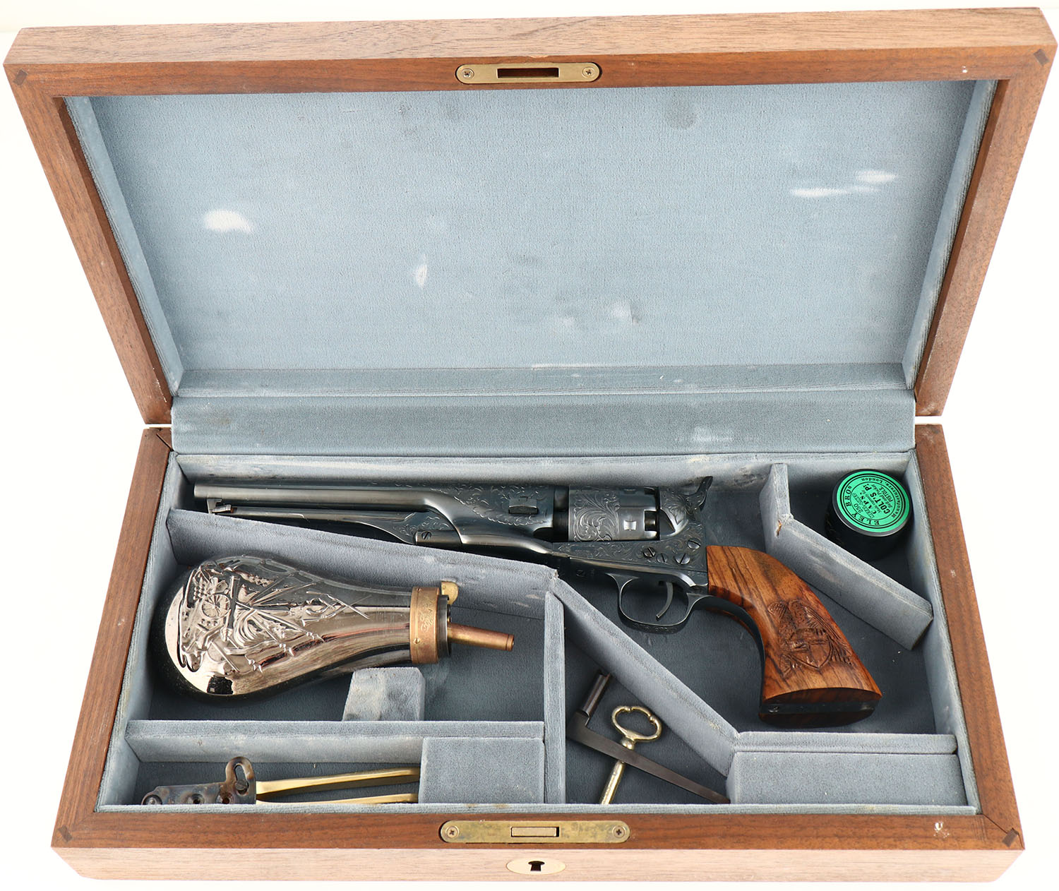 CASED, Colt Black Powder Arms Co., 1861 Navy, 3rd Gen - General Custer Special Edition, CAL: 36, MFG: Modern, SN: 45752, Percussion Single Shot Revolver, 7 1/2'' barrel. This revolver has been fully & expertly restored. The top of the barrel is marked ''ADDRESS SAM L COLT NEW-YORK U.S AMERICA''. The checkered & carved wood grips are excellent, having been lightly sanded & refinished. The restored blued finish is excellent. In preparation for the reblue process, some of the engravings are thin from polishing. All matching SN on the frame, barrel, trigger guard & butt. Bore is very good, with frost/haze. V-notch rear sight on hammer & small blade front sight. Comes in a Colt marked wood case, with powder flask, cap tin, tool, bullet mould & key. Black Powder, No FFL Req.