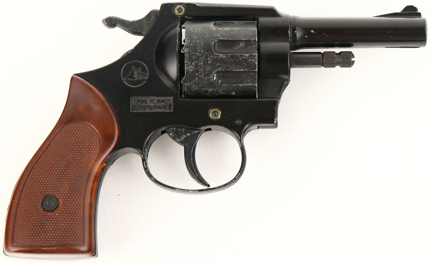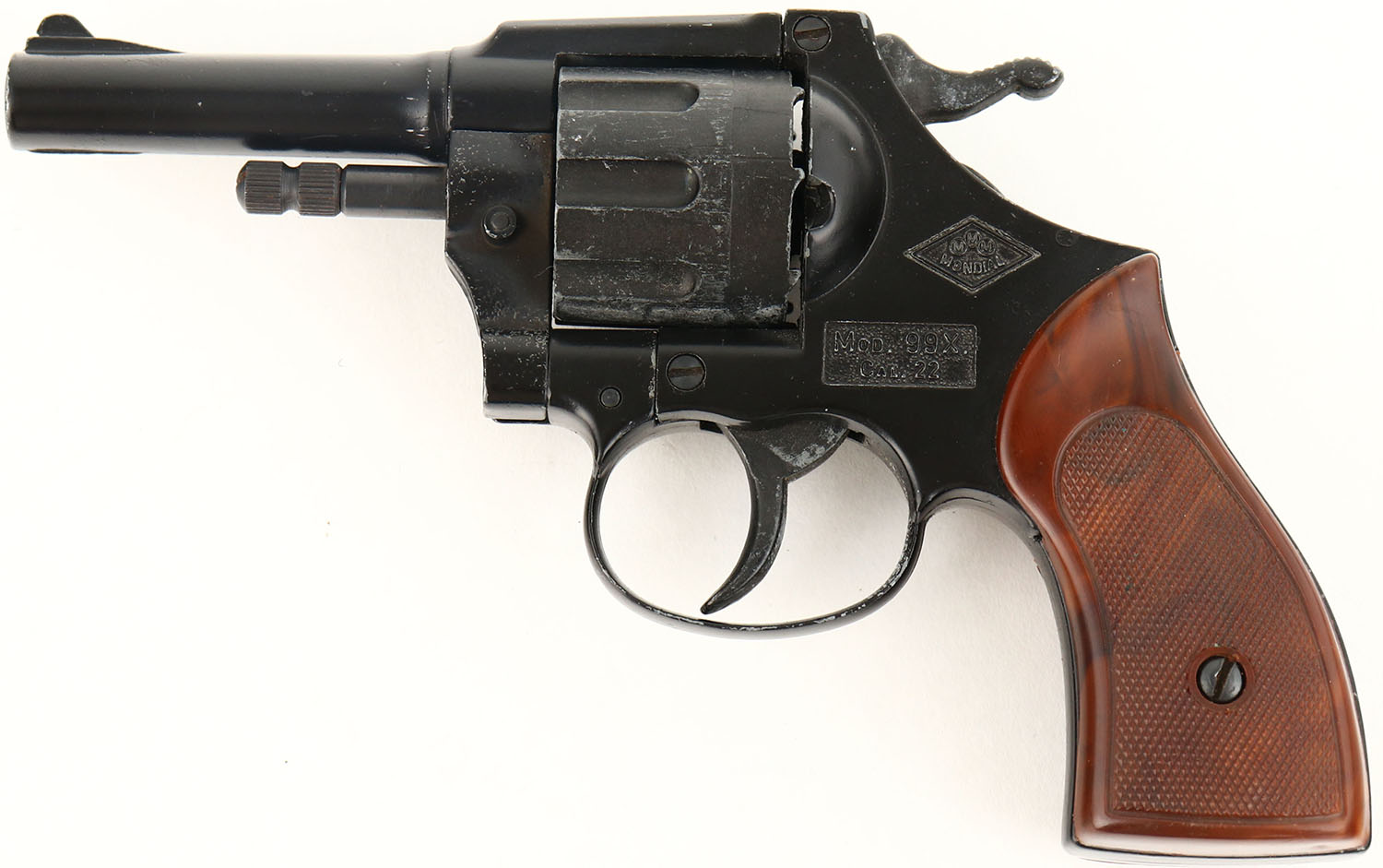 Mondial, Model 99X Starter/Blank Pistol, CAL: 22, MFG: N/A, SN: NSN, Double Action Revolver, No barrel. The checkered plastic grips are excellent. The black finish rates 90% overall, with concentrated wear tot the cylinder. No bore. Small blade front sight. Blank Gun, No FFL Req. - Value: 40 to 80