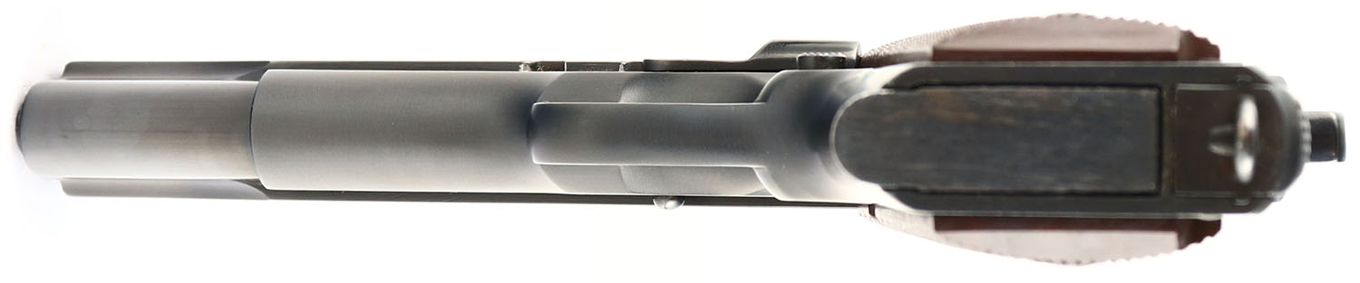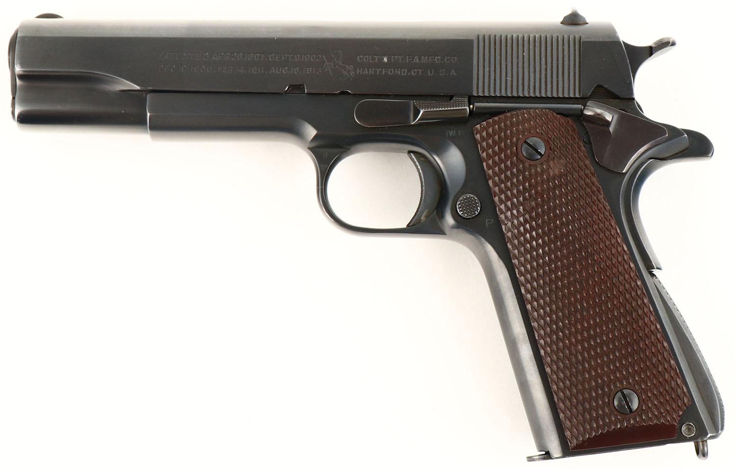 Colt, Model: M1911A1, ''UNITED STATES PROPERTY''. Cal: .45 ACP, MFG: 1942, S/N: 785071, Semi-auto pistol, 5'' barrel. A WWII military pistol. The inspector stamp of W.B. is for Colonel Waldemar S. Broberg. He was the Army Inspector of Ordnance from July 1st, 1941 to June 16th, 1942 in the Hartford/Springfield Ordnance District. This pistol is part of the last batch he approved his last month. The gun is also right during the transition era of when the finish went from ''Brushed Blue'' to being parkerized. The ''Coltwood'' plastic grips are excellent & sharp. The rearsenaled metal blue finish rates 99% overall. The darker tone on the front 1/3 of the slide is from that part being hardened to help increase its strength, leading to the metal holding onto the bluing better than the un-hardened section. The left side of the slide is marked with Colt's patent dates, the Rampant Colt logo, & ''COLT'S PT.F.A.MFG.CO.'', ''HARTFORD.CT.U.S.A.''. The right side of the frame is marked ''UNITED STATES PROPERTY'', ''M1911A1 U.S. ARMY'', the S/N, & a ''74'' on the trigger guard. The left side of the frame is marked with the ''WB'' inspector stamp by the slide catch. There is a ''P'' mark by the mag release button, which is just a basic proof mark. The left side of the trigger guard is marked with a ''8'', & a ''VP'' in a triangle stamp, which is the Colt verified proof factory inspection stamp. The bore is excellent, bright & mirror like. The slide holds the small half moon blade front sight, with a U-notch rear sight. Pistol comes with a single blued mag. An overall excellent example of a WWII U.S. Property Colt & one of the last blued M1911's for the military. FFL or C&R Req. - Value: 1500 to 2500