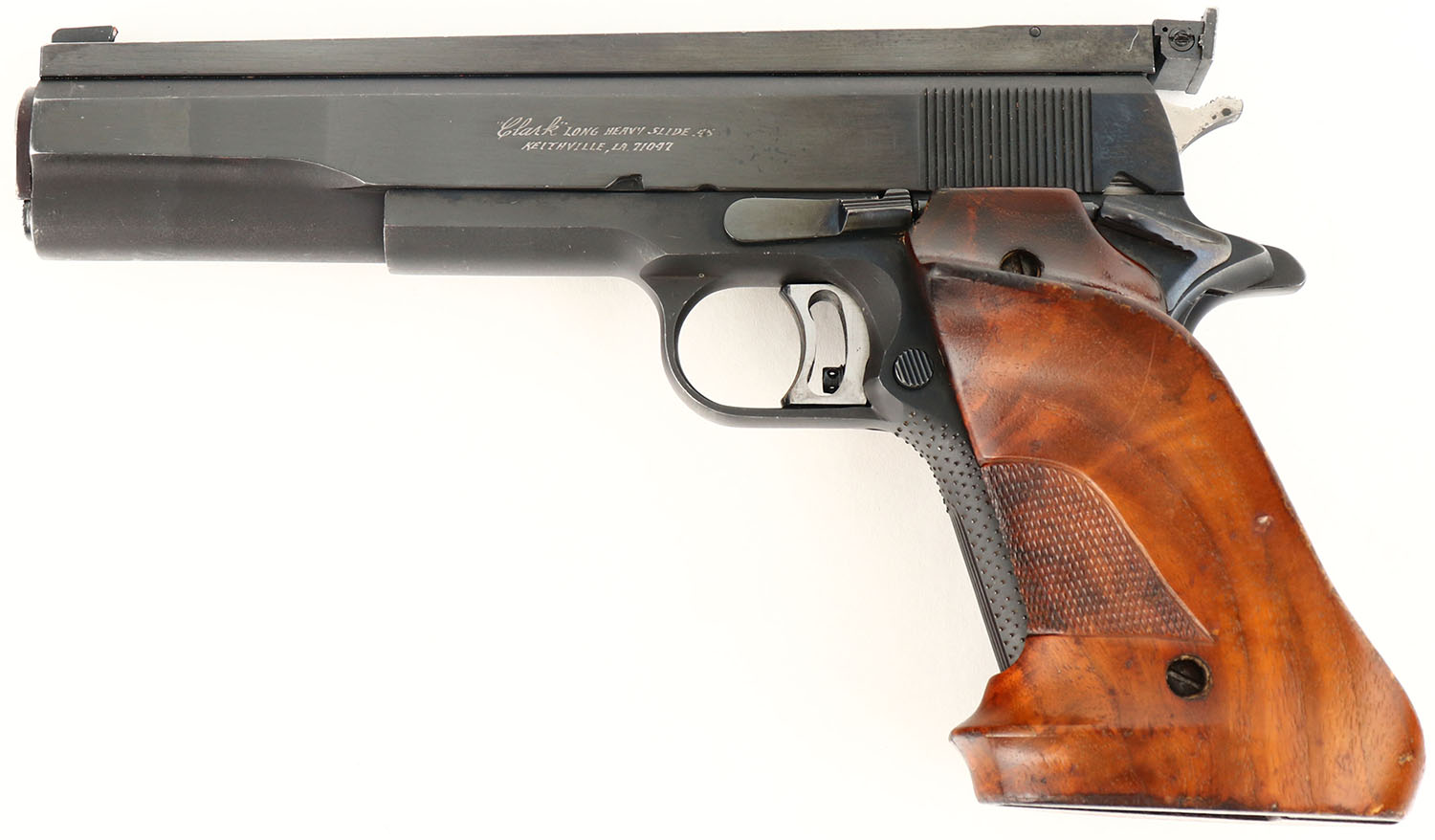 CUSTOM TARGET PISTOL, Colt/Jim Clark, 1911, CAL: 45 ACP, MFG: 1978, SN: 70N51773, Semi-Auto Pistol, upgraded 6'' barrel. This custom target pistol is compiled from a Gold Cup National Match frame & a Jim Clark heavy long slide. The left side of the slide is marked ''CLARK LONG HEAVY SLIDE .45 KEITHVILLE, LA 71047''. The checkered target wood grips are very good. There are contusions, dings, scrapes & areas of flaking finish. The metal blue finish rates 95% overall. Bore is excellent, with visible light wear. The BO-MAR rib holds an adjustable rear sight & blade front sight. Stippled front strap. FFL Req. - Value: 1500 to 2500