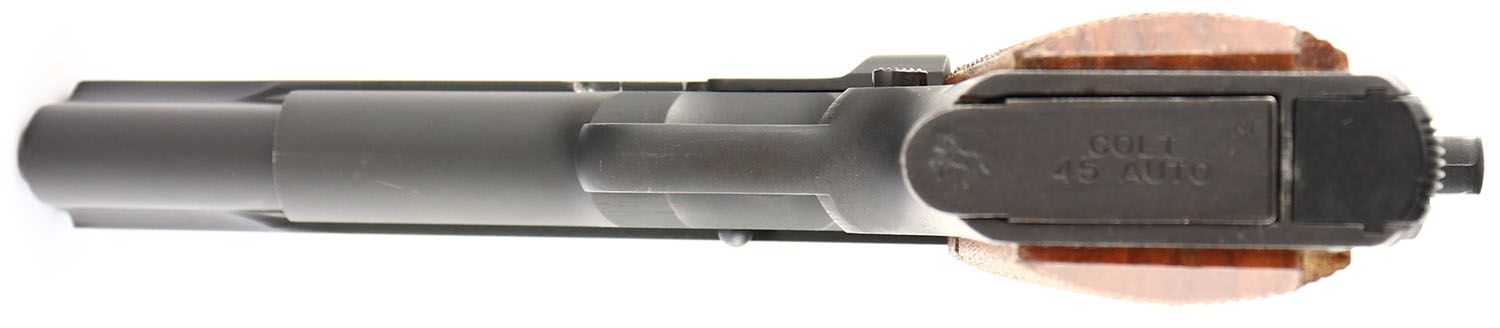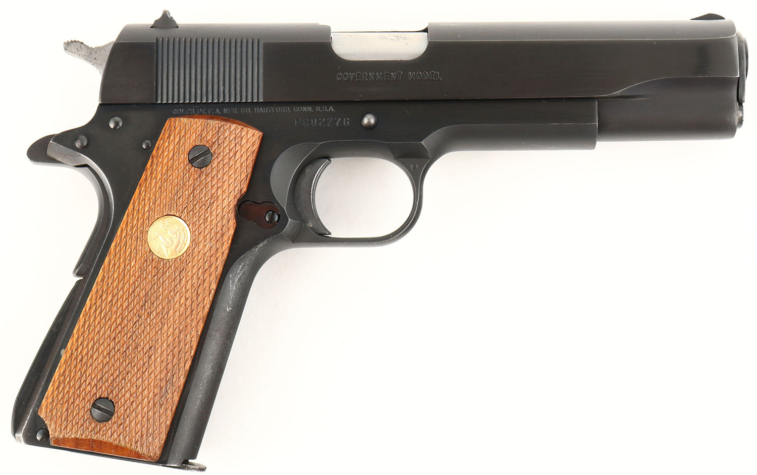 Colt, MK IV Series 80 Government Model, CAL: 45 ACP, MFG: 1988, SN: FG82276, Semi Auto Pistol, 5'' barrel. The Colt logo medallion checkered wood grips are excellent. The original two-tone metal blue & matte finish rates 98% overall. Bore is excellent. Fixed square notch rear sight & small blade front sight. Comes in aftermarket hard case, with extra magazine. FFL Req. - Value: 800 to 1200