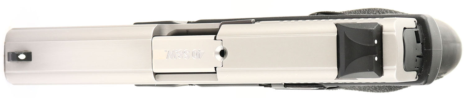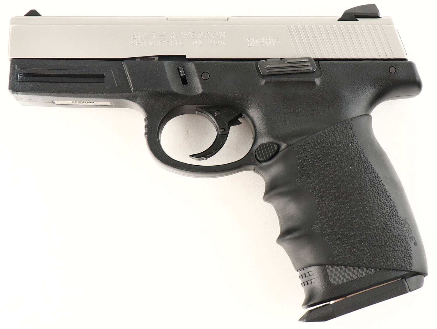 BOXED, Smith & Wesson, Model SW40VE, CAL: 40 S&W, MFG: Modern, SN: PBV5247, Semi Auto Pistol, 3 7/8'' barrel. The checkered polymer grip frame is excellent. The grip has a Hogue stippled rubber grip sleeve. The stainless steel finish on the slide is very good. There are light scrapes, scratches & handling marks. Bore is excellent. Factory contrast sights. Comes in factory hard case, with related paperwork, extra mag & test fire cartridge. FFL Req. - Value: 150 to 300