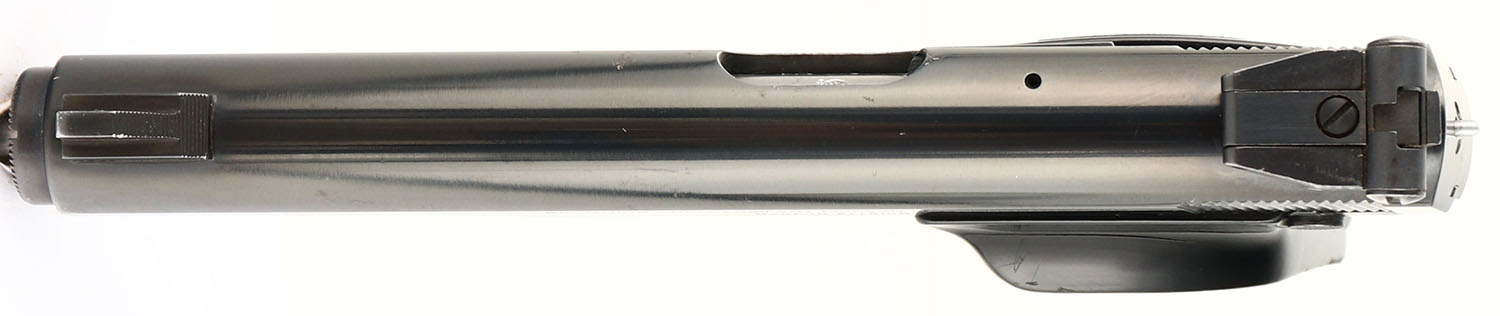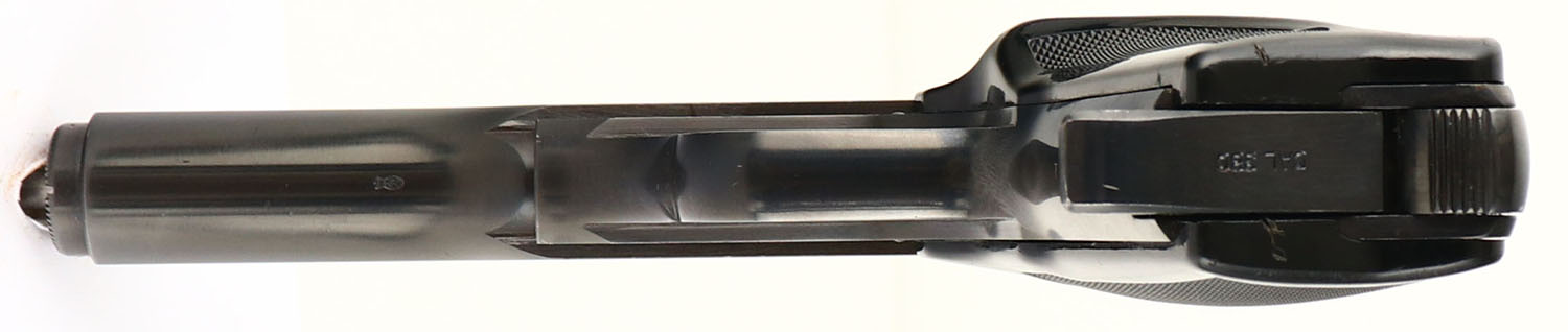 FN Browning, Model 10/71, CAL: .380, MFG: 1972, SN: 72N22253, Semi Auto Pistol, 4 1/2'' barrel. The original Browning checkered plastic grips are excellent. There are handling marks, scrapes & a couple dings. The original metal blue finish rates 97%, with light wear to sharp edges & a couple spots of light speckling. Bore is excellent. Adjustable rear sight & serrated blade front sight. Comes in black leather, red velvet lined Browning soft case, with owners manual. FFL Req. - Value: 400 to 650