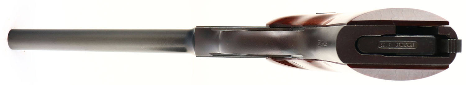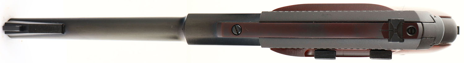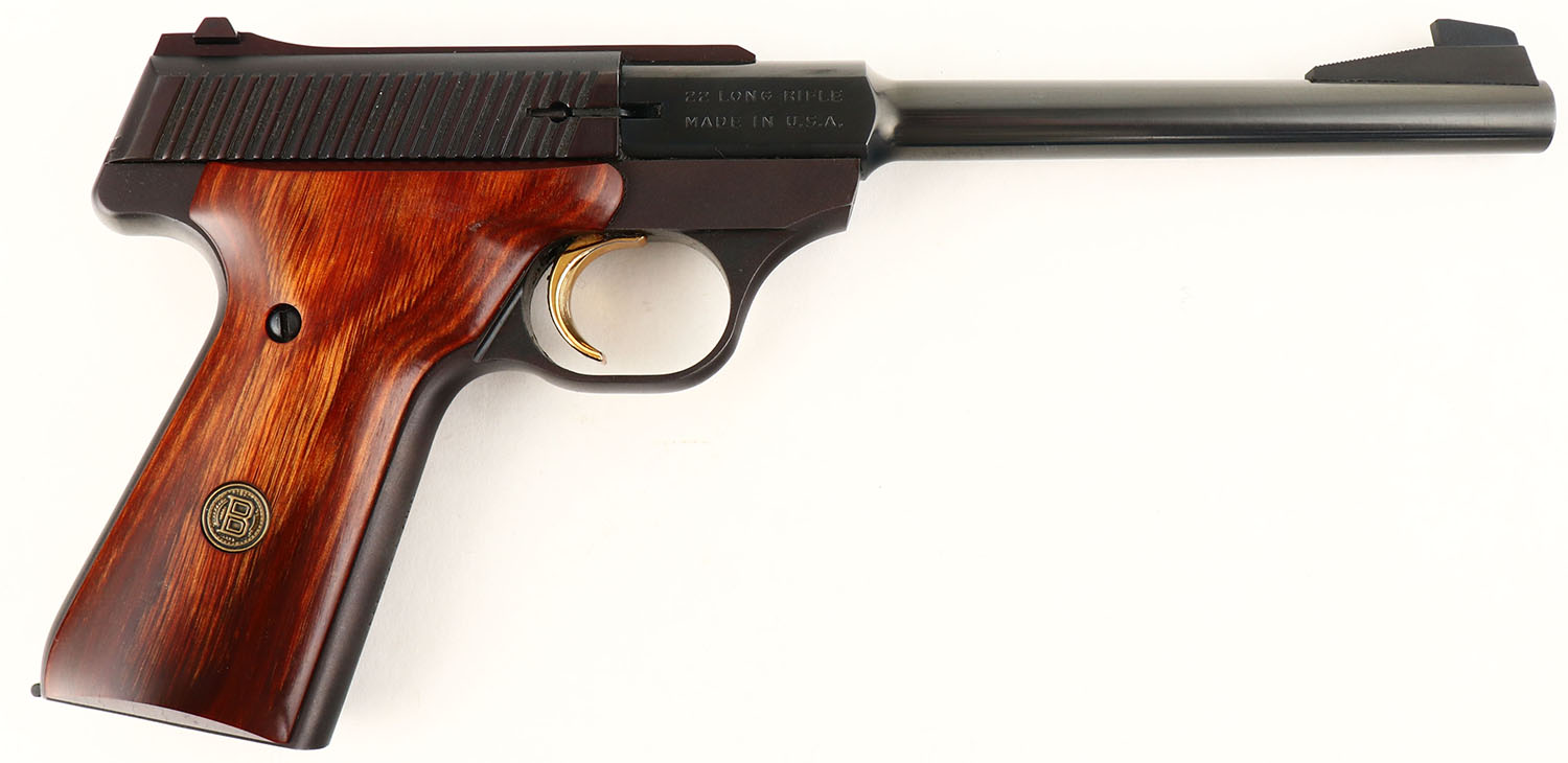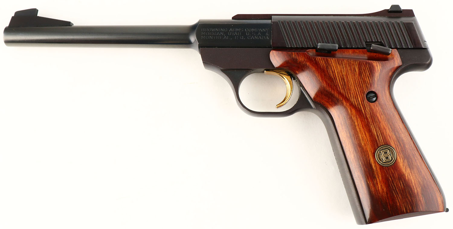 SOFT CASED, Browning, Challenger II, CAL: 22LR, MFG: 1977, SN: 665RR09780, Semi Auto Pistol, 6 3/4'' barrel. The Browning logo medallion wood grips are excellent. The gloss finish is excellent. The original metal blue finish rates 99%+ overall. The frame, slide & sight rib have toned plum. Gold tone trigger. Adjustable rear sight & ramp elevated blade front sight. Comes in black leather, sherpa lined Browning soft case. FFL Req. - Value: 400 to 600