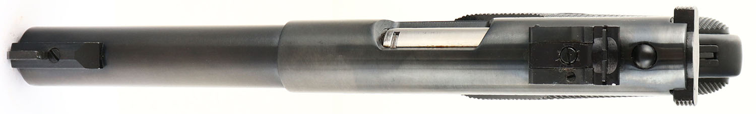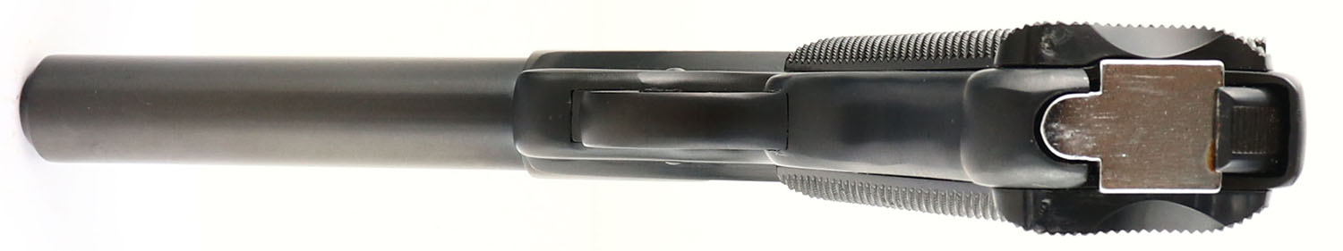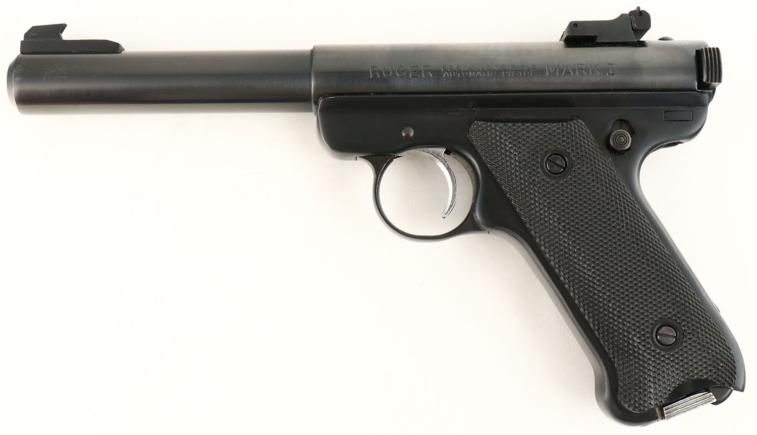 Ruger, Mark I, CAL; 22LR, MFG: 1977, SN: 14-25155, Semi Auto Pistol, 5 1/2'' bull barrel. The Ruger logo medallion checkered plastic grips are excellent. The metal blue finish rates 97% overall. Bore is excellent. Adjustable rear sight & elevated blade fornt sight. FFL Req. - Value: 200 to 400
