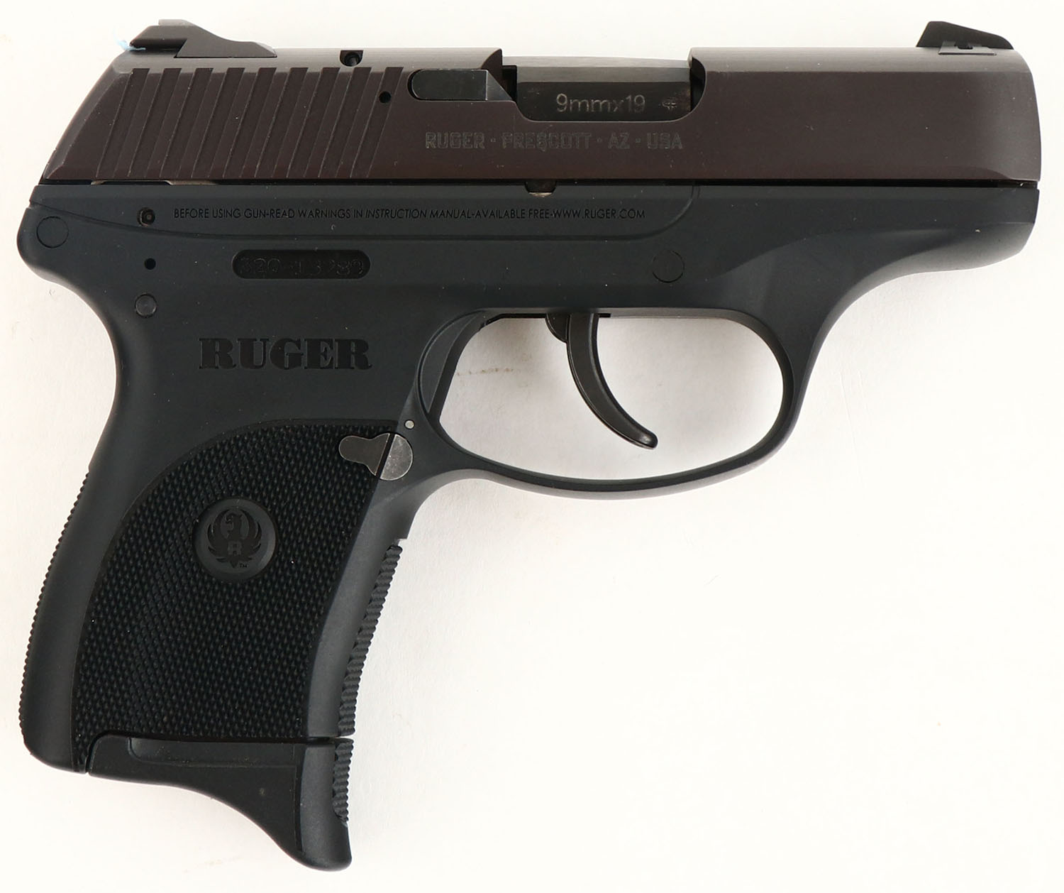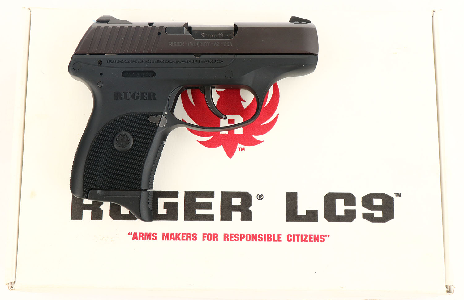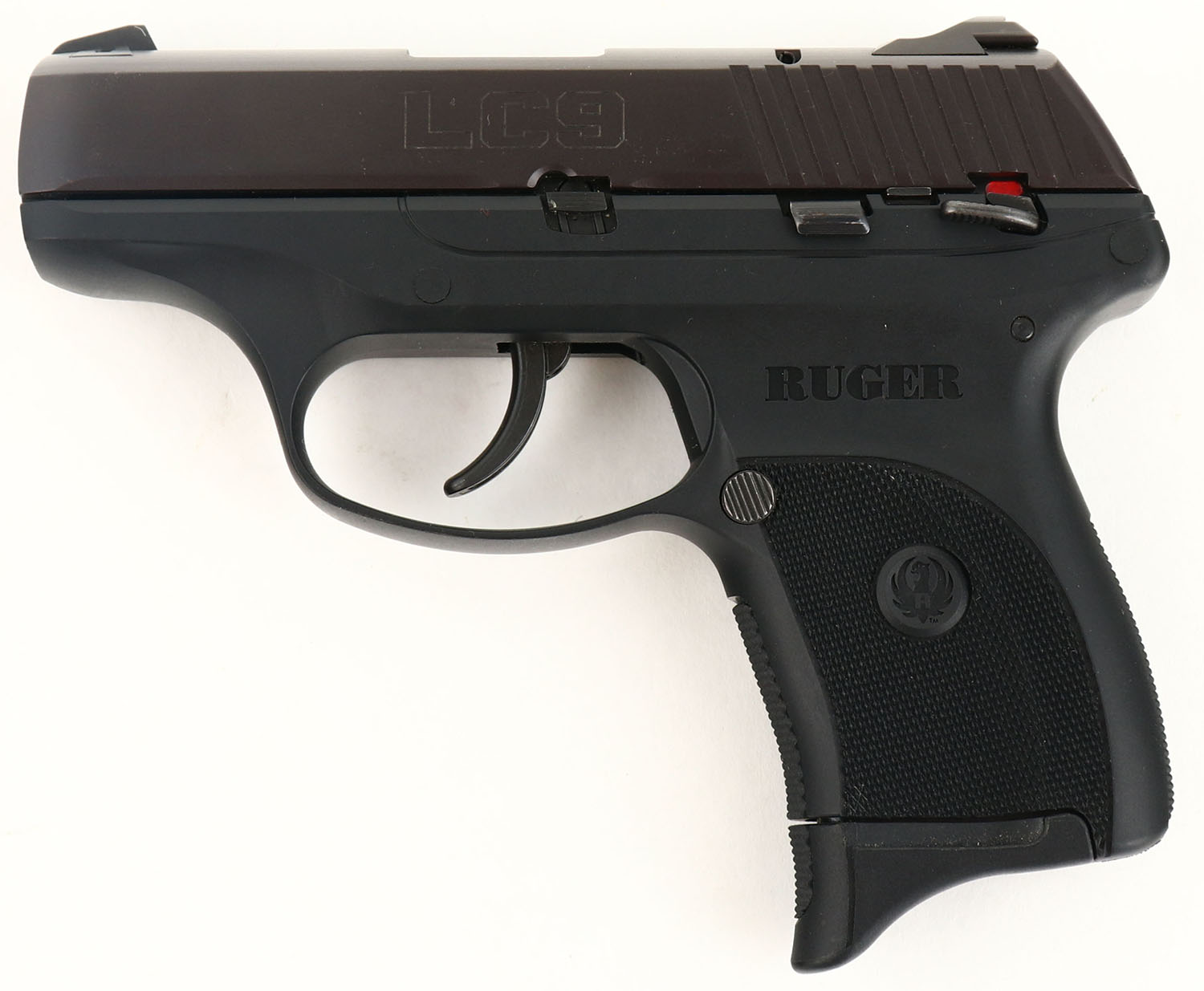 BOXED, Ruger, LC9, CAL: 9mm, MFG: Modern, SN: 320-13289, Semi Auto Pistol, 3'' barrel. The Ruger checkered polymer grip frame is excellent. The metal blue finish on the slide rates 99%, beginning to tone plum. Bore is excellent. Factory contrast sights. Comes in factory box, with related paperwork, soft case, extra mag, tools, lock/key & test fire cartridge. FFL Req. - Value: 250 to 400