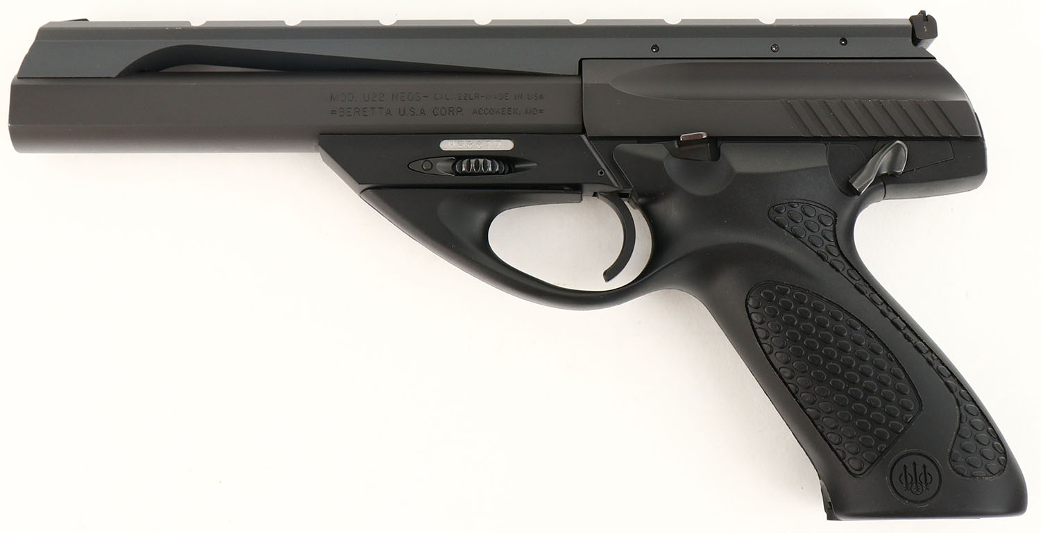 BOXED & CASED, Beretta, U22 NEOS, CAL: 22LR, MFG: Modern, SN: P98872, Semi Auto Pistol, 5 7/8'' barrel. The synthetic textured grip frame is excellent. The matte black finish on the barrel, slide & sight rail rates 99%. Bore is excellent. Adjustable rear sight & blade front sight. Comes in factory hard case, with lock & factory outer cardboard sleeve. FFL Req. - Value: 200 to 300