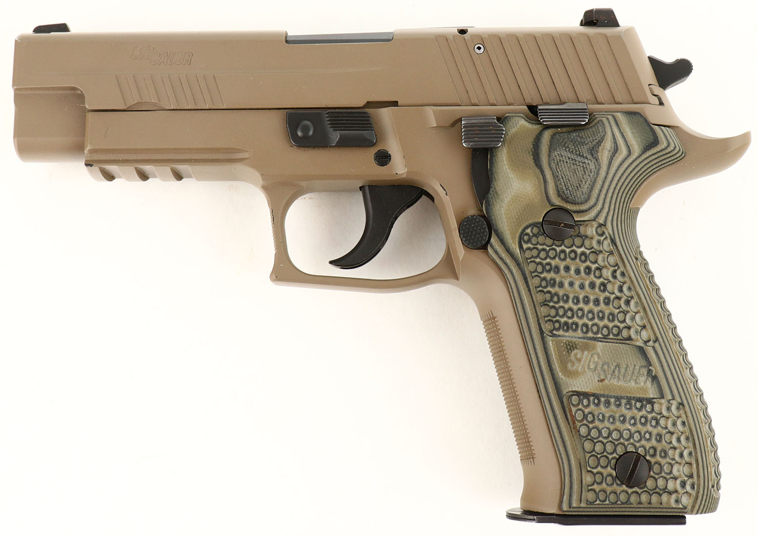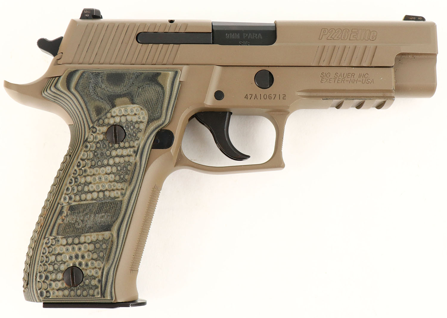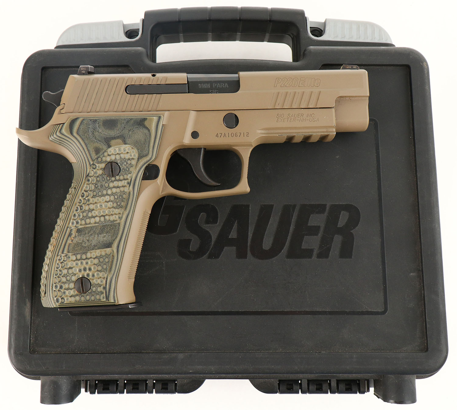 CASED, Sig Sauer, P226 Scorpion Elite, CAL: 9mm Para, MFG: Modern, SN: 47A106712, Semi Auto Pistol, 4 1/4'' barrel. The Hogue Extreme G10 aggressively scaled grips are excellent. The FDE finish rates 98%. Factory Siglite night sights. Picatinny rail. Comes in factory hard case, with (1) 10rnd mag & (1) 20rnd mag. MFG 2012 only. Reintroduced 2015 only. FFL Req. - Value: 750 to 1000
