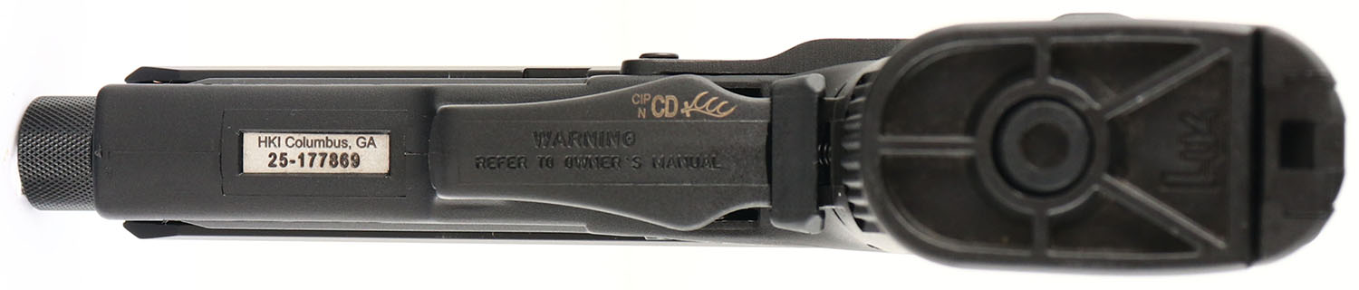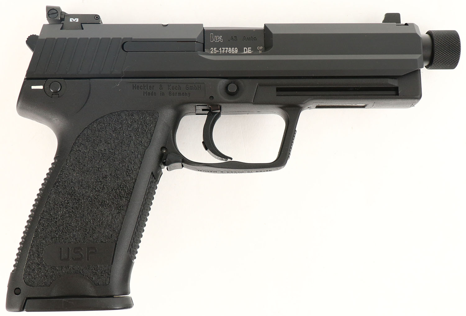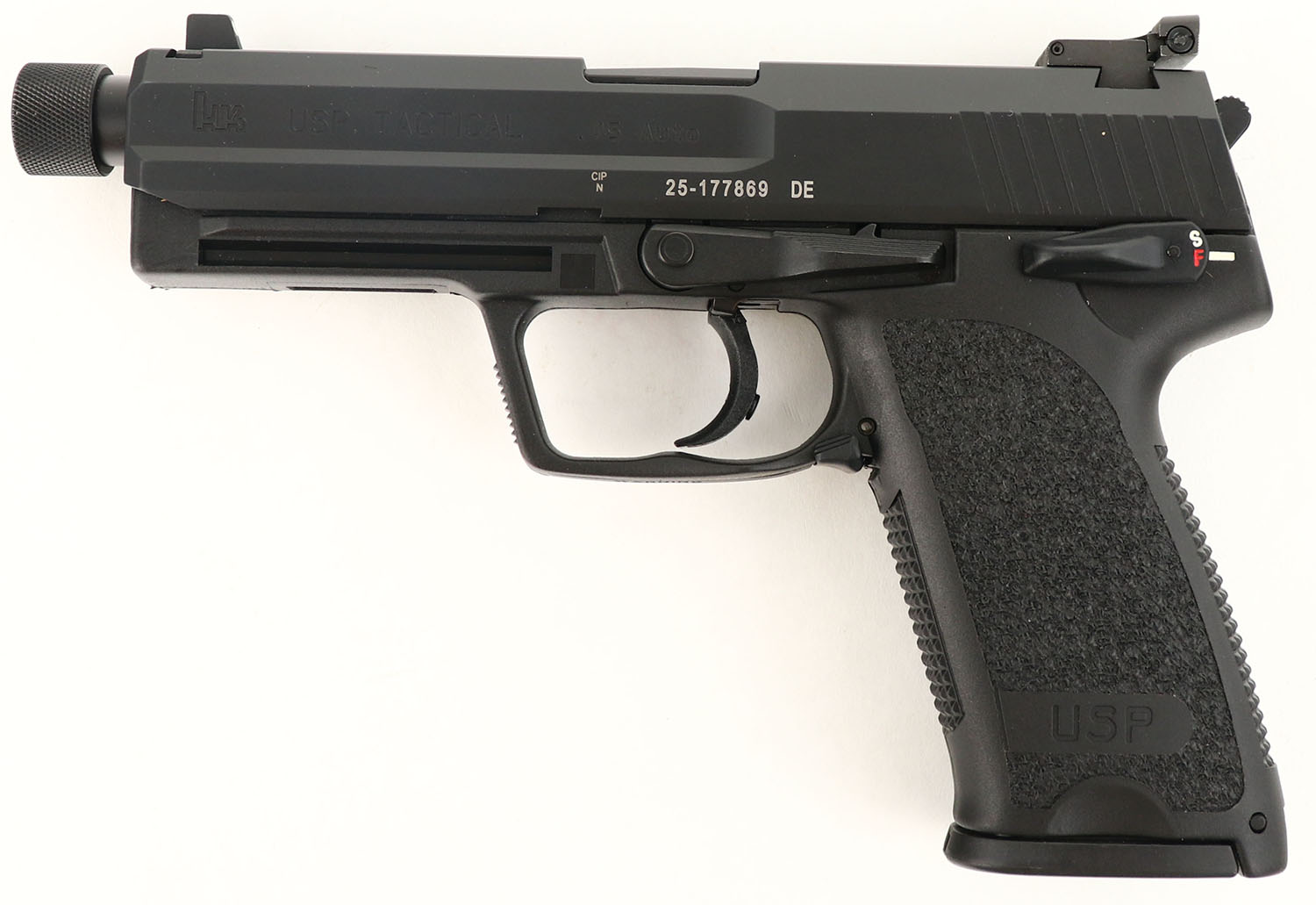 CASED, HK, USP Tactical, CAL: 45 Auto, MFG: Modern, SN: 25-177869, Semi Auto Pistol, 5'' barrel. The checkered & textured polymer grip frame is excellent. The matte black finish on the slide is mint. Bore is mint. Factory high-profile night sights. Threaded barrel. Comes in factory hard case, with related paperwork, O-rings, tools, & extra magazine. Essentially a NIB pistol. FFL Req. - Value: 1000 to 1500