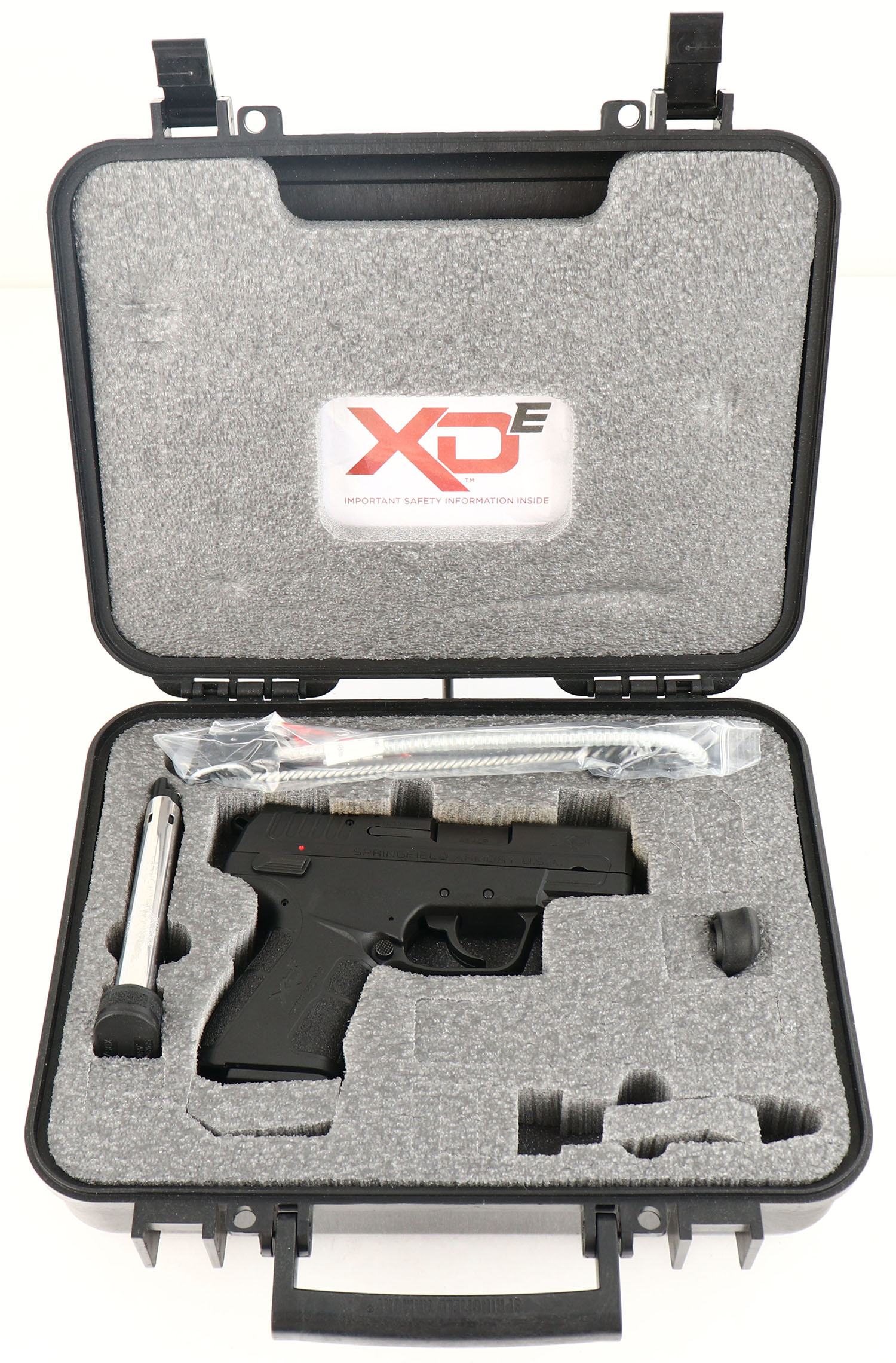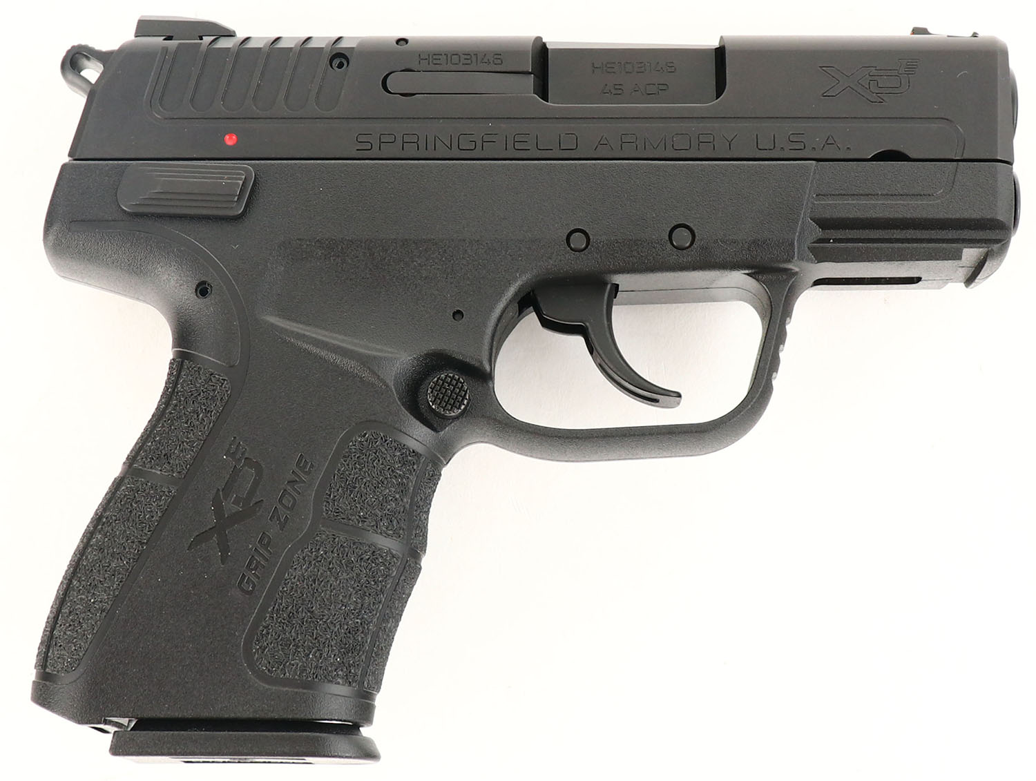CASED, Springfield Armory, Model XD-E3.3, CAL: 45 ACP, MFG: Modern, SN: HE103146, Semi Auto Pistol, 3 1/4'' barrel. The textured synthetic polymer grip frame is mint. The matte black Melonite finish on the slide is mint. Bore is excellent. Factory contrast sights. Comes in factory hard case with paperwork, extra mag, grip extension & lock/key. NIB. FFL Req. - Value: 300 to 500