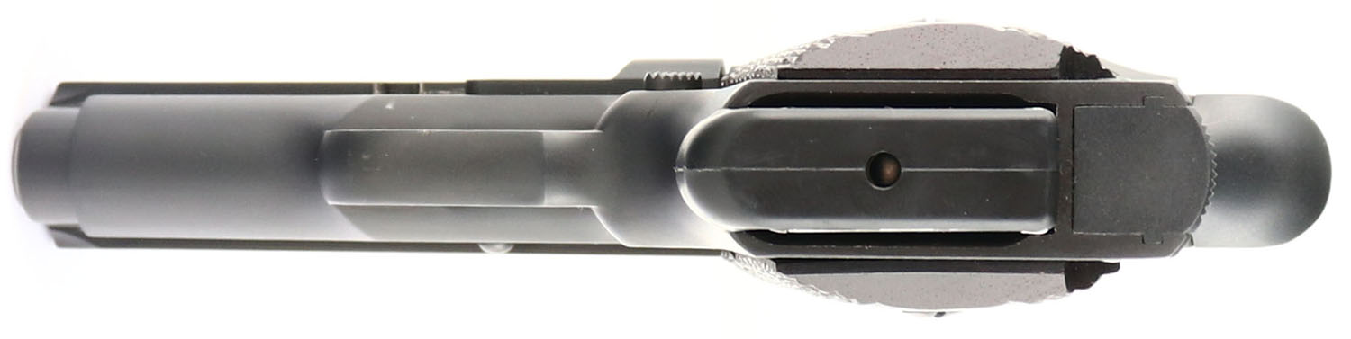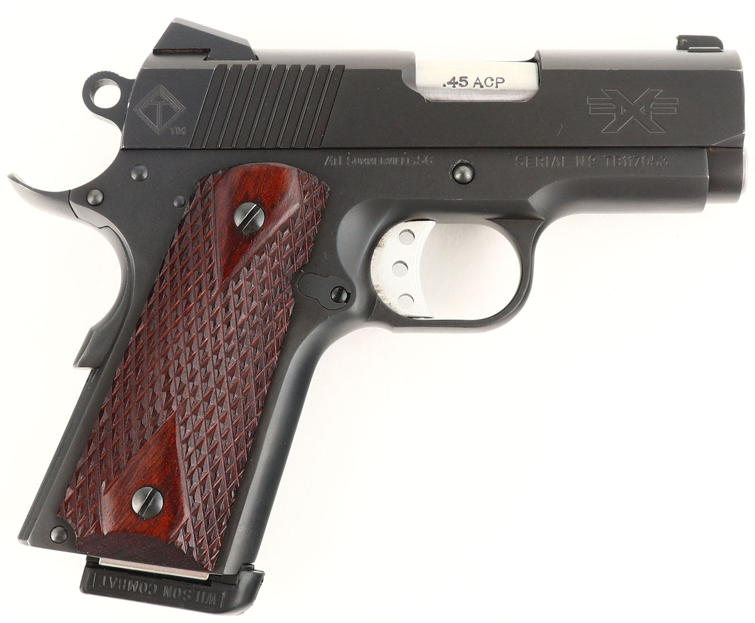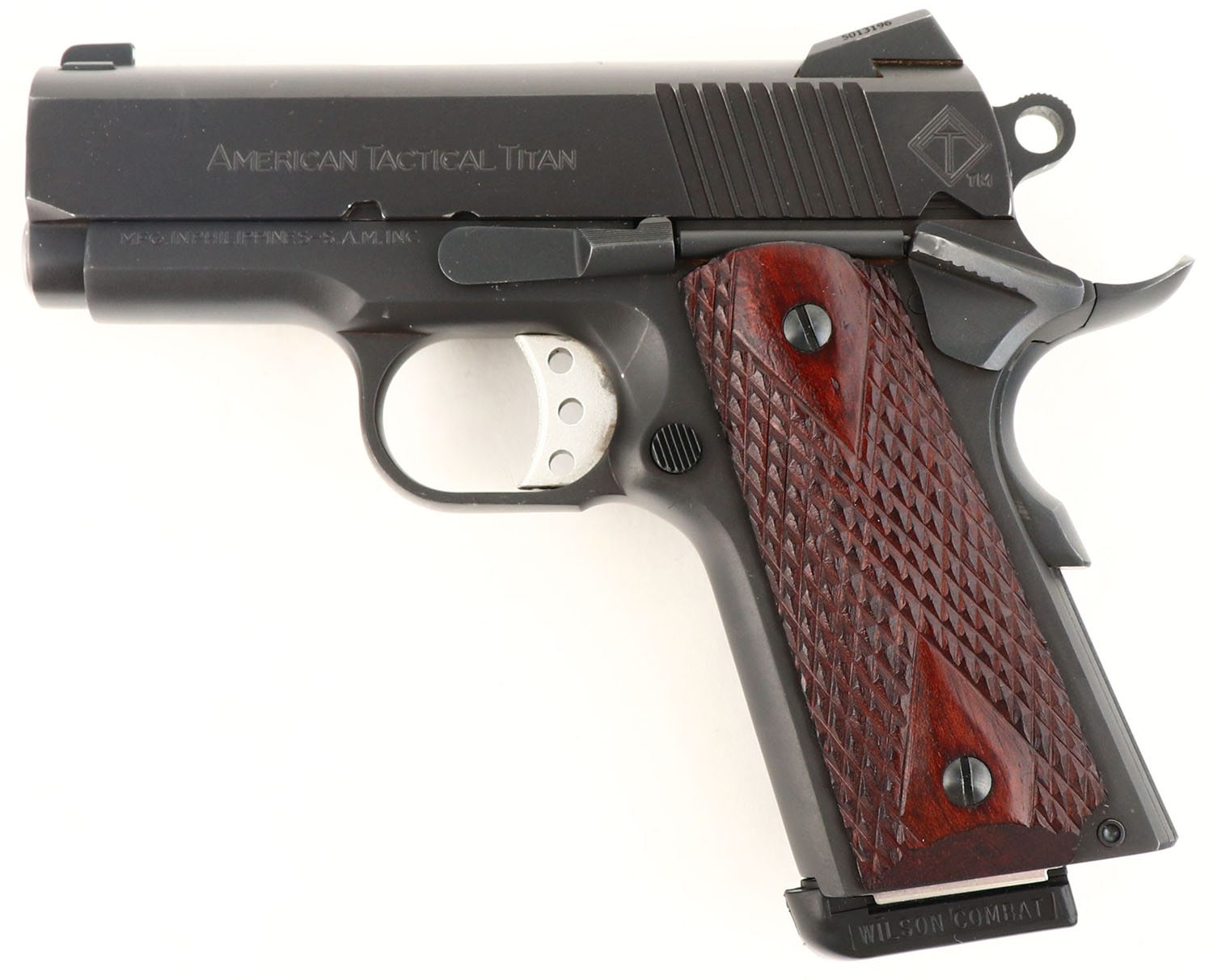 American Tactical (S.A.M. Inc), 1911 Titan Firepower Extreme Compact, CAL: 45 ACP, MFG: Modern, SN: TB117053, Semi Auto Pistol, 3 1/4'' barrel. The checkered wood grips are excellent. The matte black finish is excellent overall. Bore is excellent. Square notch serrated rear sight & white dot front sight. FFL Req. - Value: 350 to 450