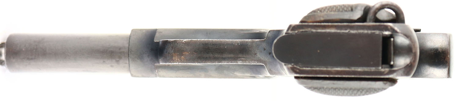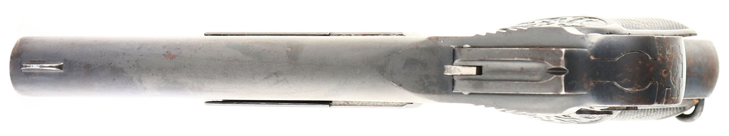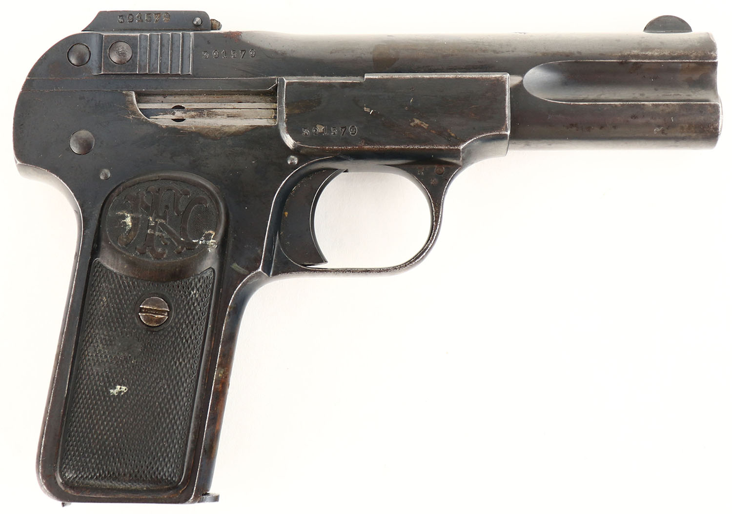 FN Belgium, M1900, CAL: 32 ACP, MFG: 1903-07, SN: 391579, Semi Auto Pistol, 4'' barrel. Standard markings on the left side of the slide & frame. Proofs on the frame, slide & left side of rear sight. Full SN can be seen on the right side of the frame, slide & right side of rear sight. The FN checkered plastic grips are very good & solid. There is a small hole in the ''FN'' of the left grip, along with minor contusions & scrapes. The original metal blue finish rates 60% on the barrel & 70% on the frame, with areas worn to metal gray & toned to a brown patina. Bore is good, with consistent roughness & thinned rifling. V-notch rear sight & blade front sight. FFL or C&R Req. - Value: 300 to 600