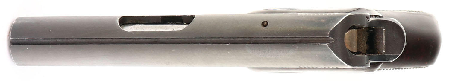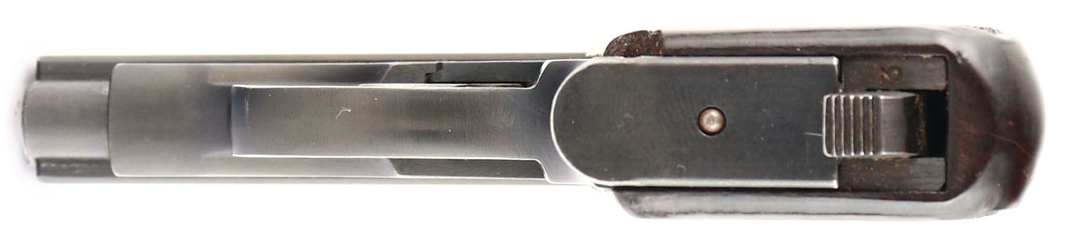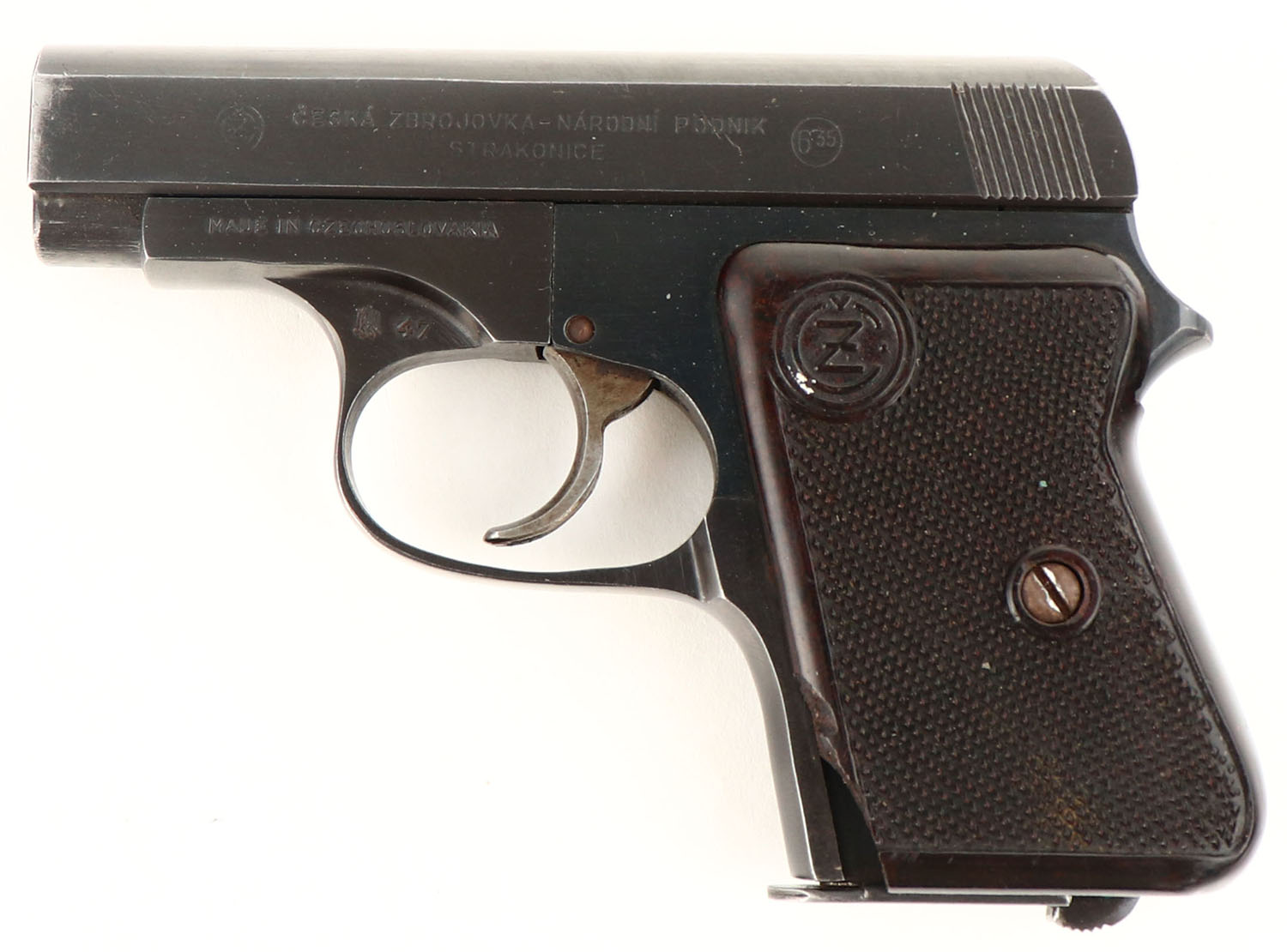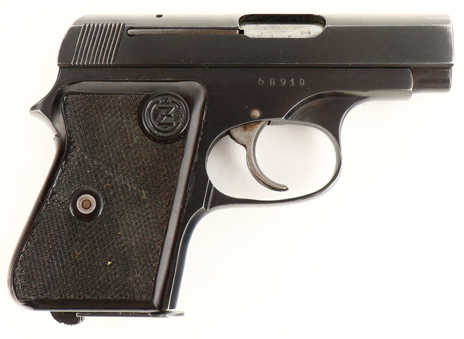 CZ, Model VZ45, CAL: 6.35 (25 ACP), MFG: 1947, SN: 58910, Semi Auto Pistol, 2 1/2'' barrel. The original CZ checkered plastic grips are good. The bottom front corner of the left grip has an edge chip & the right grip has a crack running from front to back strap. The original metal blue finish rates 90% on the barrel & 97% on the frame. Bore is excellent, with some visible light wear. Full length u-notch groove on the slide. FFL or C&R Req. - Value: 200 to 300