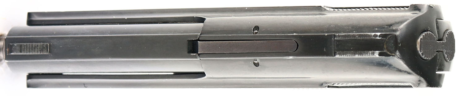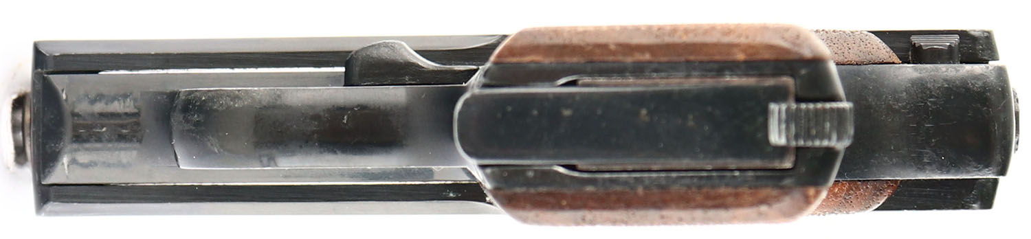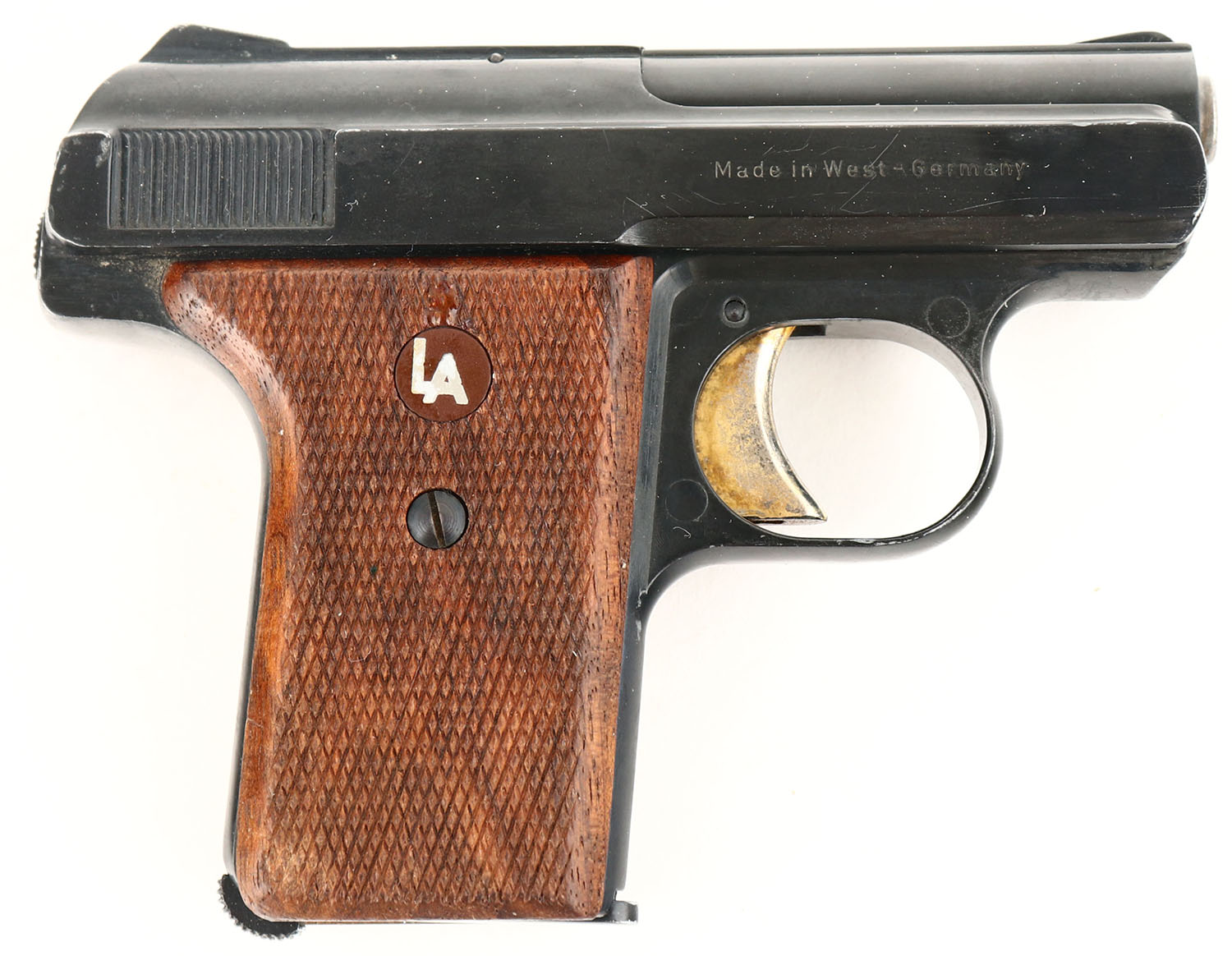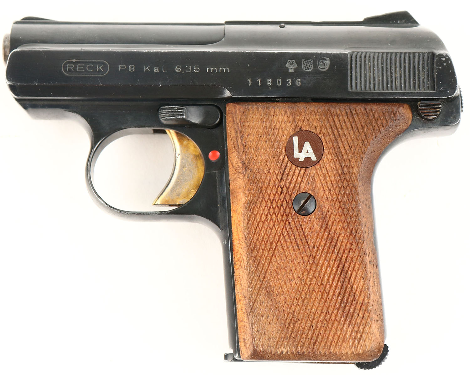 RECK (Germany), Model P8, CAL: 6.35mm, MFG: 1955-65, SN: 118036, Semi Auto Pistol, 2 1/4'' barrel. The LA medallion checkered grips are excellent. The original matte black metal finish is very good. There is edge wear, handling marks & some areas of hazy discoloration. Bore is excellent, with visible wear from use. Fixed sights. Gold tone trigger. FFL or C&R Req. - Value: 100 to 300