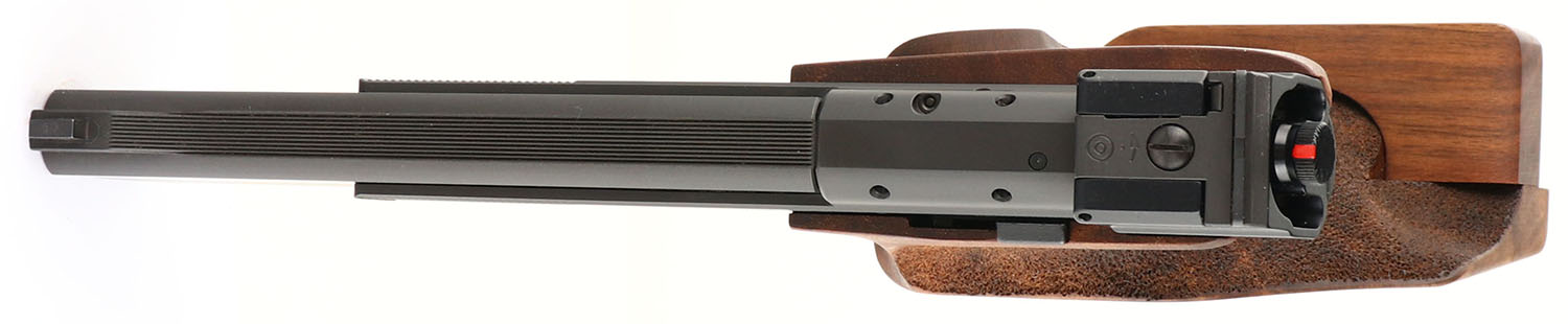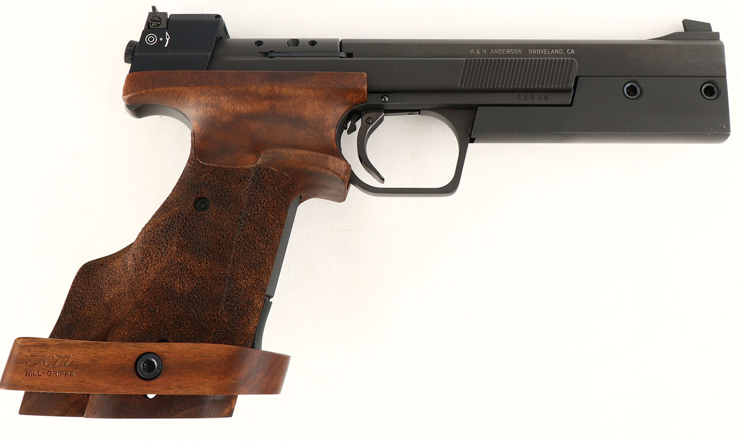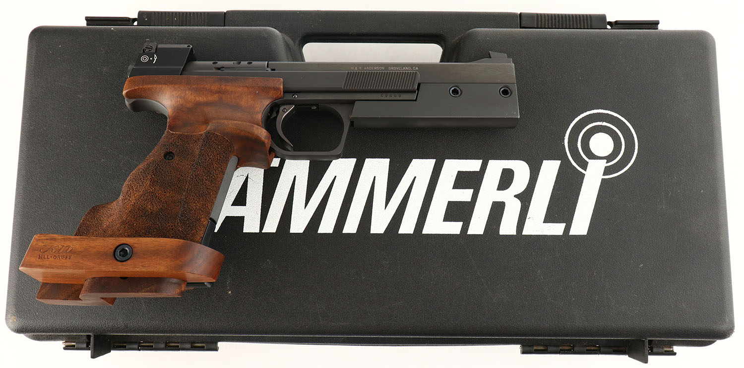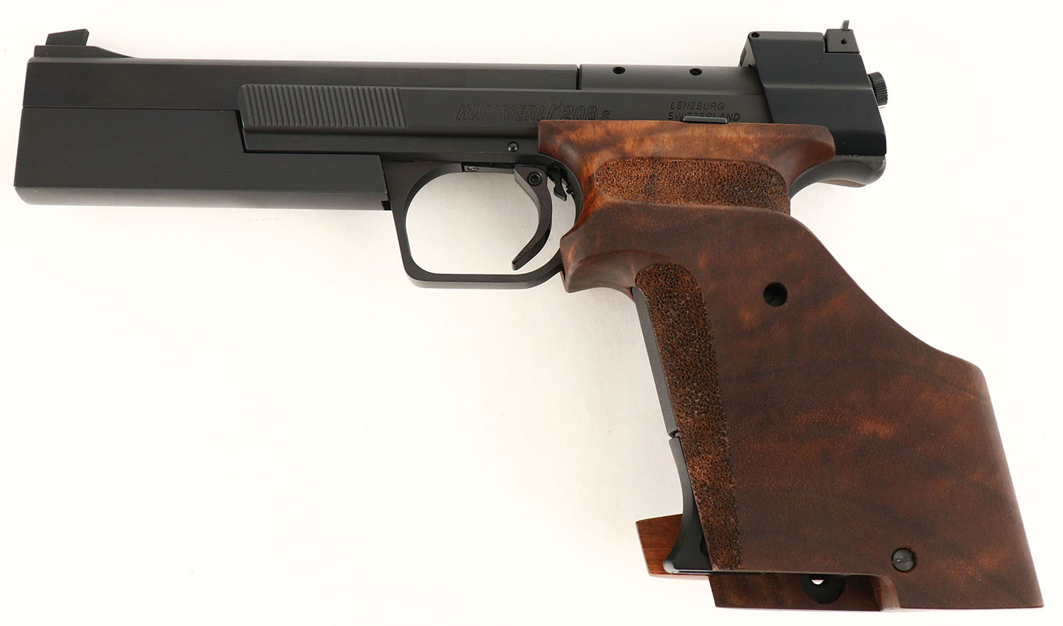 CASED, Hammerli, Model 208S, CAL: 22LR, MFG: 1988-2000, SN: 49609, Semi Auto Pistol, 5 3/4'' barrel. The original oversized ergonomic & textured target grips are excellent. The two-tone matte & blued finish rates 99% overall. Bore is excellent. Factory adjustable rear sight & ramp elevated blade front sight. Comes in factory hard case, with (3) extra mags, tools, weight & cleaning rods. FFL Req. - Value: 1200 to 1800