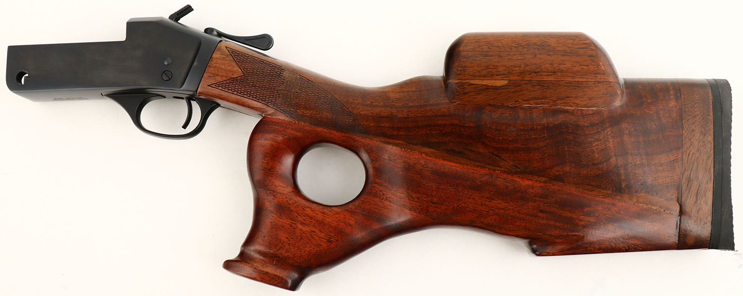 Henry Repeating Arms Company, Model HO15-223 Single Shot Frame, Caliber: 357 MAG/ .38SPL, MFG: Modern, SN: 223SSR02895, Break Action Single Shot Rifle Frame, The factory stock has been heavily custom modified, with the addition of a thumb hole pistol grip, an added block for increased length & an ultra high comb cheek piece. The stock has a solid recoil pad. Shoulders nicely. The individual who created this unusual configuration was quite the wood worker! Original frame blue rates 98%. Just need interchangeable barrels to make into numerous caliber options. FFL Req. - Value: 100 to 200