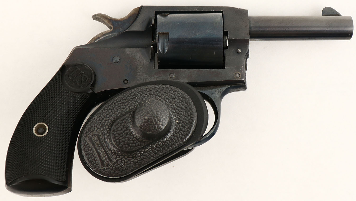 PARTS GUN, U.S. Revolver Co., Solid Frame 32, .32 cal. MFG: 1910-35, American Made, SN: 49189, Double Action Revolver, 2 1/2'' barrel. The U.S. monogram checkered hard rubber grips are excellent. The original metal finish on the barrel & cylinder rates 90%, 50% on the frame due to blue flaking & spotting turning to a brown patina. Case-hardened hammer, with good case-colors. Bore is very good, Notched rear & small blade front sights. Missing cylinder pin & possibly other parts, Has trigger guard lock on it without a key. GUNSMITH SPECIAL, This pistol is being sold ''AS-IS'', with NO RETURNS. FFL or C&R Req. - Value: 10 to 50